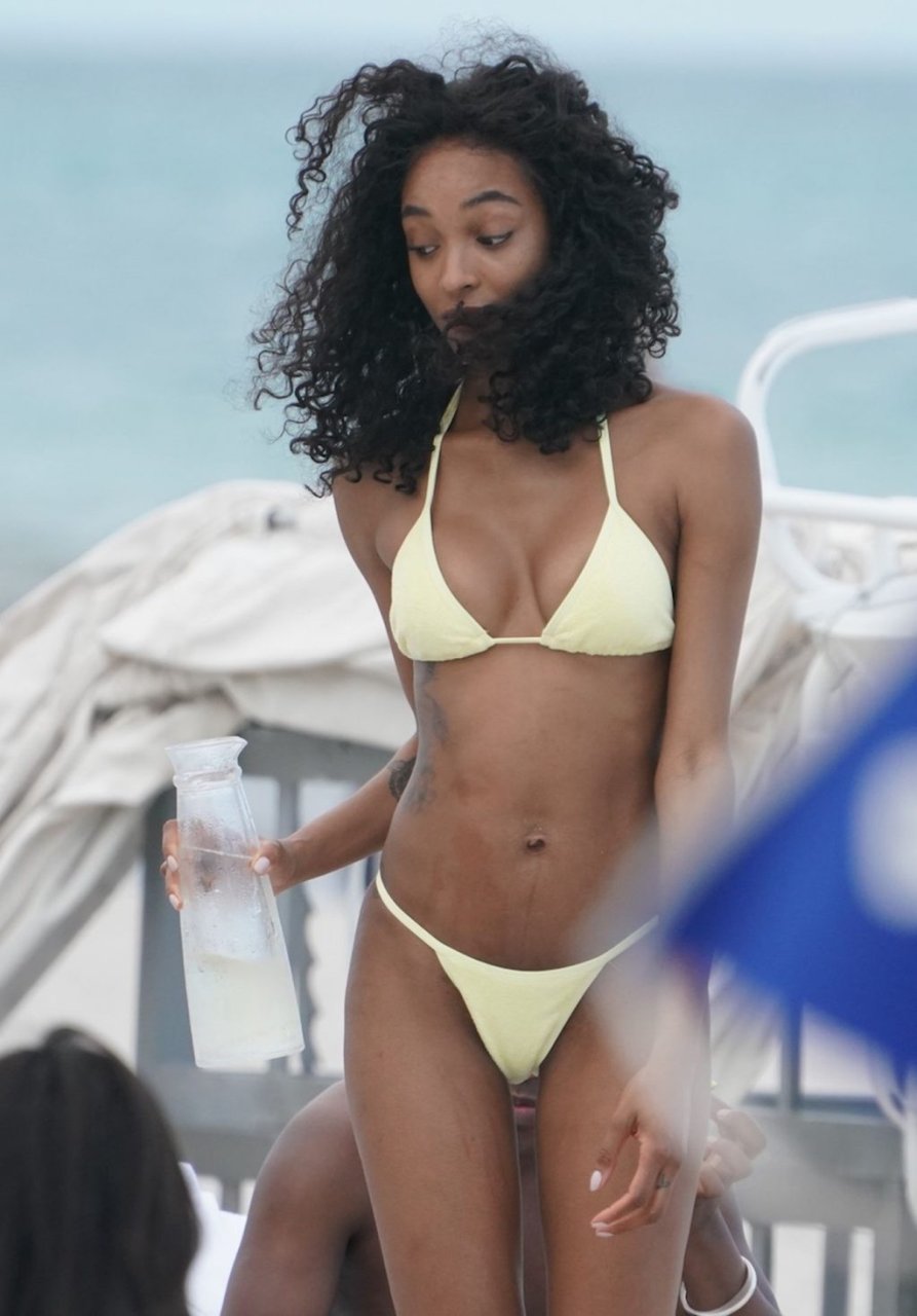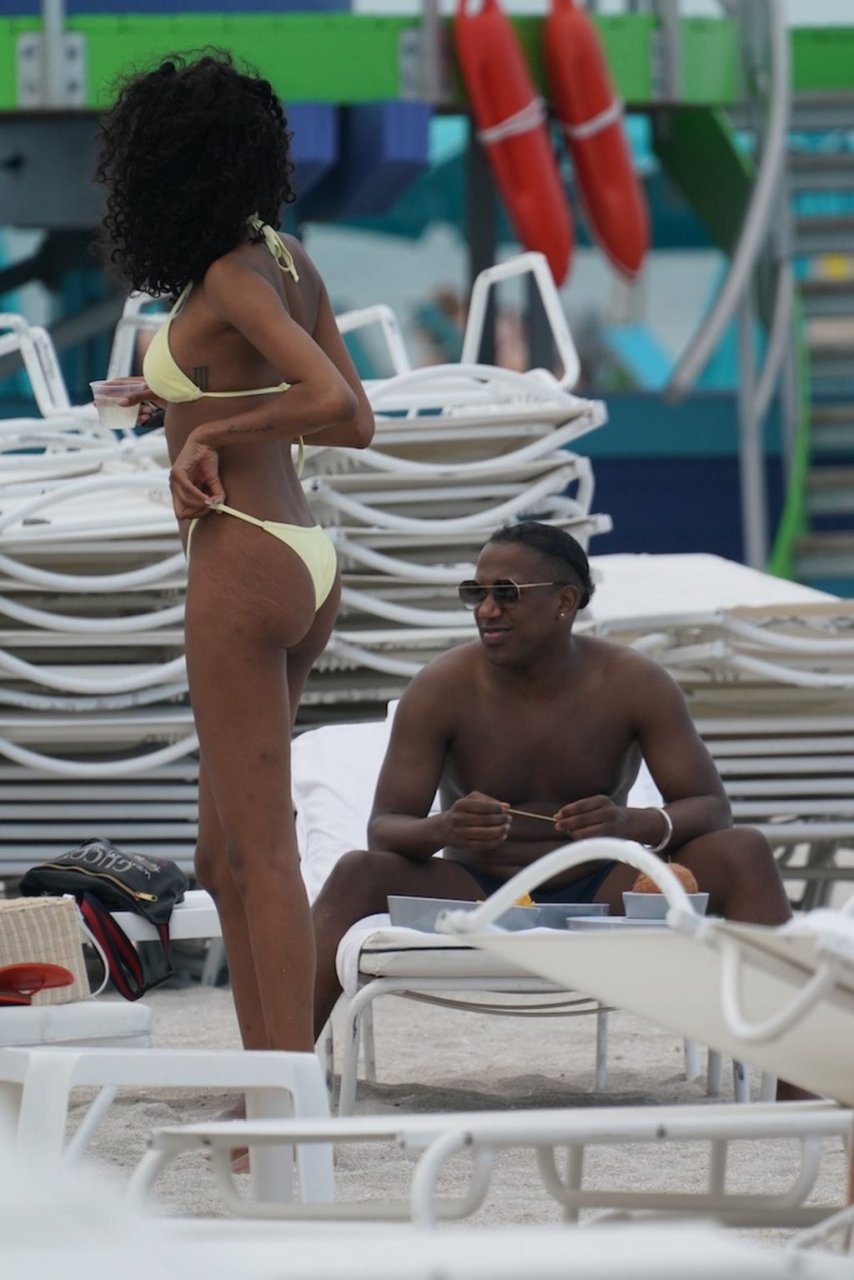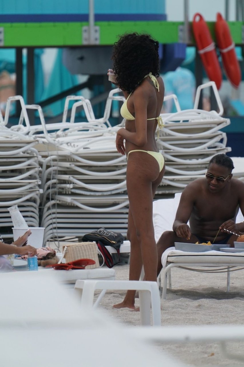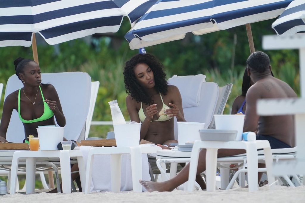 Le mannequin Jourdan Dunn a été vu en bikini jaune avec des amis à la plage de Miami Beach, le 12/05/2019.