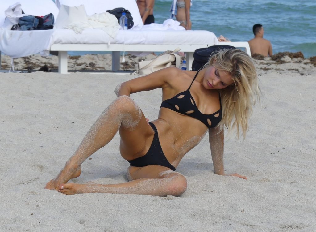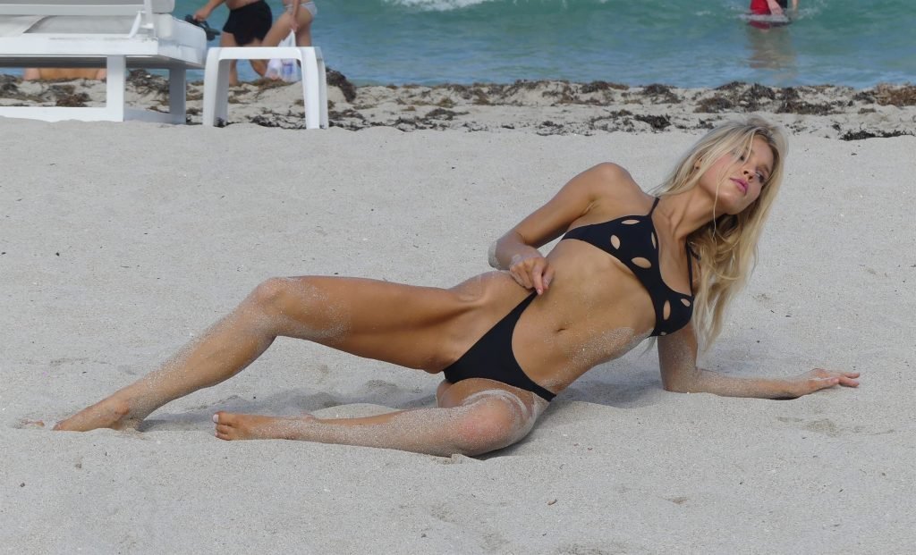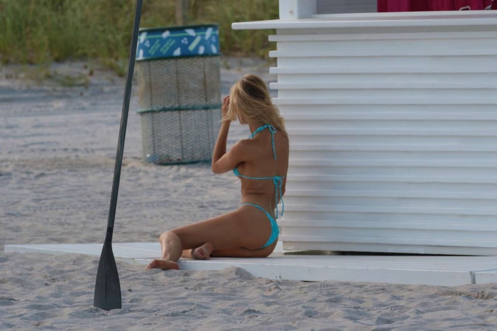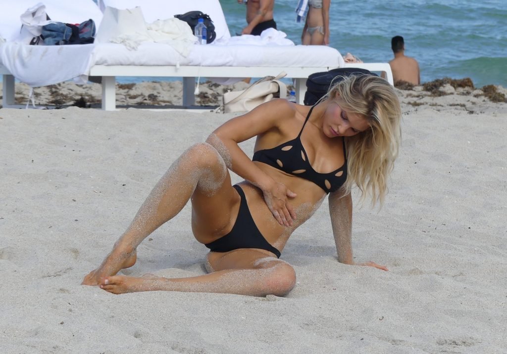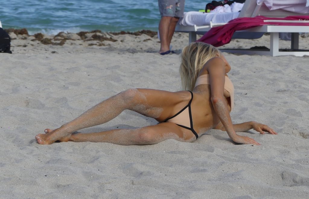 Supermodel Joy Corrigan de Sports Illustrated et Playboy pose sur la plage à Miami, 25/07/2017.