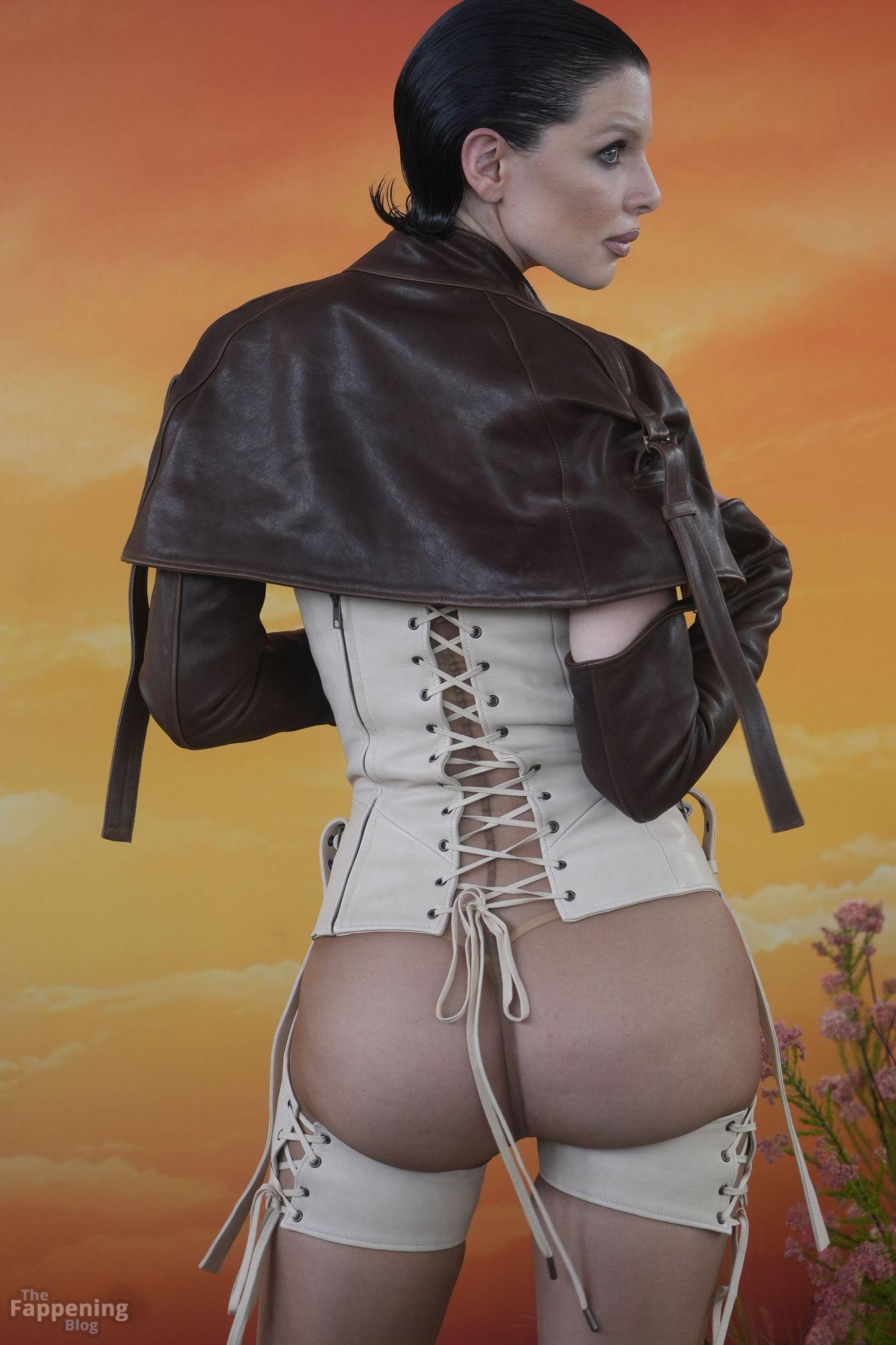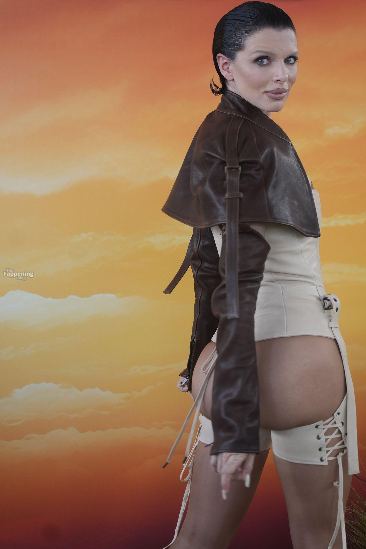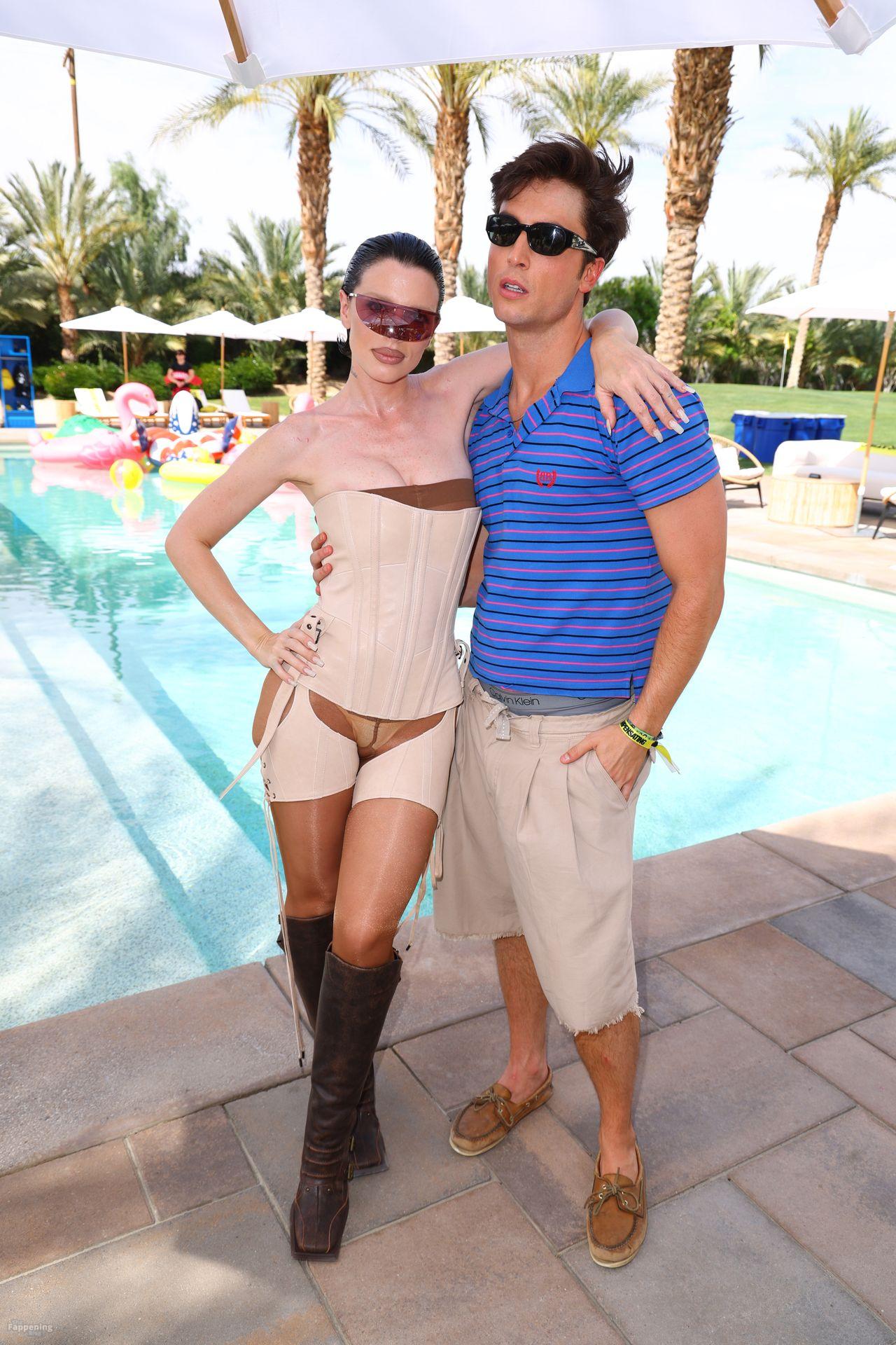 Julia Fox était au Revolve Festival Desert Mirage Experience à Thermal, en Californie, pour le week-end de Coachella, arborant un bustier très échancré, des bas, une veste courte en cuir et de longs gants.