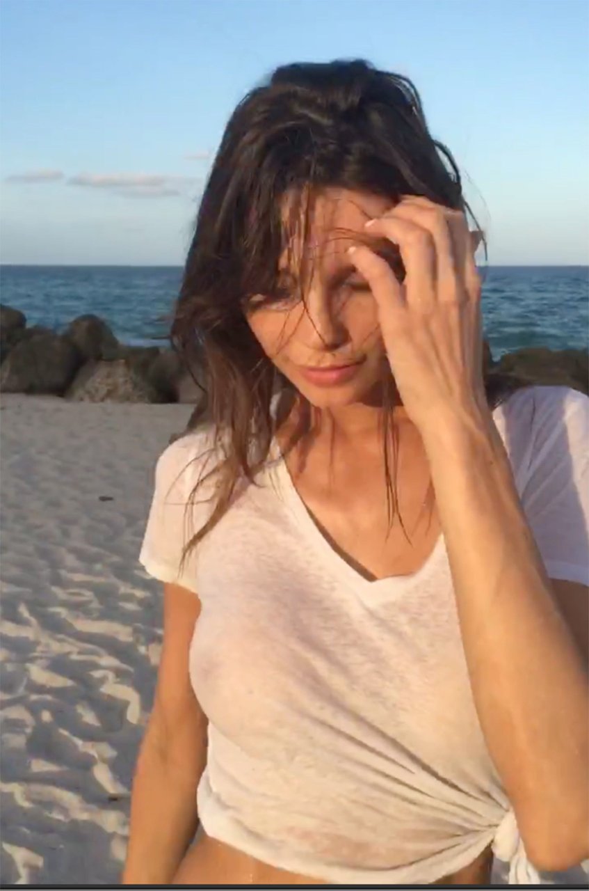 La créatrice de maillots de bain brésilienne et mannequin Julia Pereira réalisait une séance photo audacieuse de t-shirt mouillé sur la plage de Miami, le 26/07/2017.