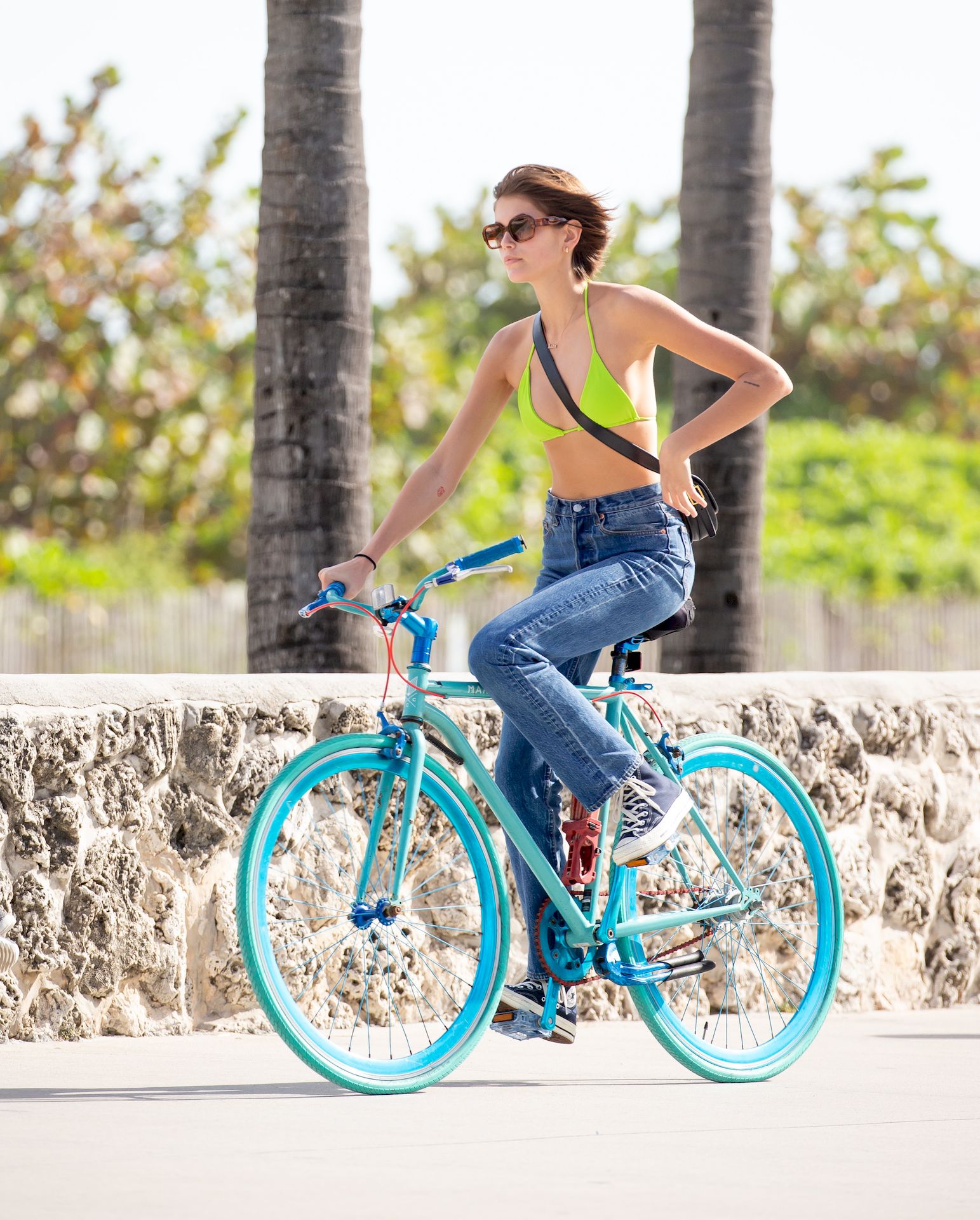 La supermodèle Kaia Gerber (18 ans) semble insouciante lors d’une balade à vélo à Miami Beach avec ses amis hollywoodiens, 13/01/2020.