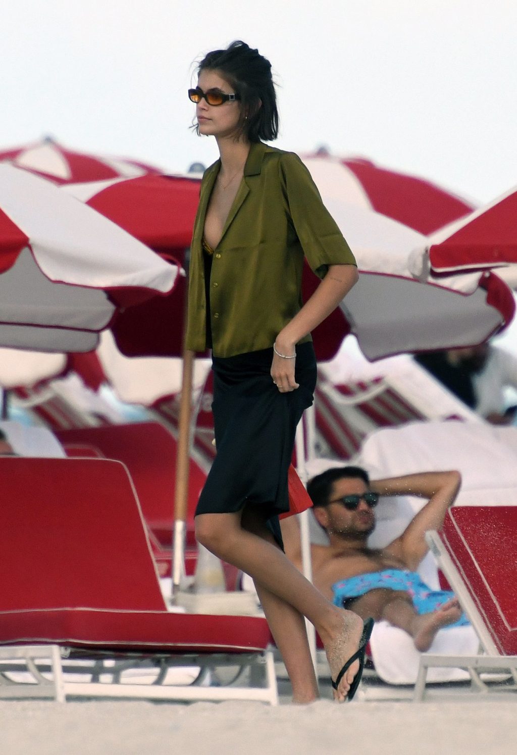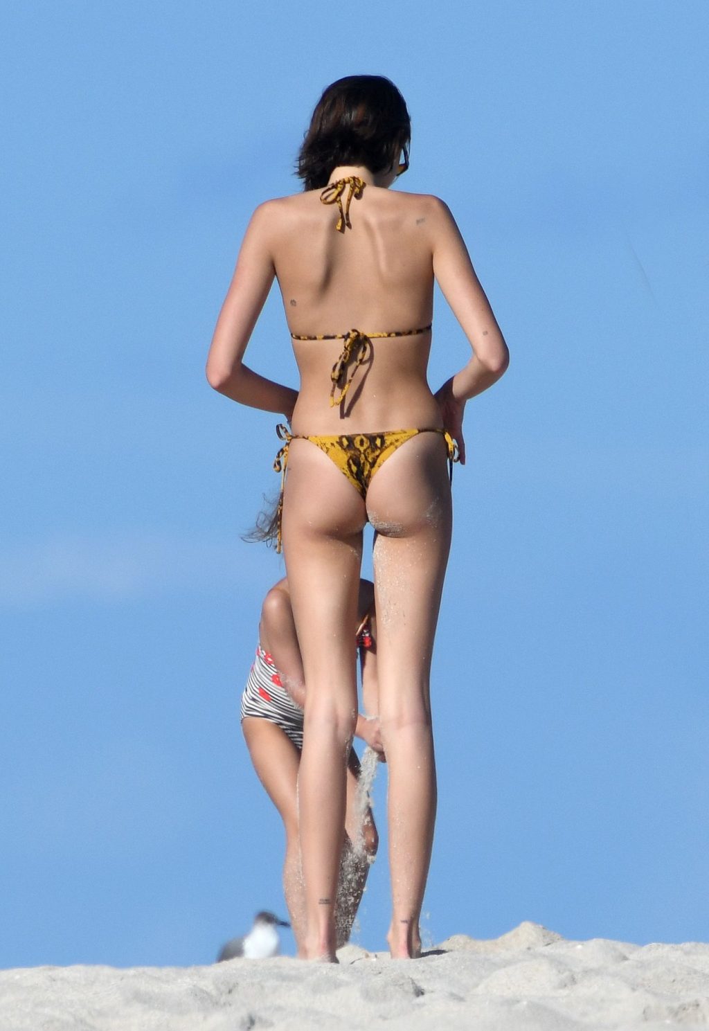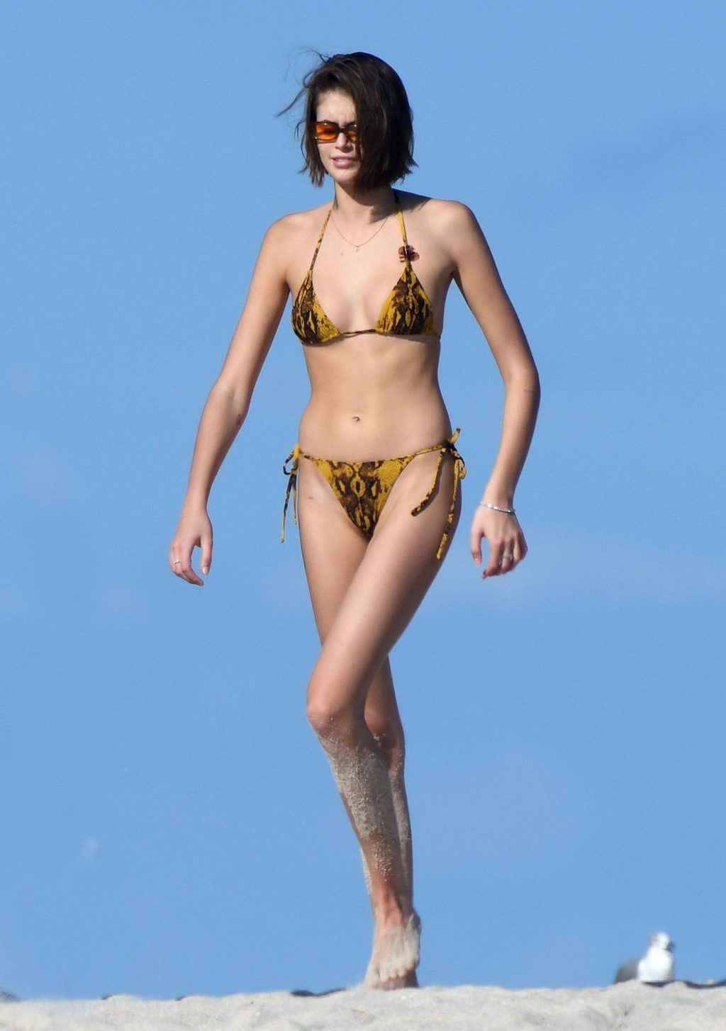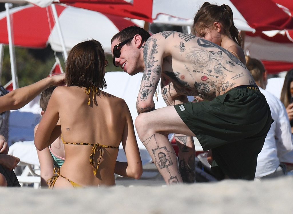 Le mannequin Kaia Gerber porte un tout petit bikini jaune et noir à imprimé peau de serpent alors qu’elle reçoit un baiser de son petit ami très tatoué Pete Davidson sur la plage de Miami, le 22/11/2019.