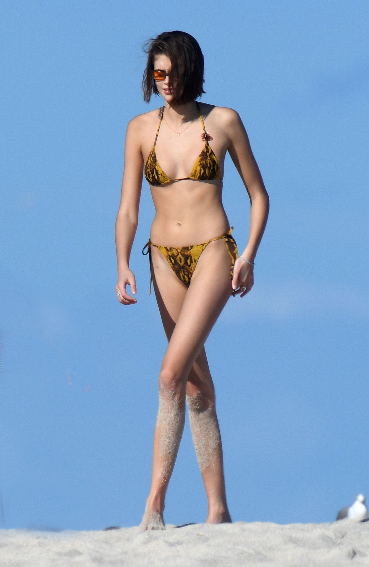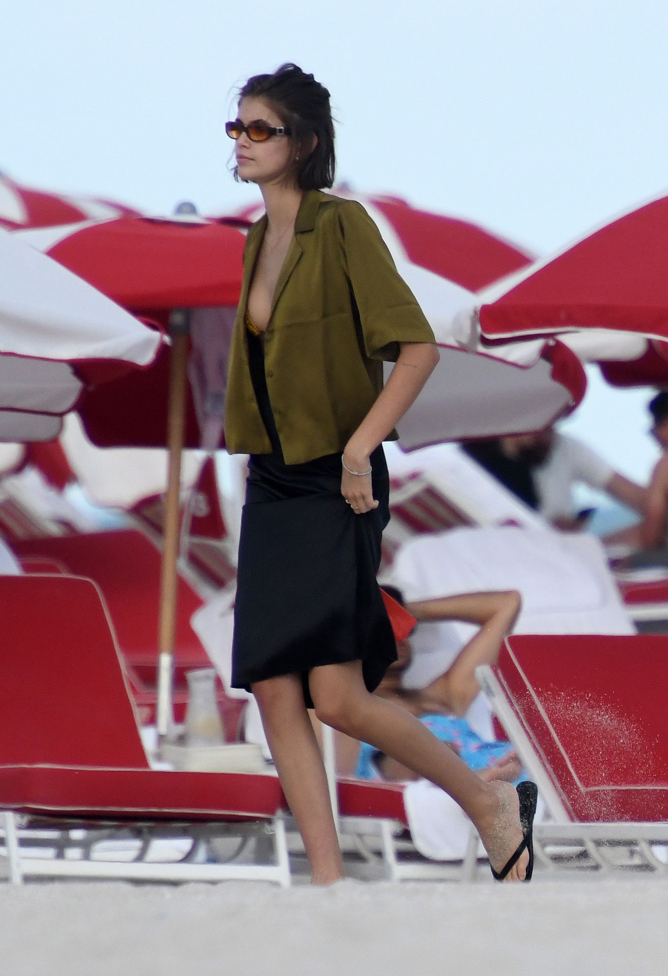 Le mannequin Kaia Gerber porte un tout petit bikini jaune et noir à imprimé peau de serpent alors qu’elle reçoit un baiser de son petit ami très tatoué Pete Davidson sur la plage de Miami, le 22/11/2019.