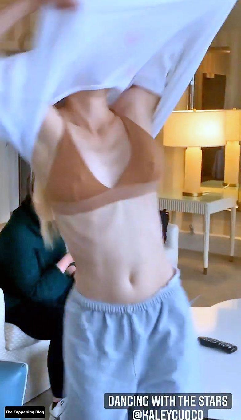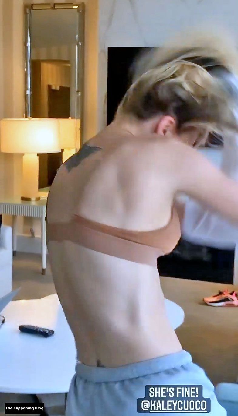 Kaley Cuoco’s tits were seen in a sports bra as she took off her shirt for an Instagram story video! It looks like the blonde, who is currently divorcing her second husband at the age of 35, is about to end up with no kids and plastic boobs! No one finds that attractive anymore!