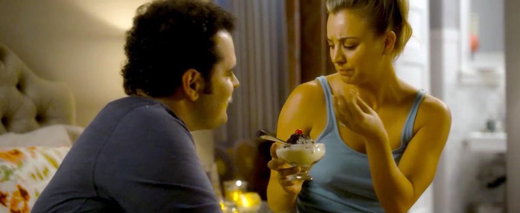 The first scene is from a movie called ‘The Wedding Ringer’. Kaley Cuoco walks into the room braless as she comes out of a bathroom arguing with a man and then sits down on the bed with him while he gives her ice cream and then some earrings while attempting to charm her into having sex with him, all while looking at her hard nipples.