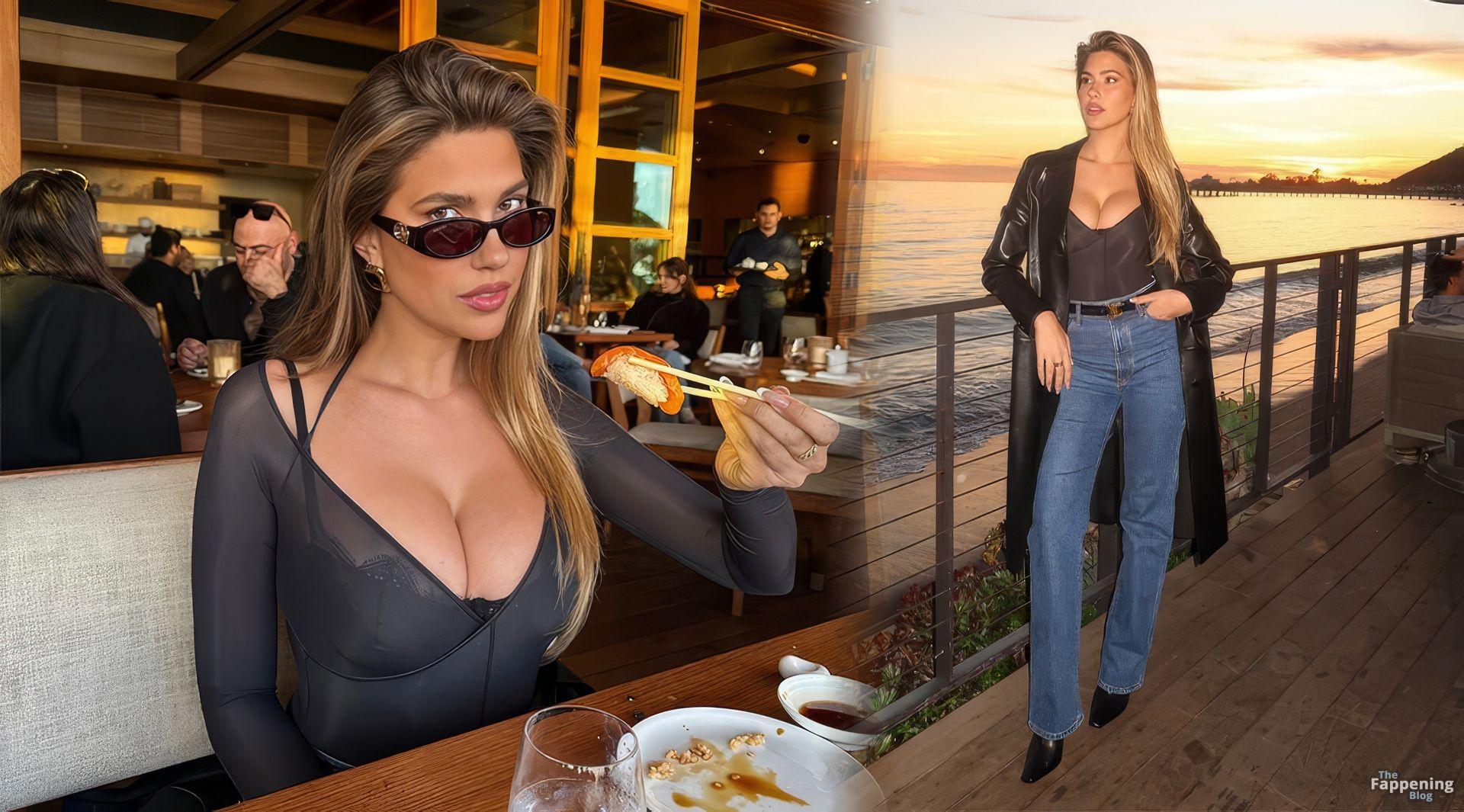 Kara Del Toro est photographiée dans un chemisier transparent qui met en avant son généreux décolleté et son soutien-gorge en dentelle.
