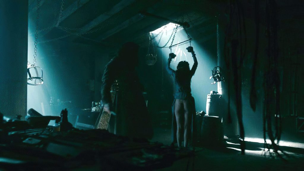 Nous voyons Karen Hassan debout, nue, les mains enchaînées au-dessus de sa tête. Ses seins complètement nus et ses fesses sont bien visibles, tandis que l’homme la fouette par-dessus l’épaule puis recule, se préparant à la battre encore plus. Des tétons durs et des seins sexy à cause du froid dans ce sous-sol ou parce qu’elle aime être blessée ?