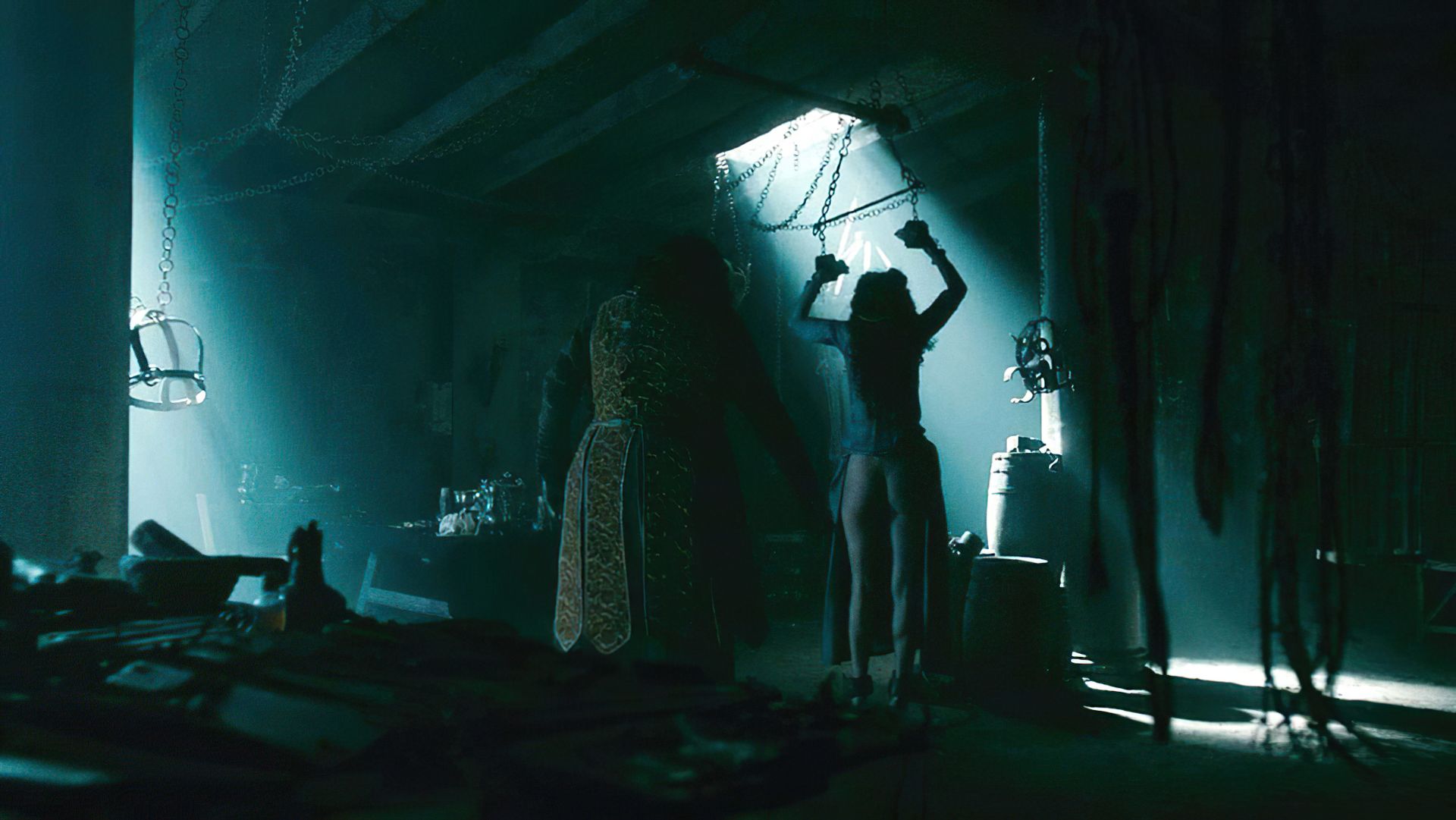 And in the last scene, Karen Hassan stands in a dress with her hands chained above her head. The same guy in the Season 3 picks up her dress in the back to bare her bare ass. You see her get on her feet a few times, and then the guy takes the whip and starts hitting her.
