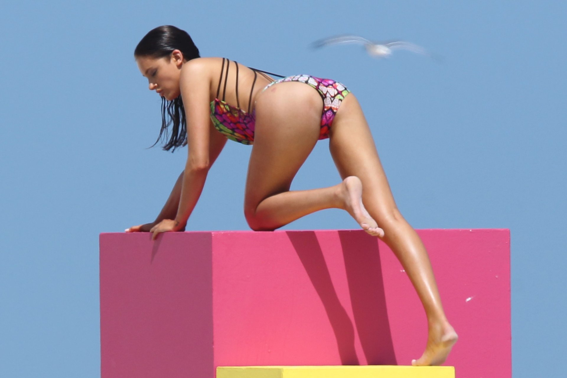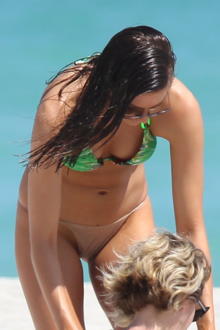 Karina Jelinek a eu un problème de garde-robe lors d’une séance photo à Miami Beach, le 13/03/2016. Olga Karina Jelinek Yamaguchi est un mannequin argentin, actrice et personnalité de la télévision. Âge : 34 ans (22 mars 1981).