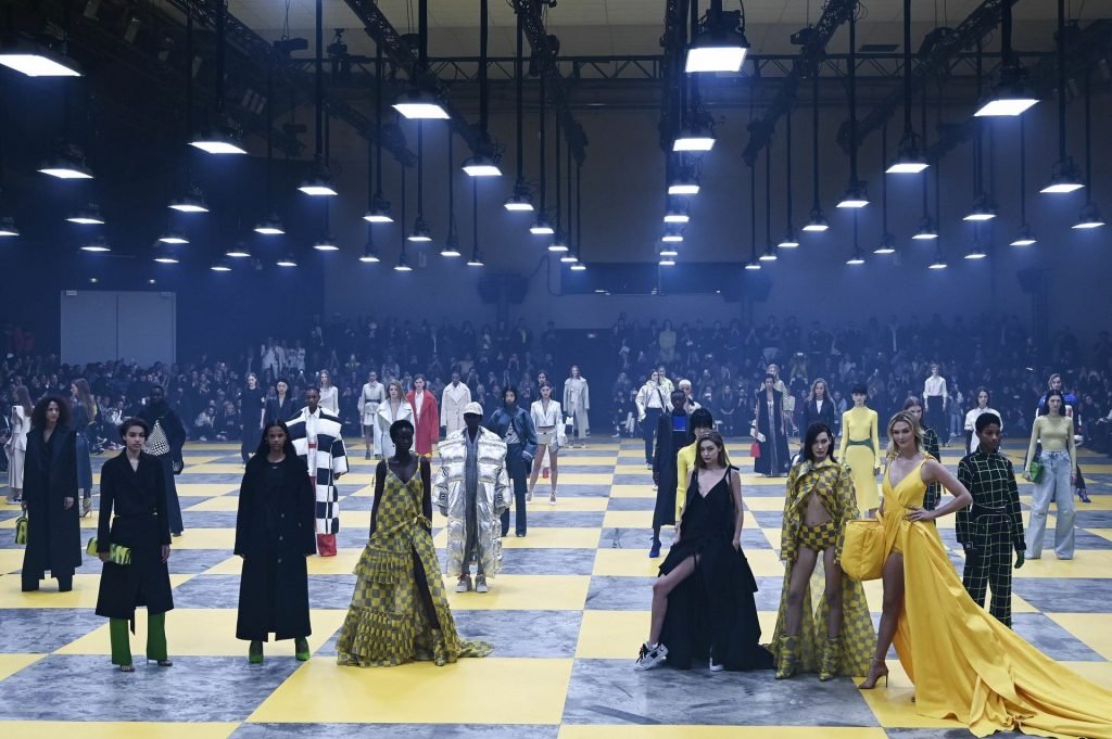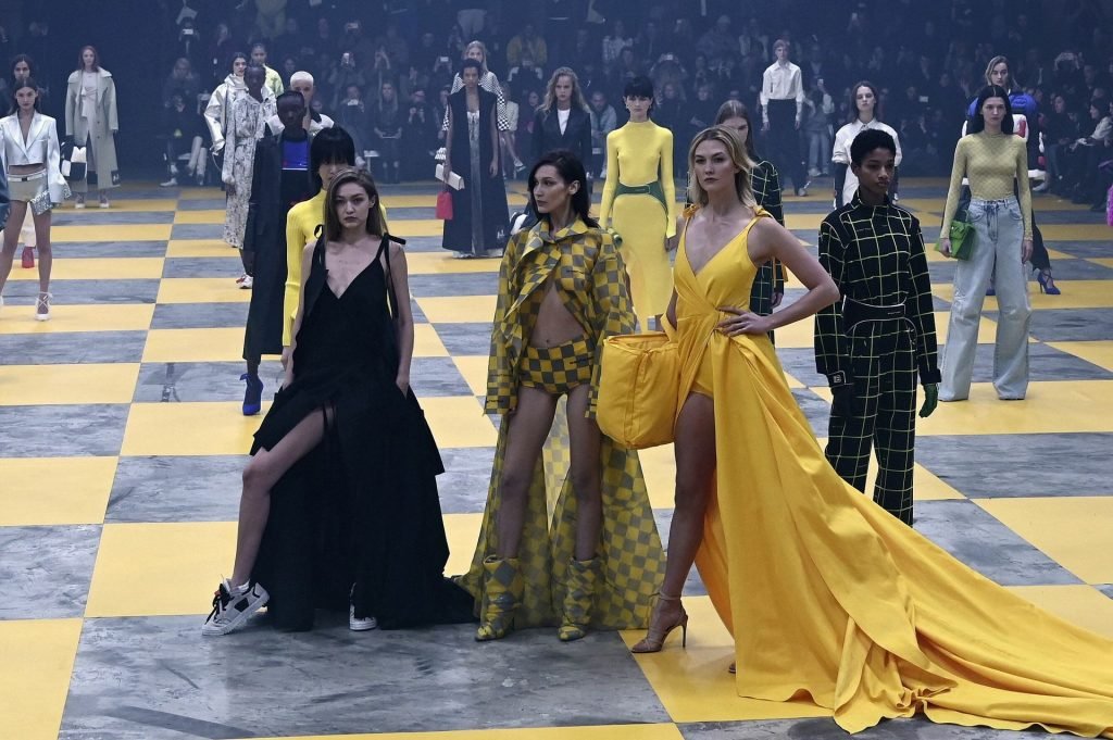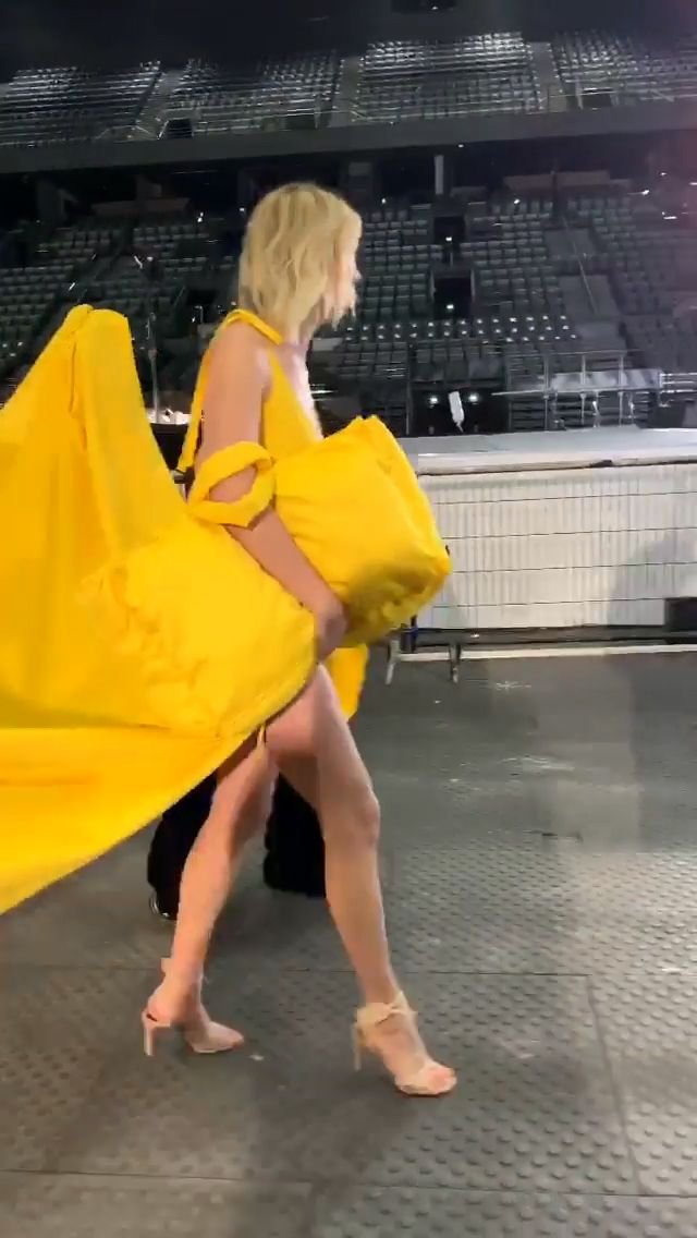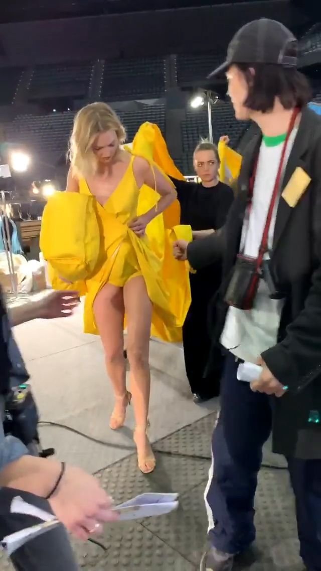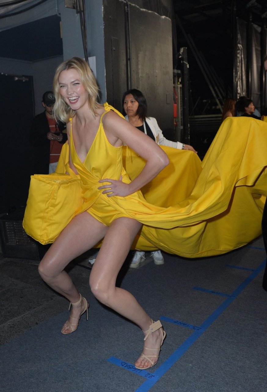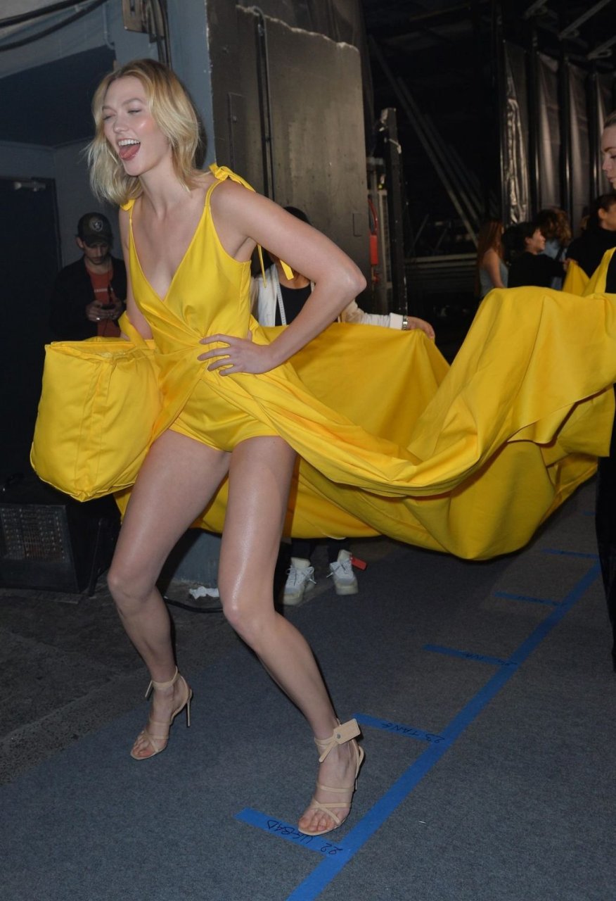 Le mannequin Karlie Kloss a été photographiée en robe jaune dans les coulisses du défilé Off-White “Prêt-à-porter Automne / Hiver 2019-2020” lors de la Fashion Week de Paris, le 28/02/2019.