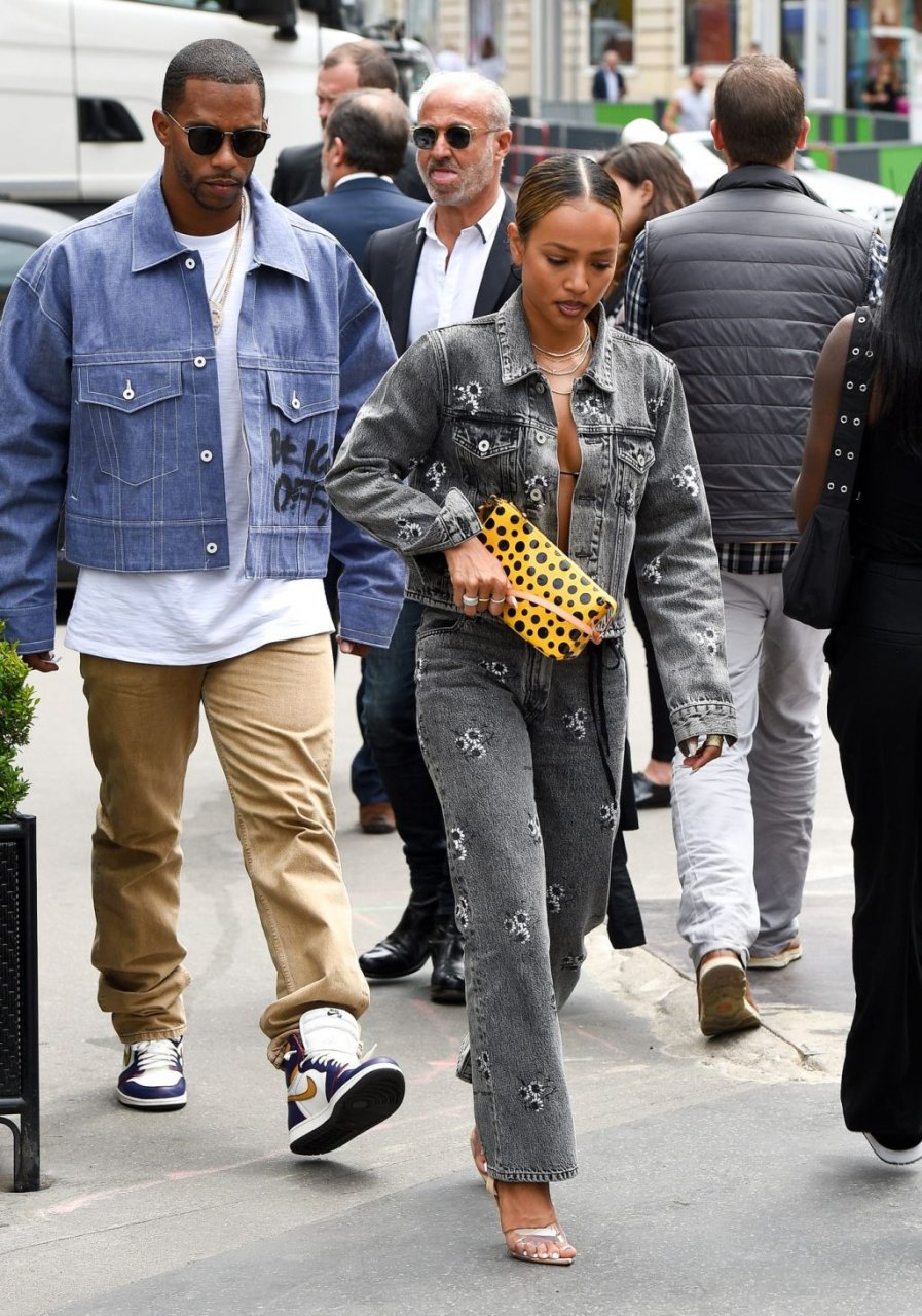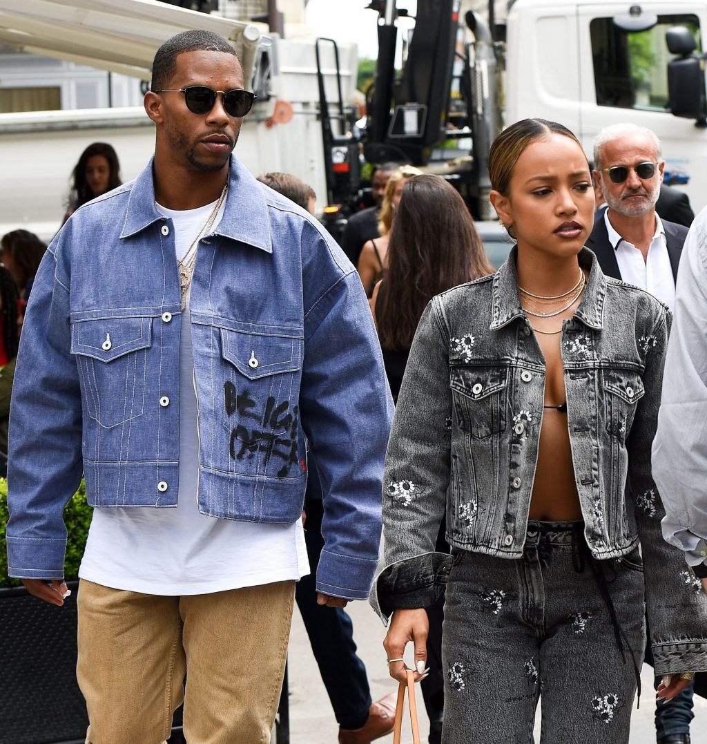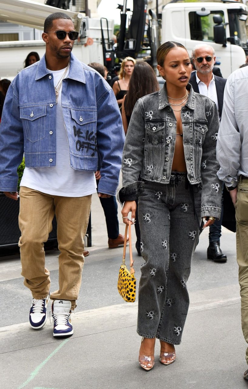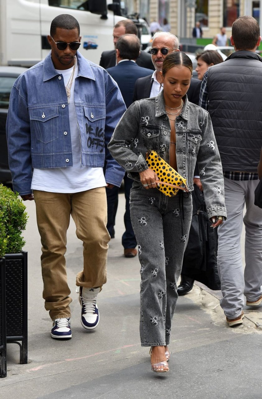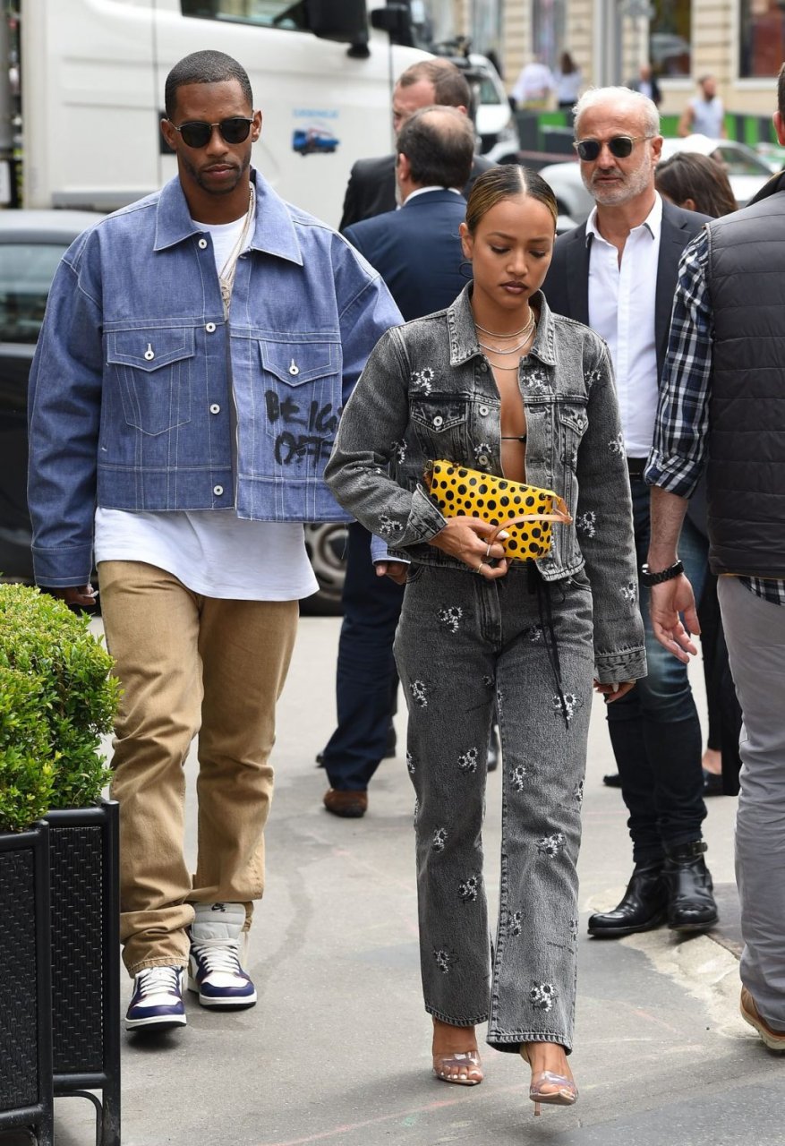 Karrueche Tran et Victor Cruz sont vus en train de dîner au restaurant L’Avenue à Paris avec Rudy Gay, le 19/06/2019. Karrueche portait un tout petit haut de bikini et une veste en jean.