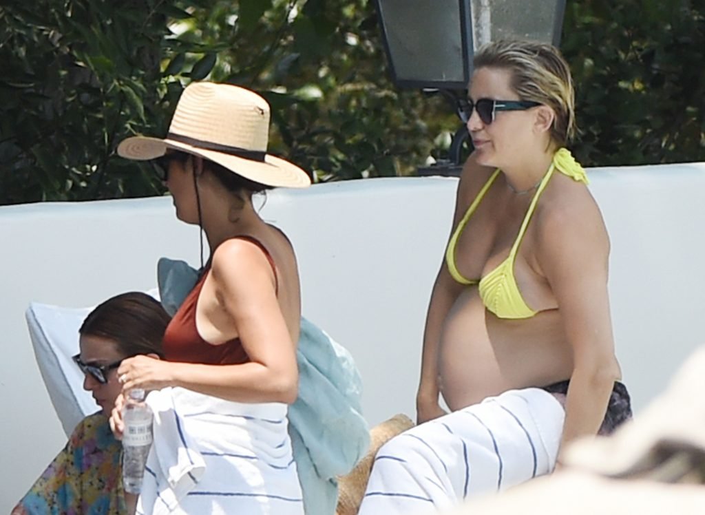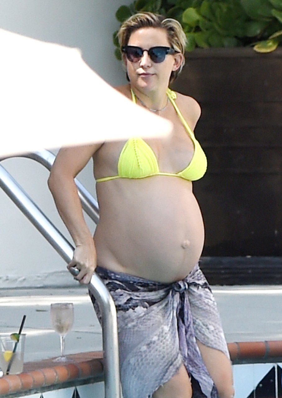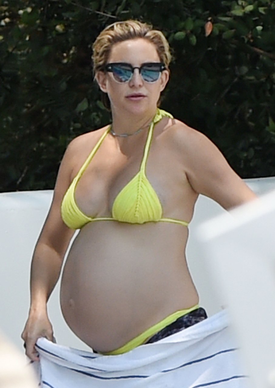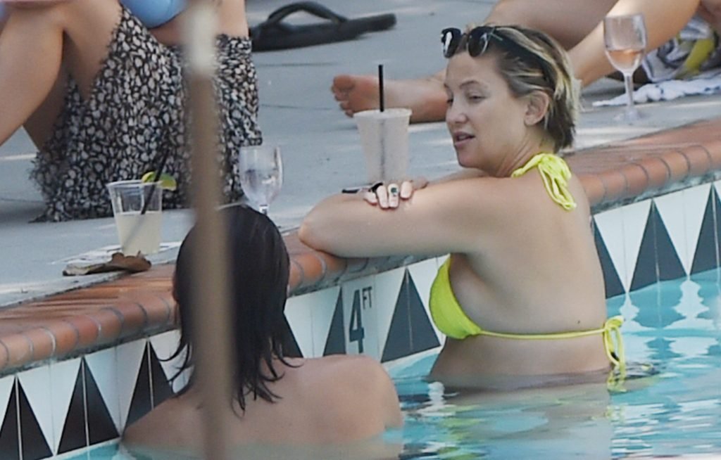 L’actrice Kate Hudson (39 ans) a montré son énorme ventre de grossesse dans un bikini deux pièces jaune néon en nageant dans la piscine avec son compagnon Danny Fujikawa et d’autres amis à l’Ojai Valley Inn & Spa à Ojai, Californie, le 28/07/2018.