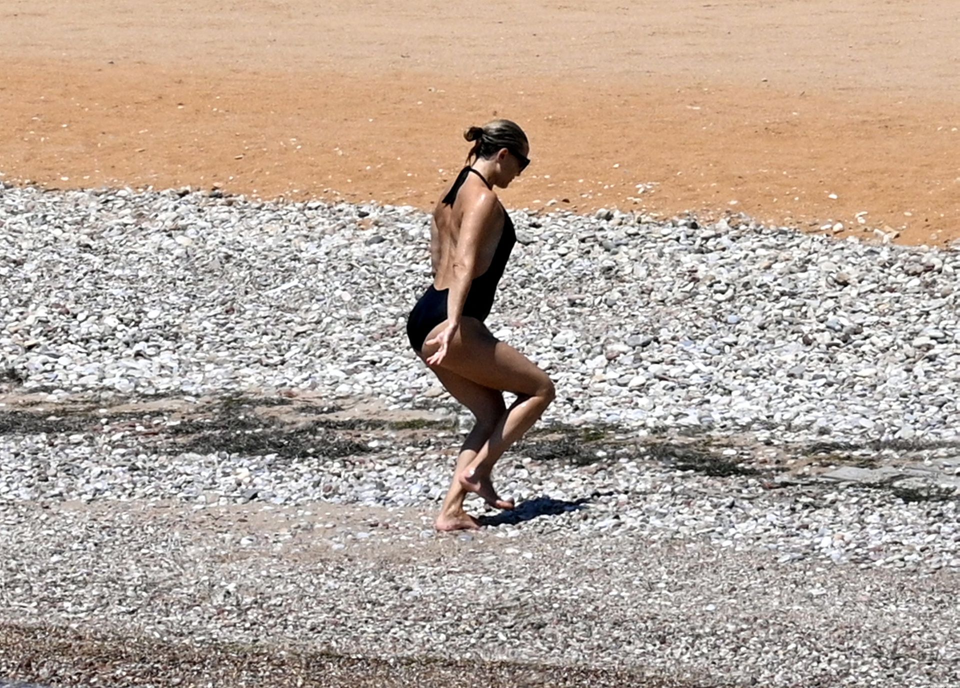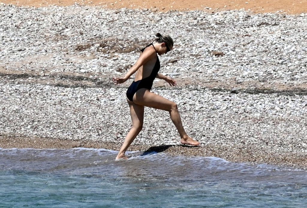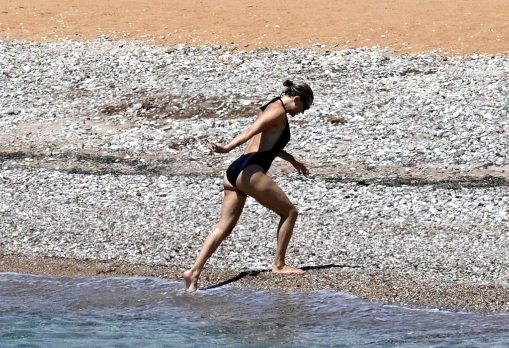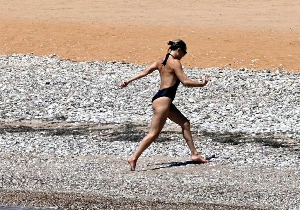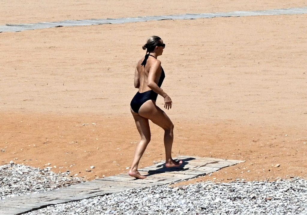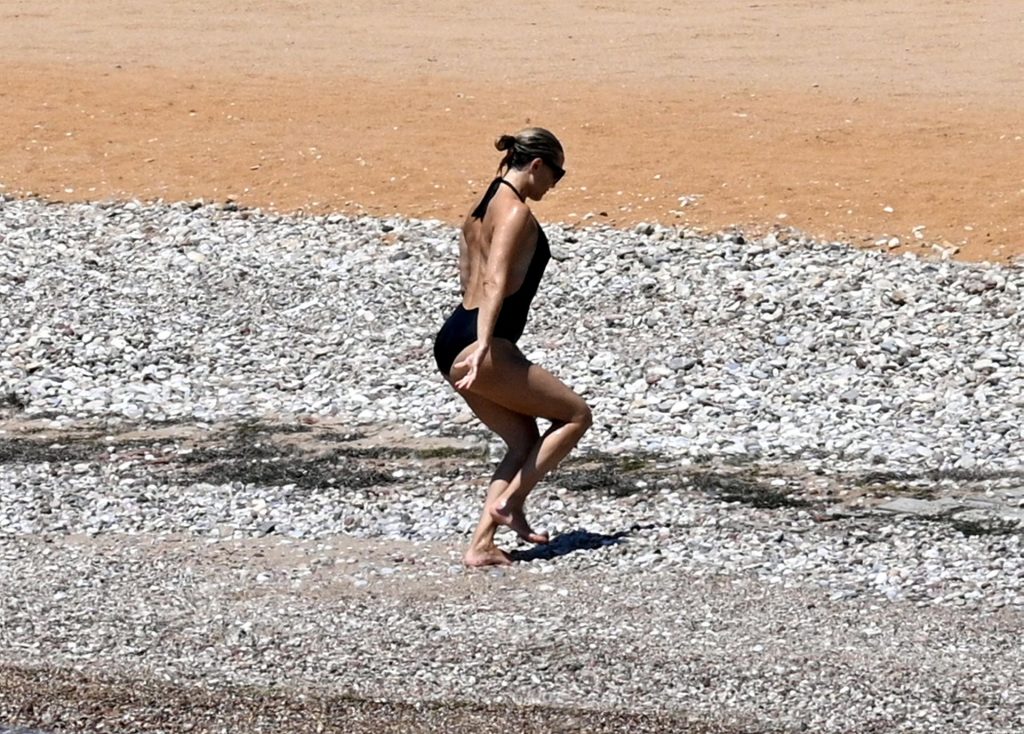 Kate Hudson est vue avec sa famille à la plage en Grèce, le 07/03/2021. Kate a ébloui, montrant son corps affiné par le yoga dans un maillot de bain une pièce noir.
