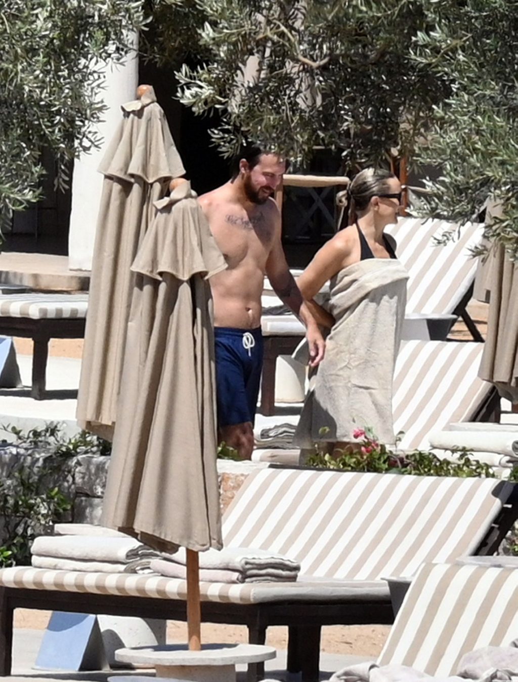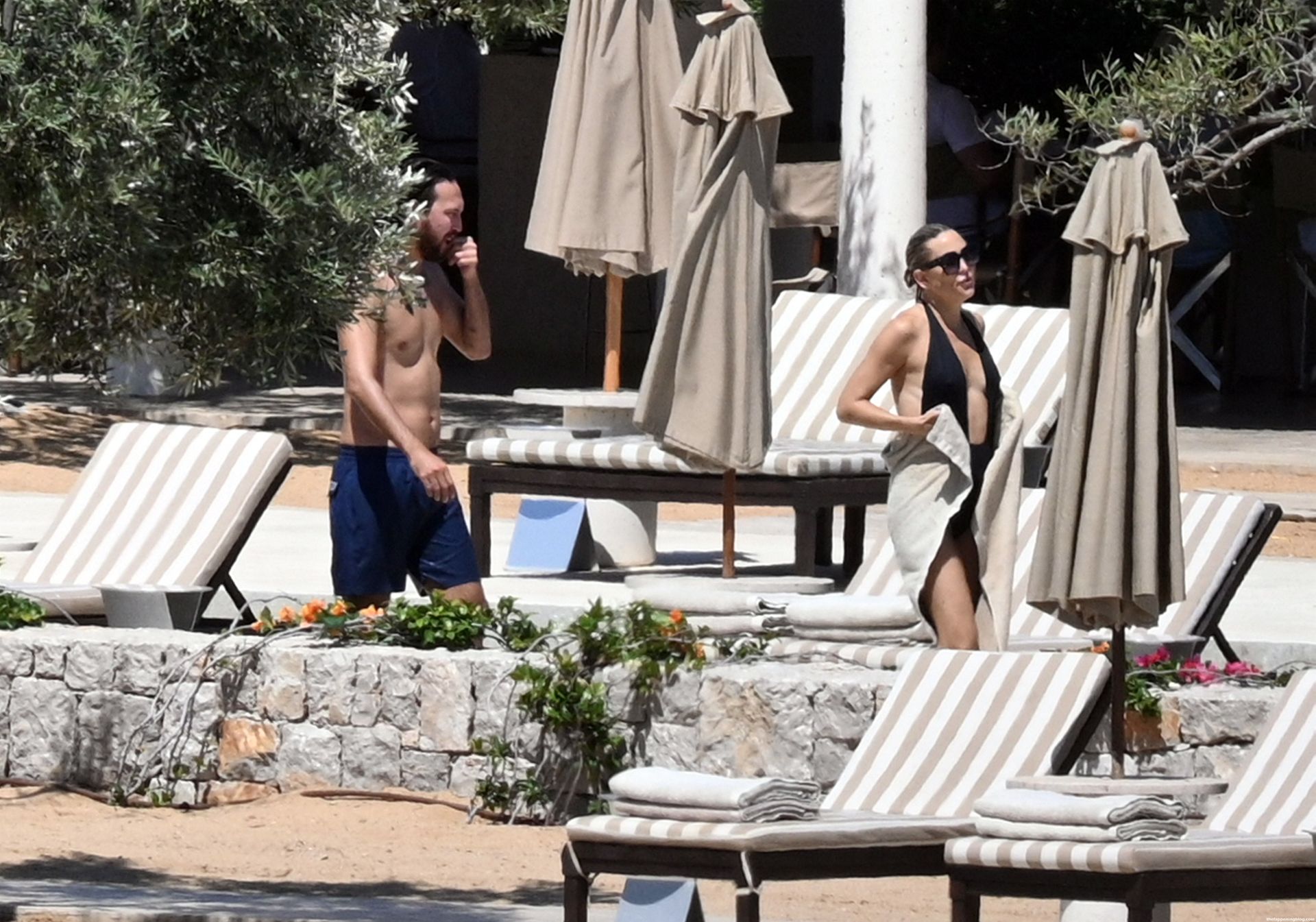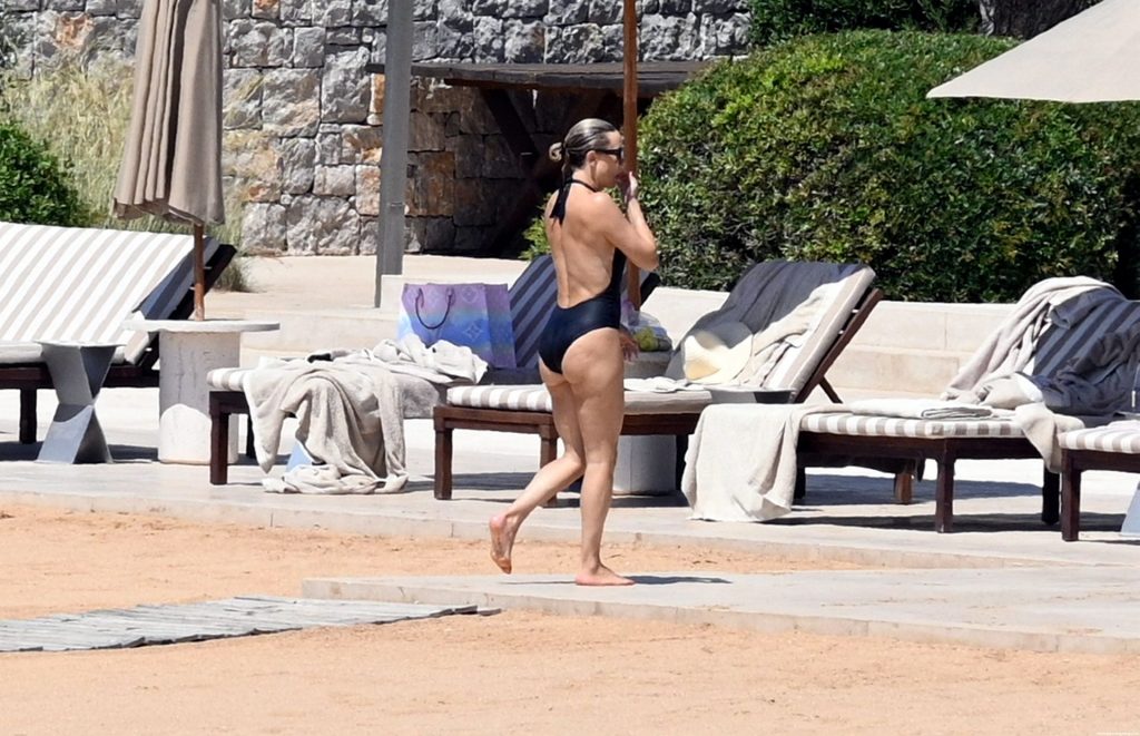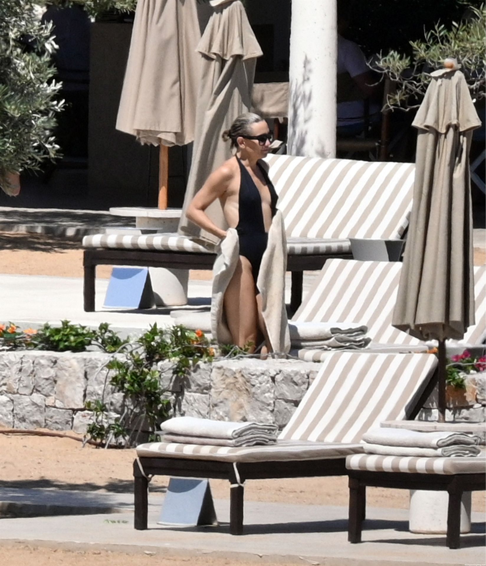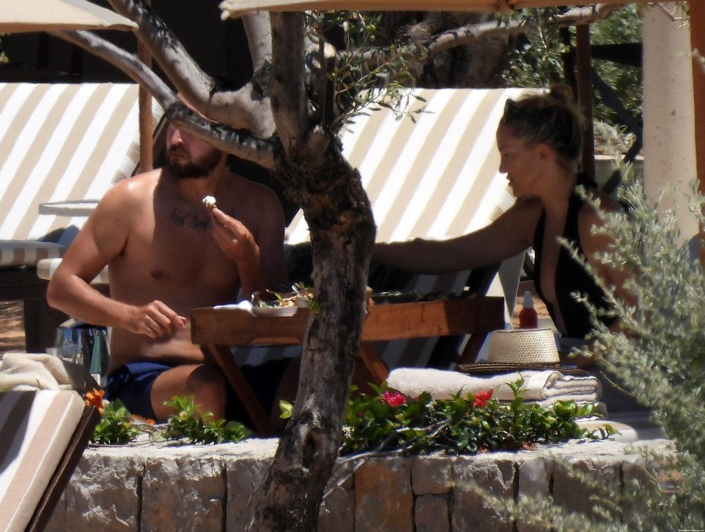 Kate Hudson est vue avec sa famille à la plage en Grèce, le 07/03/2021. Kate a ébloui, montrant son corps affiné par le yoga dans un maillot de bain une pièce noir.