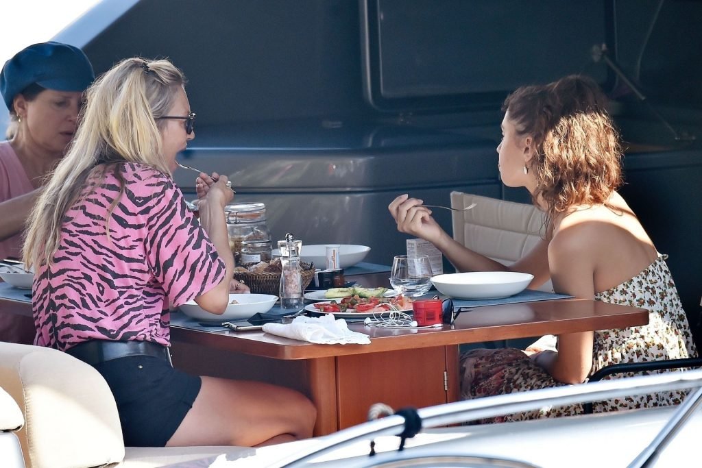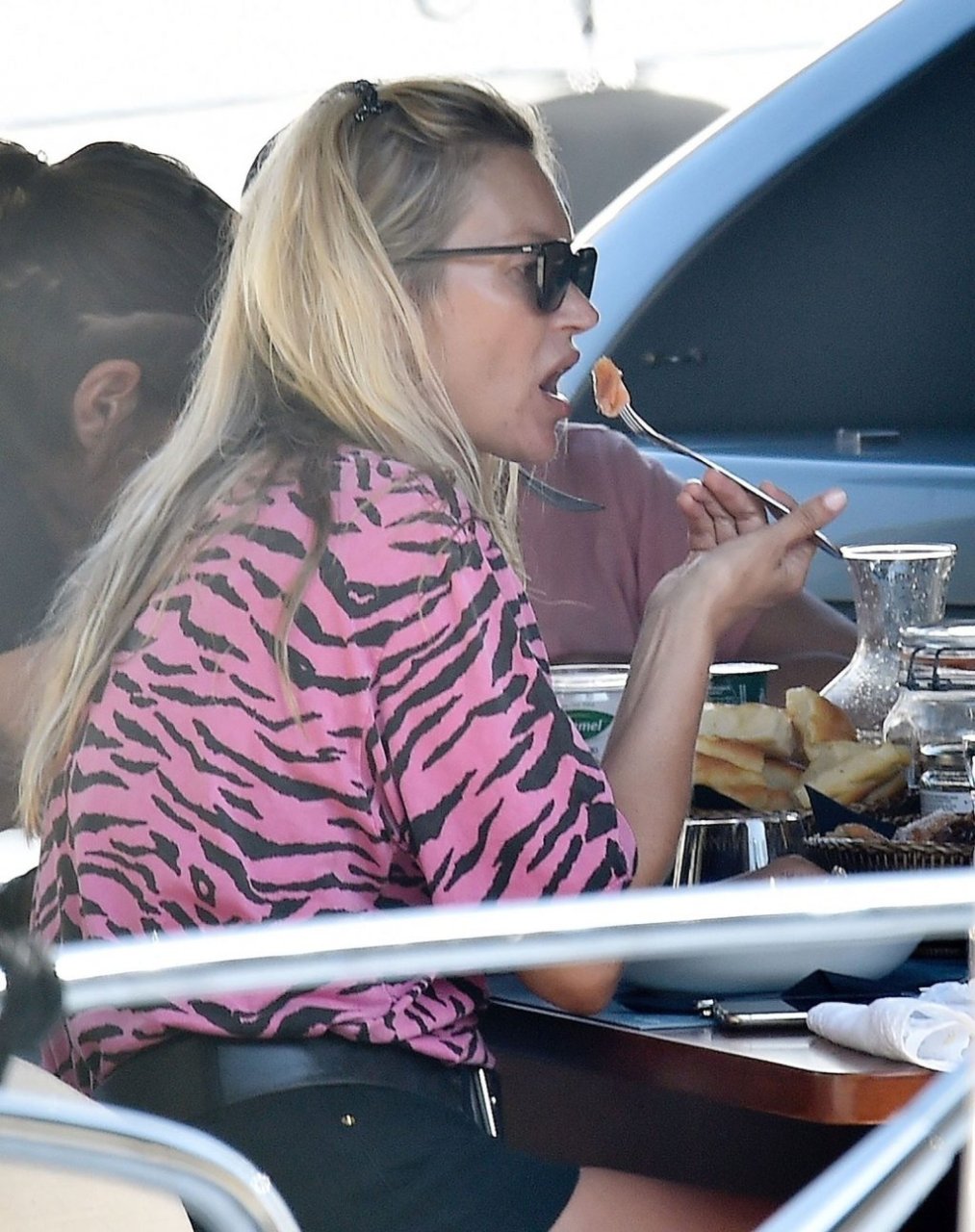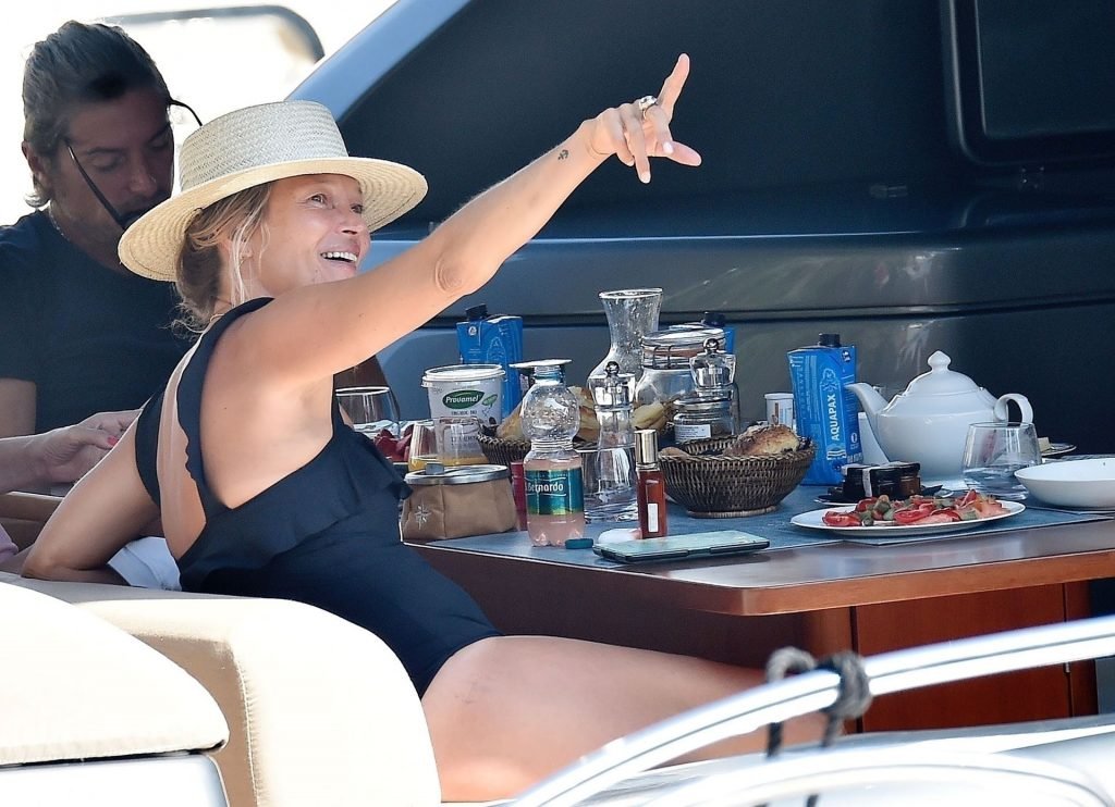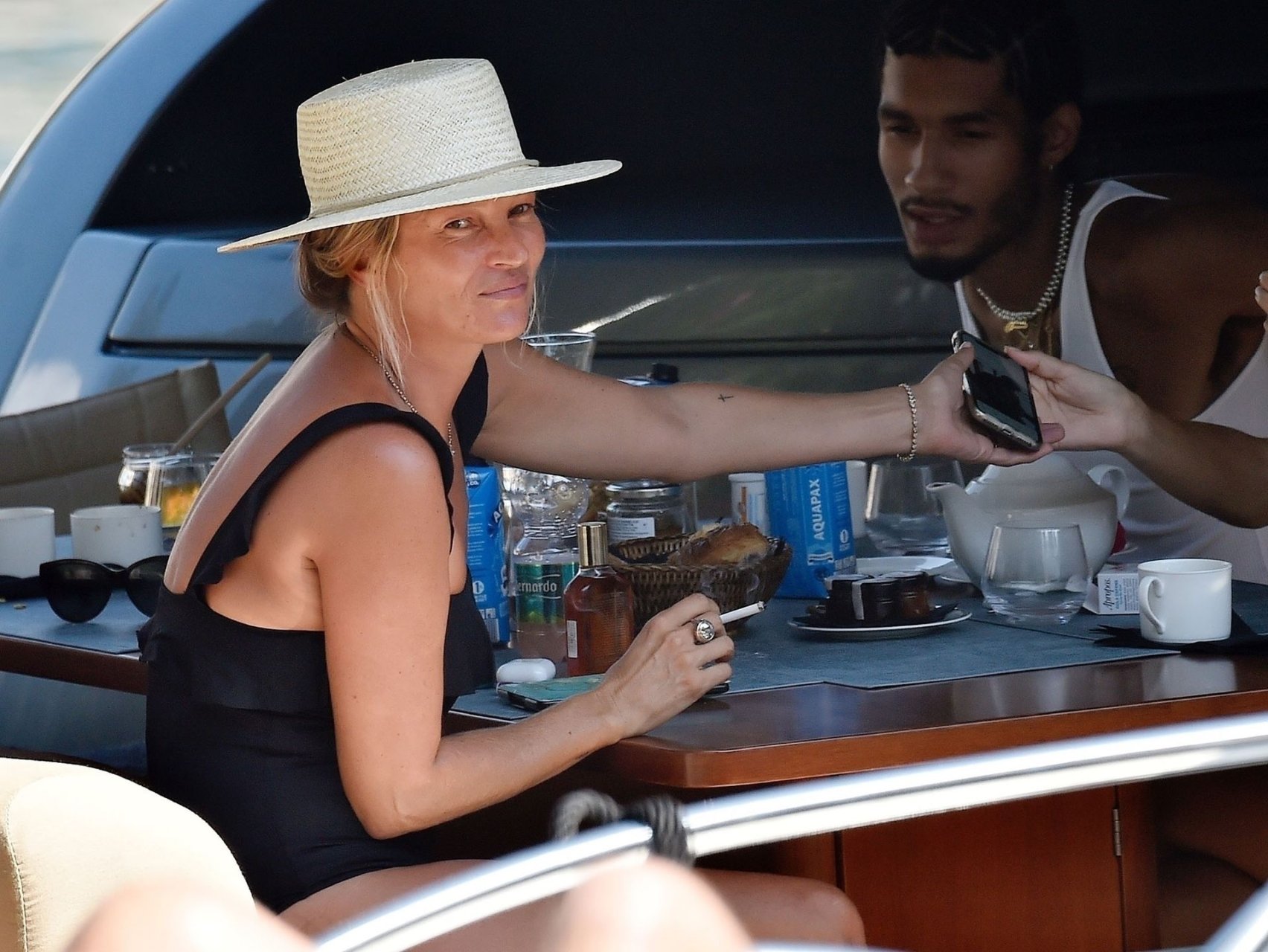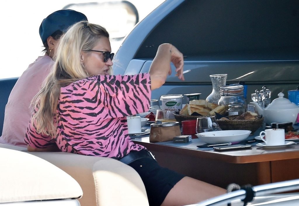 Ici, nous voyons Kate aussi détendue que jamais, portant son maillot de bain noir, appréciant un verre et une cigarette, accompagnée lors du voyage par le couple Sadie Frost et son compagnon Darren Strowger ainsi que la fille de Sadie, Iris.