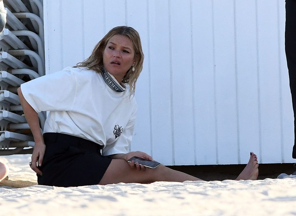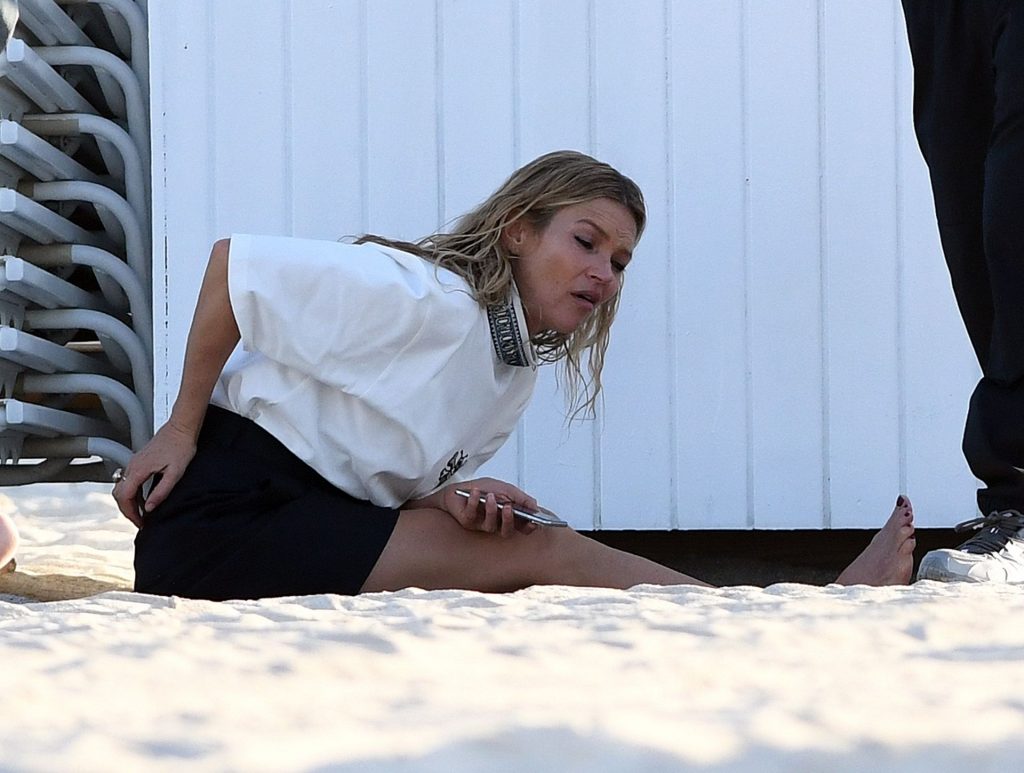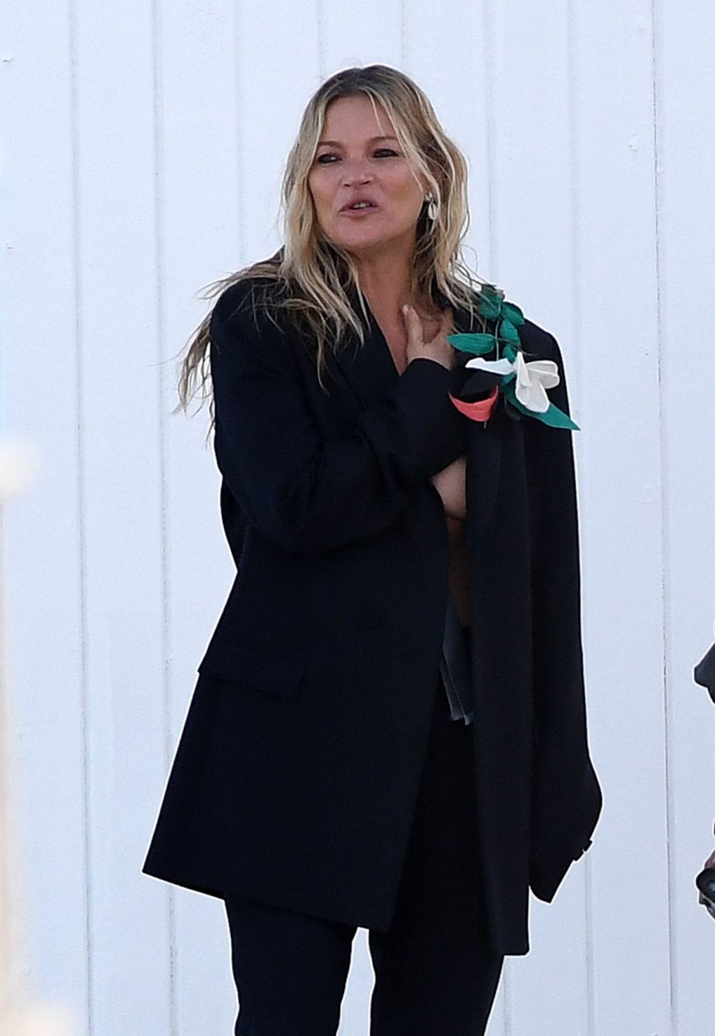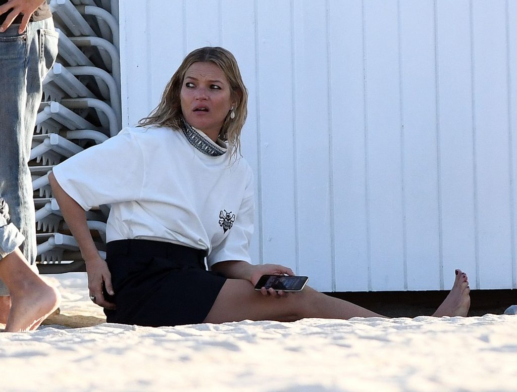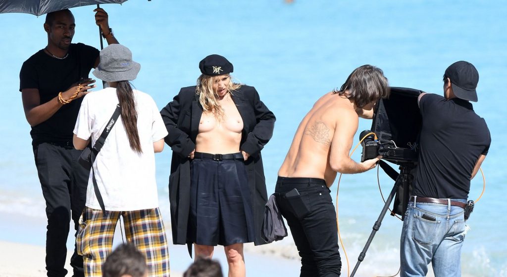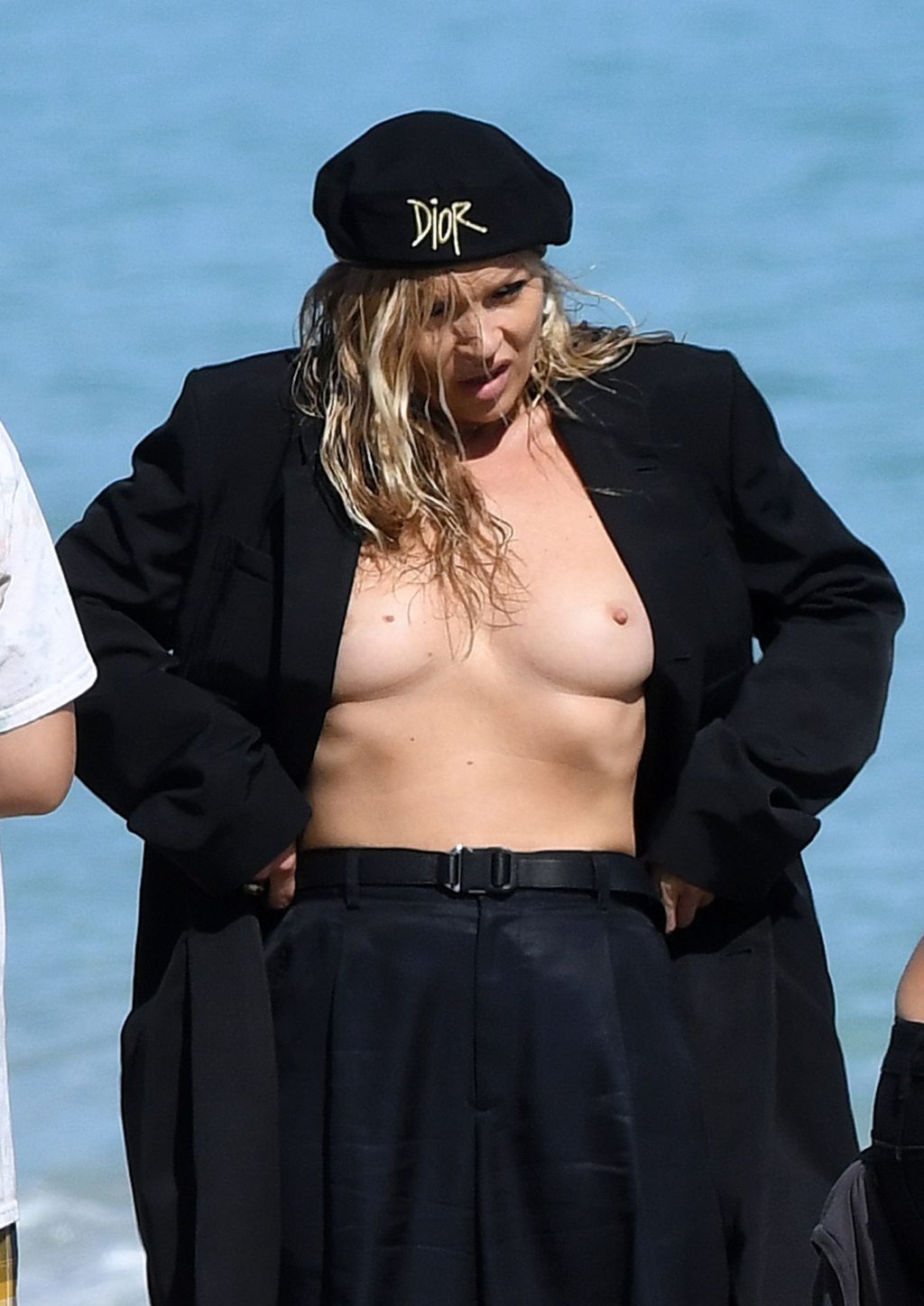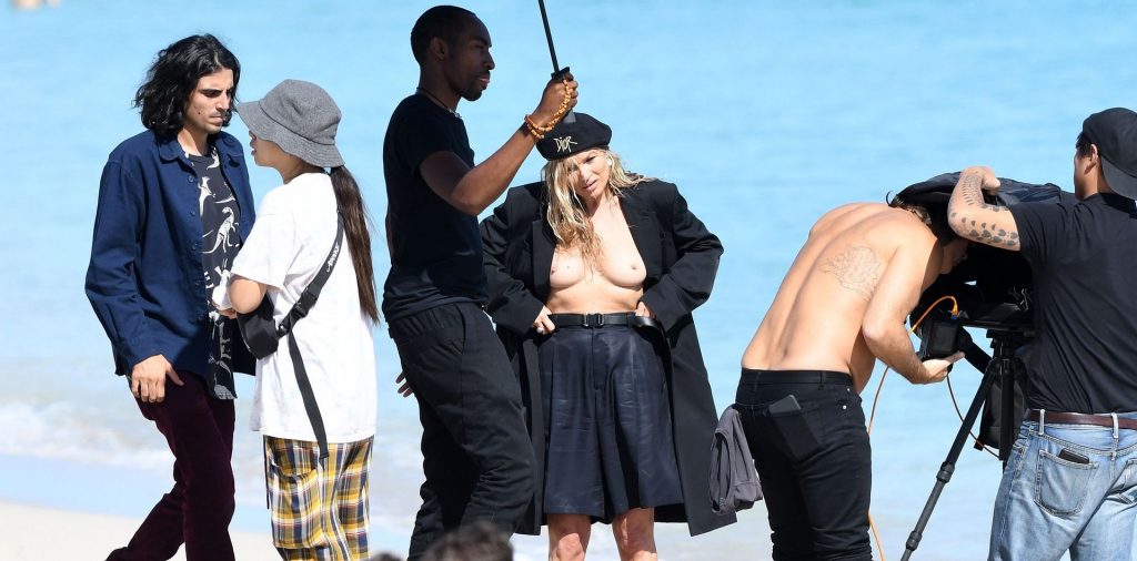 La supermodèle Kate Moss est complètement topless sous un trench-coat lors d’une séance photo sur la plage de Miami, le 12/04/2019. La séance semblait être pour la nouvelle collaboration Dior Menswear avec Stussy qui a été présentée la veille au soir.