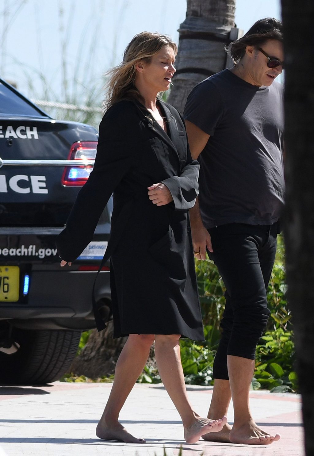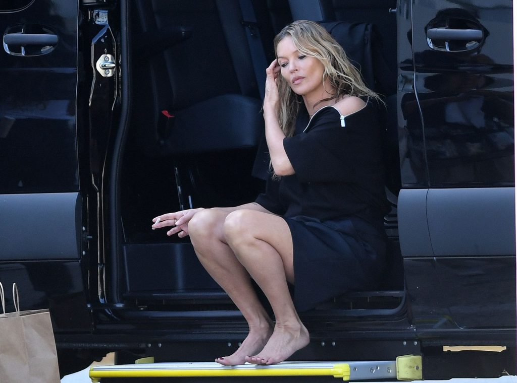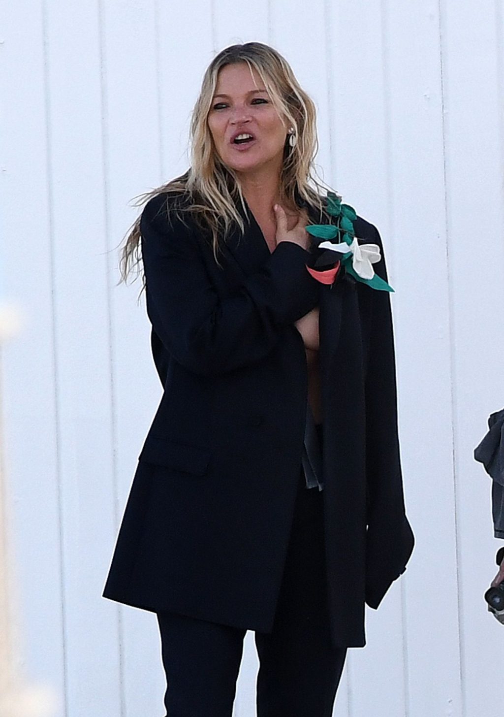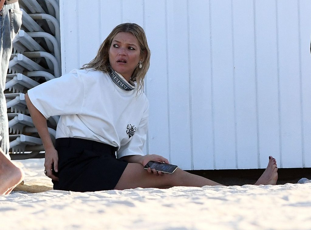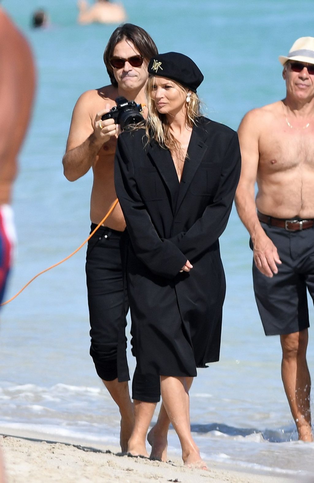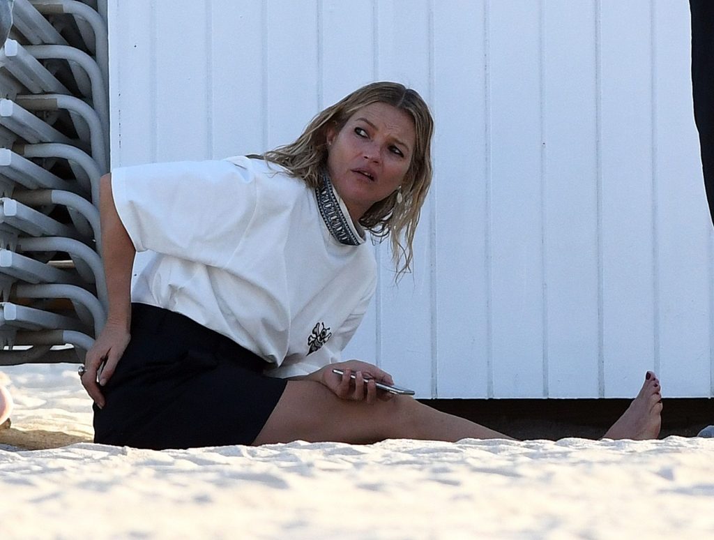 La supermodèle Kate Moss est complètement topless sous un trench-coat lors d’une séance photo sur la plage de Miami, le 12/04/2019. La séance semblait être pour la nouvelle collaboration Dior Menswear avec Stussy qui a été présentée la veille au soir.