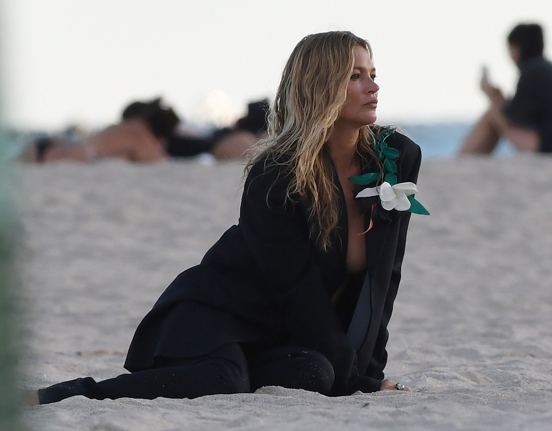 La supermodèle Kate Moss est complètement topless sous un trench-coat lors d’une séance photo sur la plage de Miami, le 12/04/2019. La séance semblait être pour la nouvelle collaboration Dior Menswear avec Stussy qui a été présentée la veille au soir.