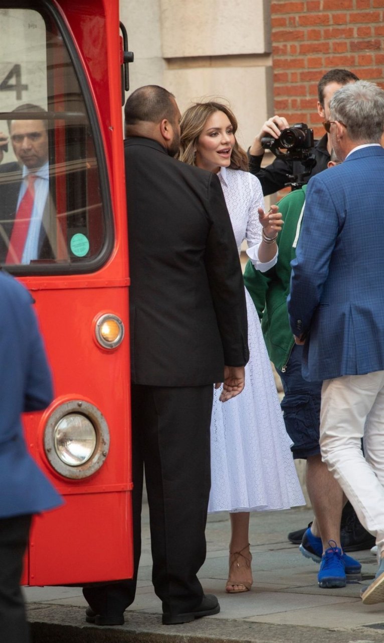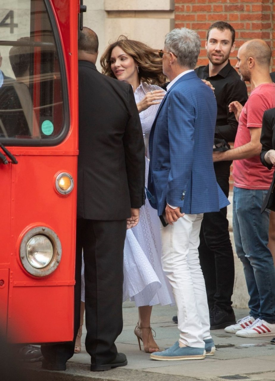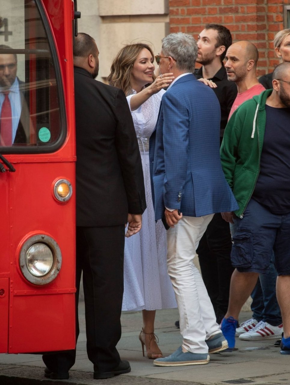 Actrice et star de The Fappening Katharine McPhee et David Foster ont été vus lors de la tournée du bus de l’amour à Londres, le 28/06/2019. Les tourtereaux ont été aperçus avec leurs invités lors d’une visite pré-mariage de Londres à bord de bus à toit ouvert où ils ont bu du champagne. Les invités étaient accompagnés de personnages sosies qui montaient et descendaient du bus, notamment Donald Trump, la Reine, des policiers et des voleurs, Sherlock Holmes, ainsi que des rois et reines perliers traditionnels.