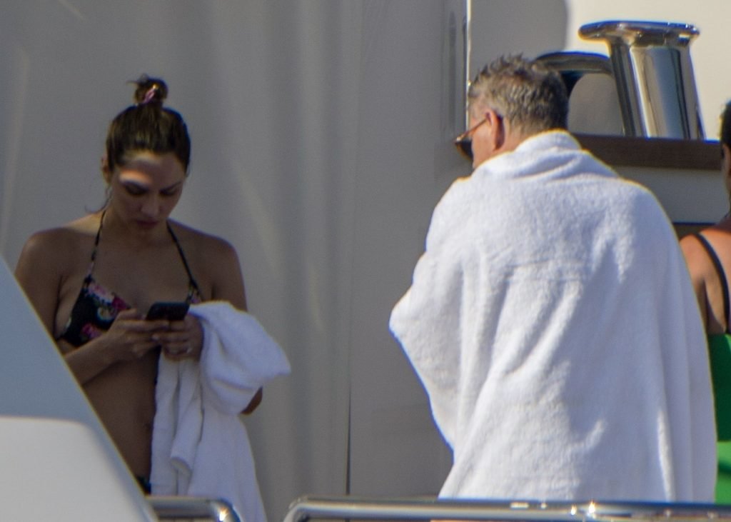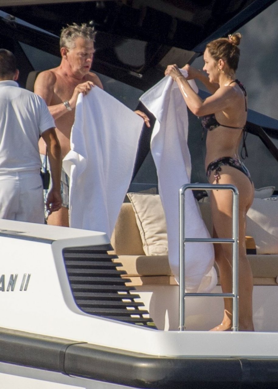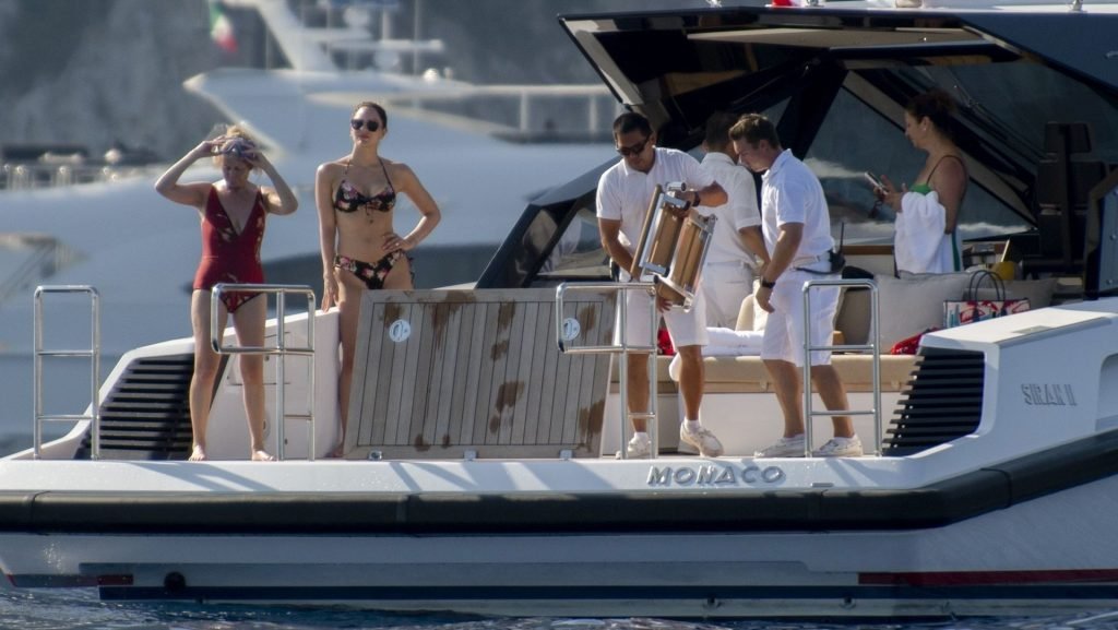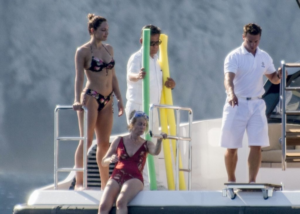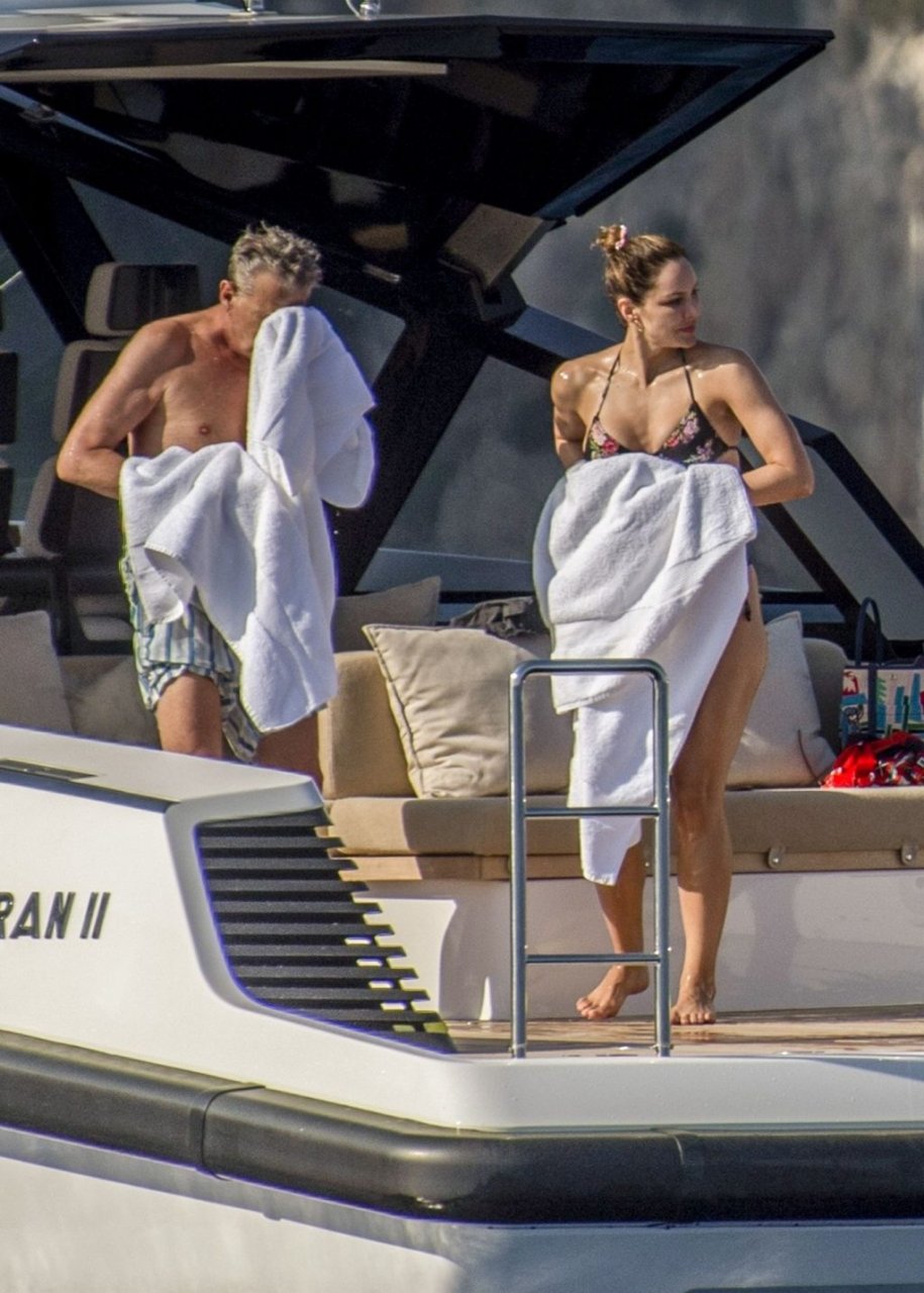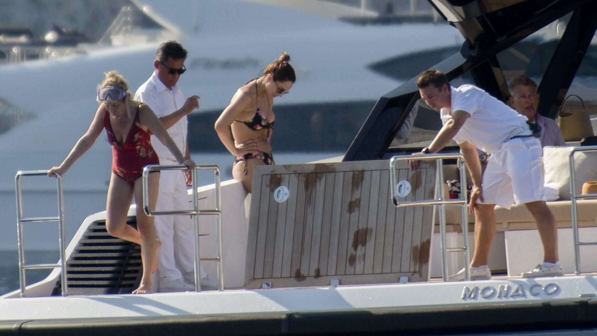 Les jeunes mariés Katharine McPhee et David Foster se baignent dans l’océan tout en se relaxant sur leur yacht pendant leur lune de miel à Capri, 03/07/2019.