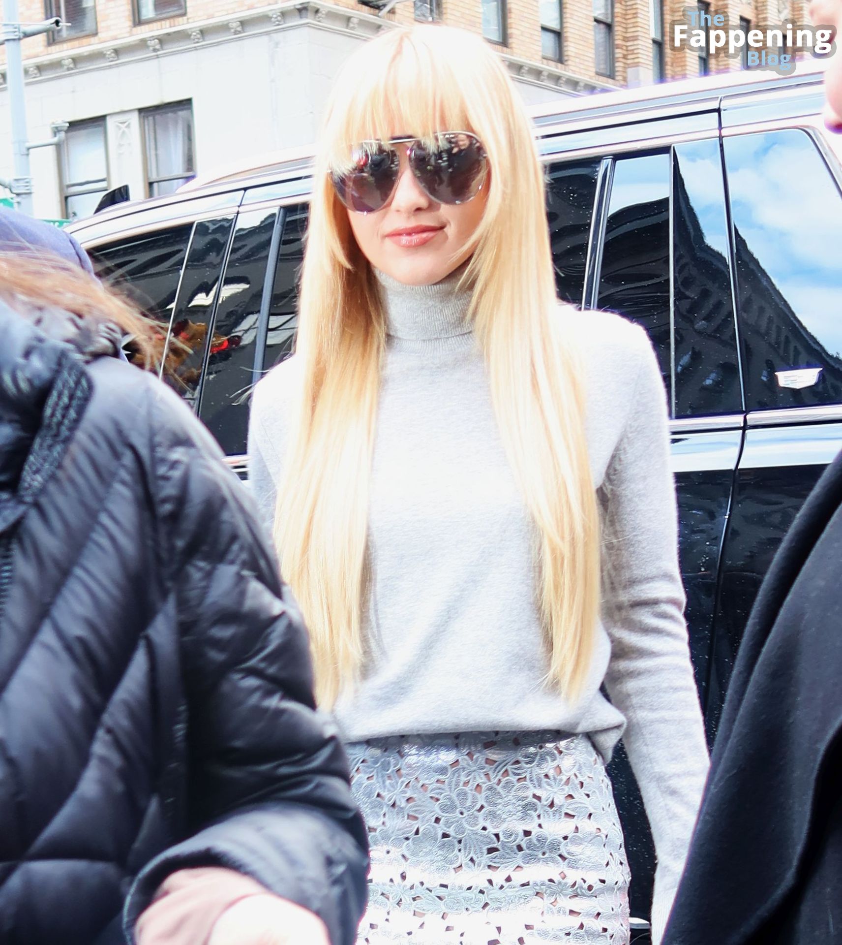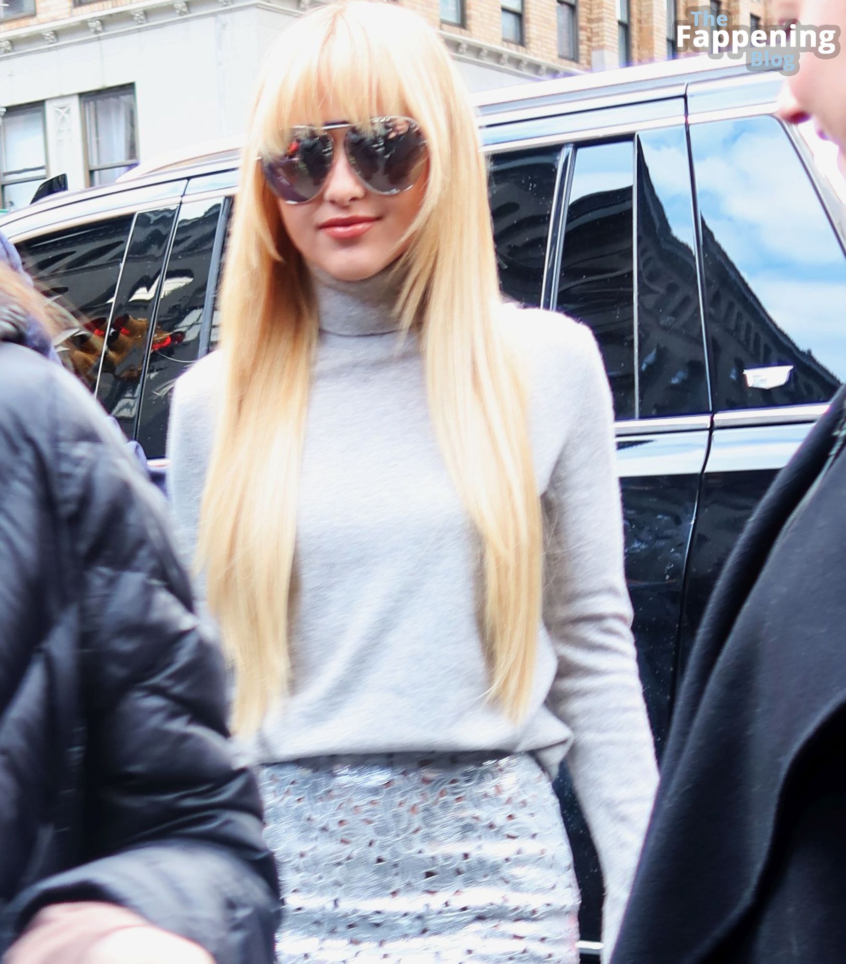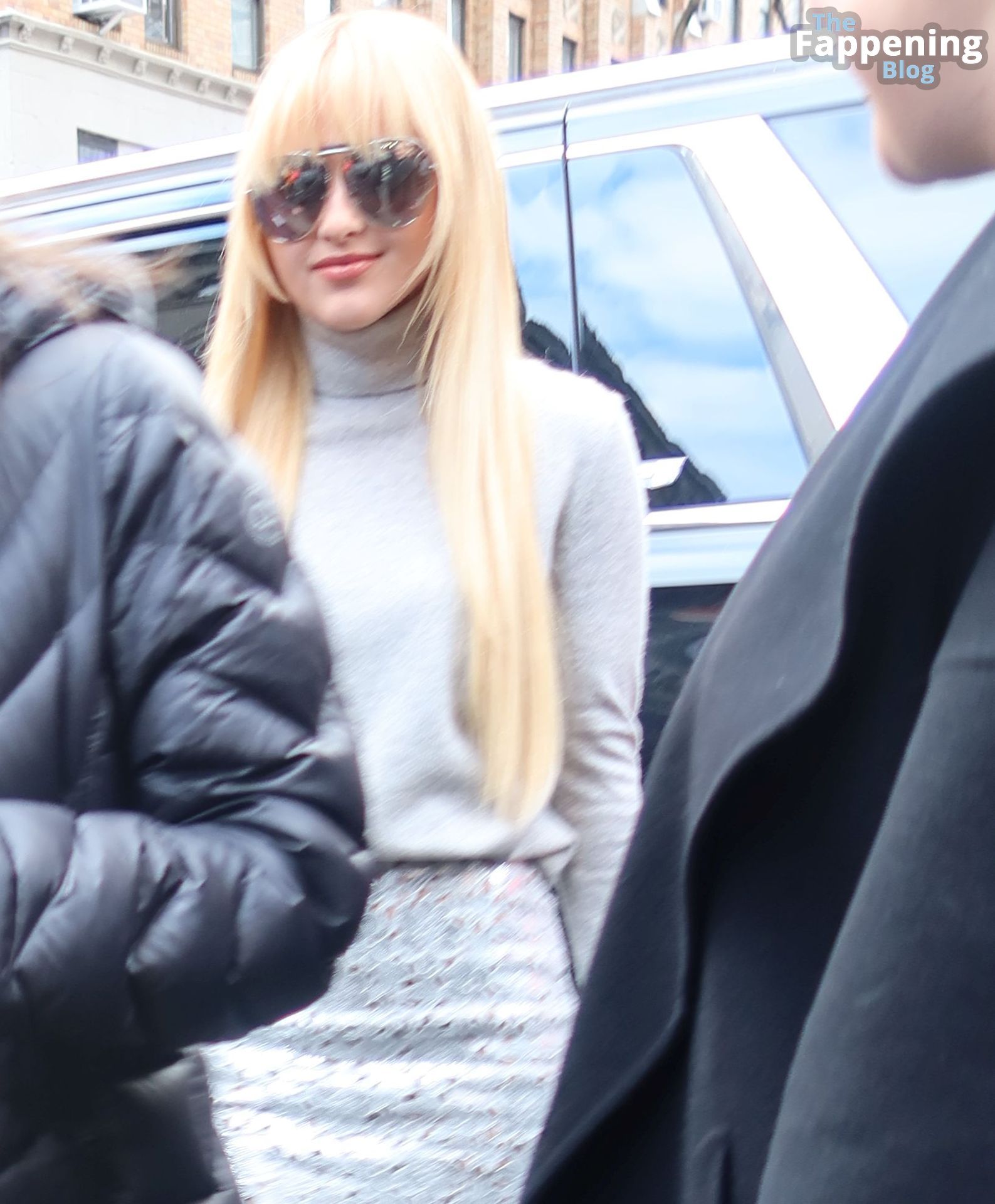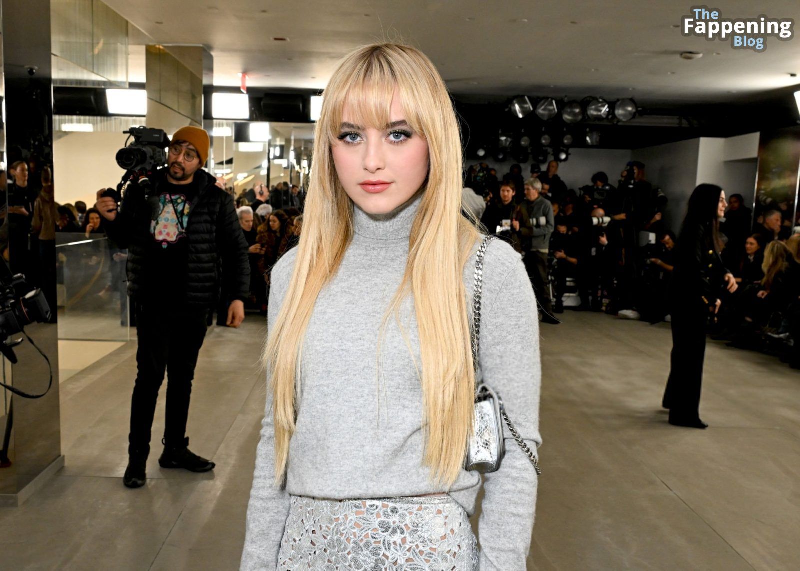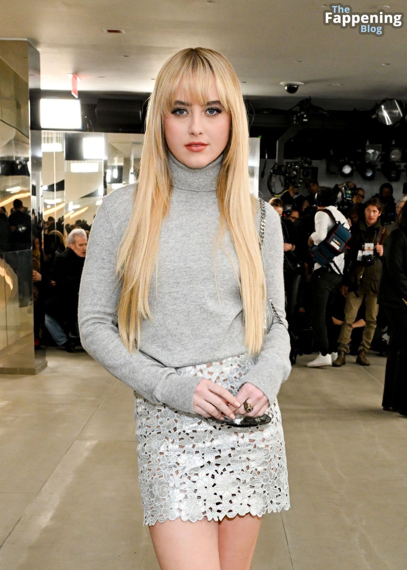 Kathryn Newton a été photographiée au défilé Michael Kors à New York. L’actrice américaine de 27 ans portait un chemisier à col roulé gris associé à une minijupe argentée, un sac à main argenté et des talons.