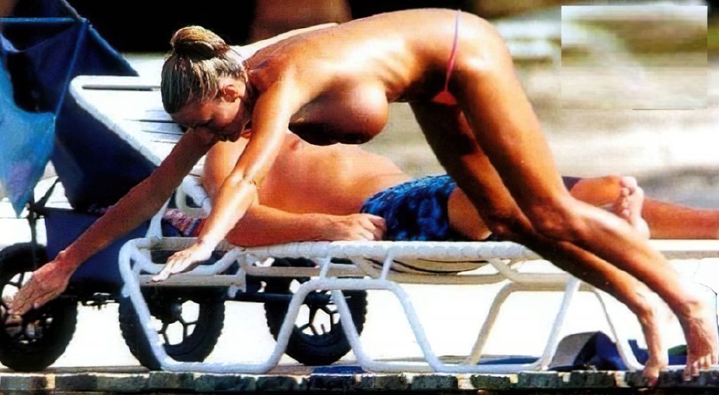 Découvrez les photos topless de Katie Price sur la plage d’Antigua avec Scott Sullivan (2004). Le mannequin profite de ses vacances, exhibant ses énormes faux seins.