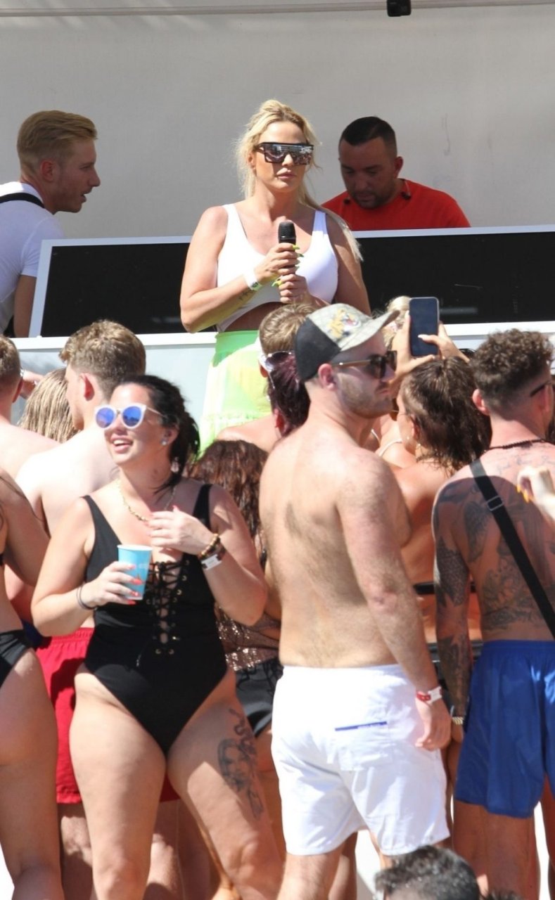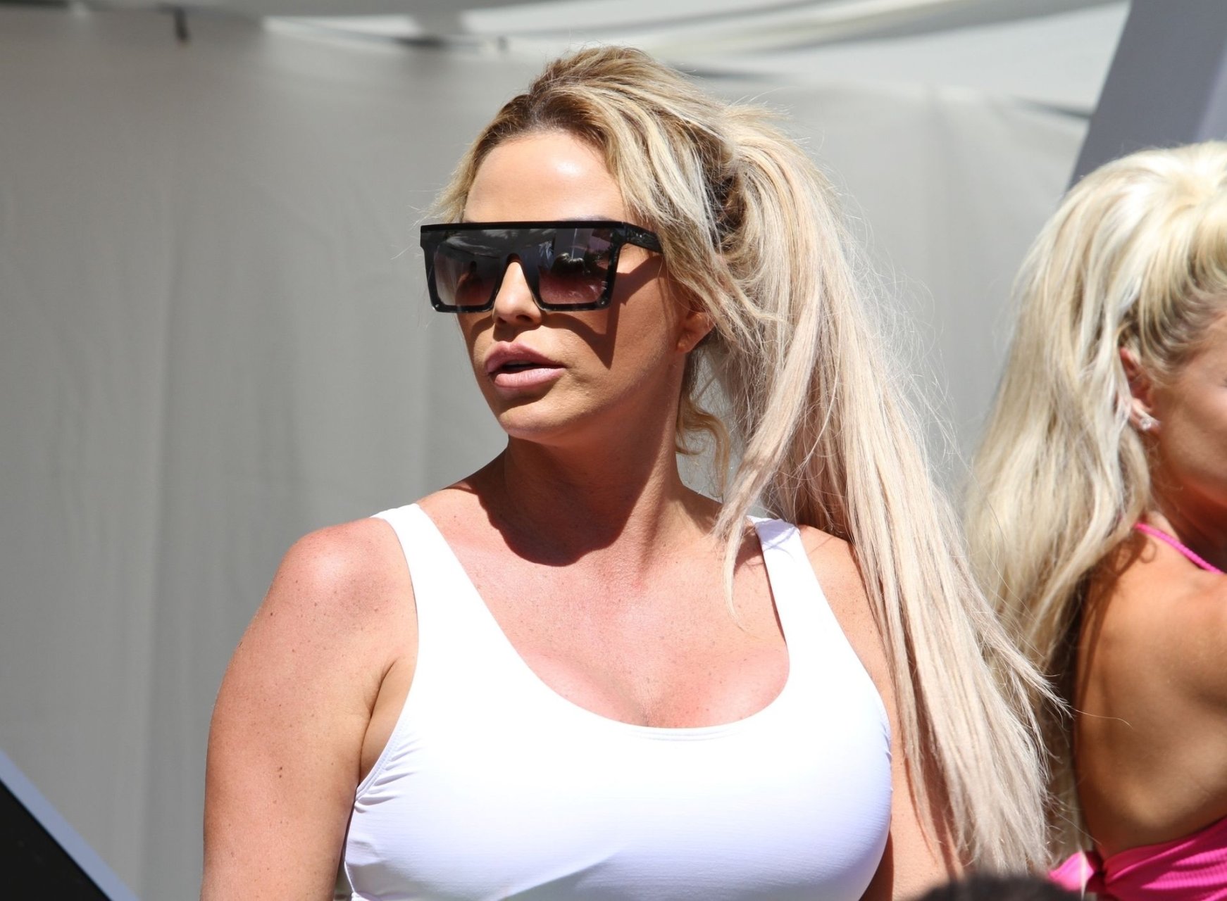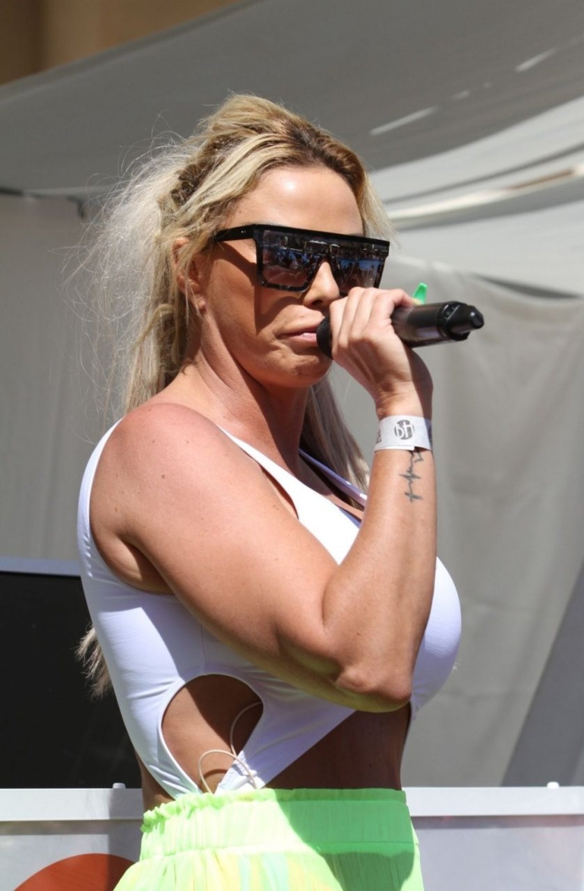 Busty Katie Price a été vue en bikini blanc/orange et une jupe transparente vert néon sur scène en train de performer son nouveau single “Hurricane” à Majorque, le 15/06/2019.