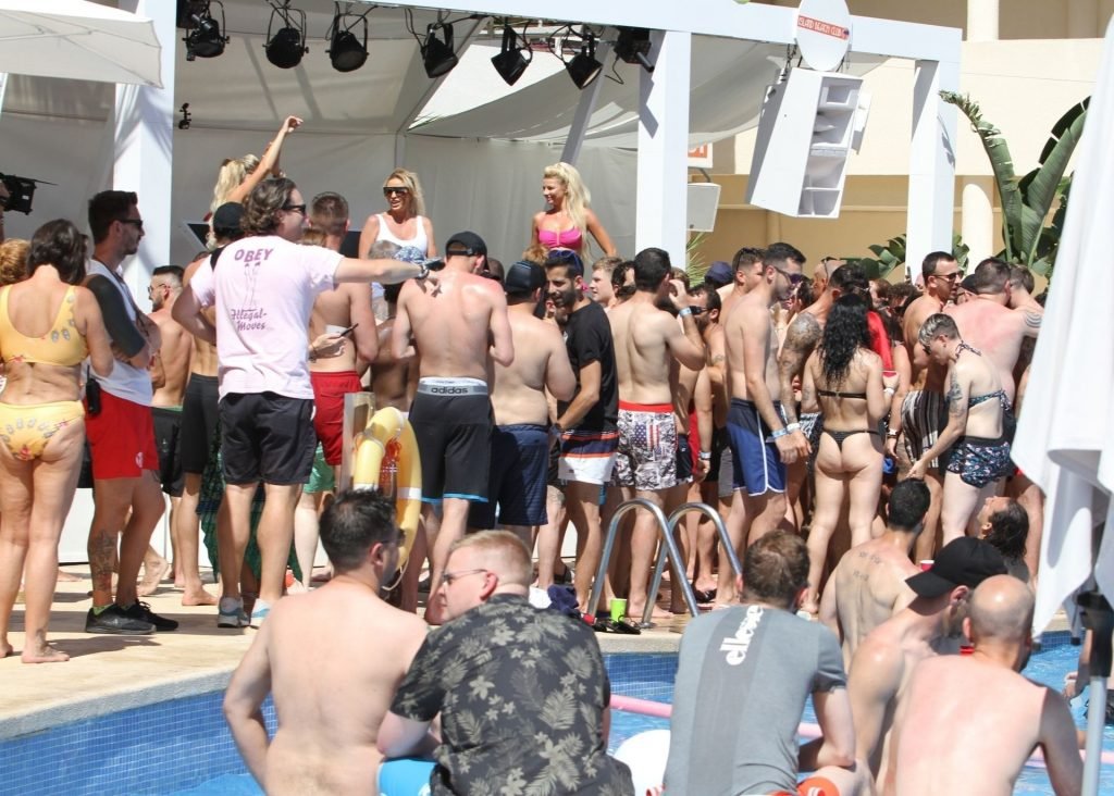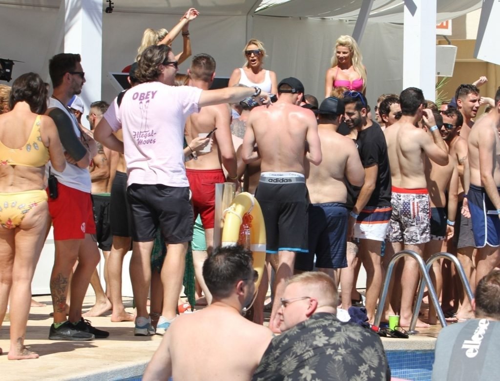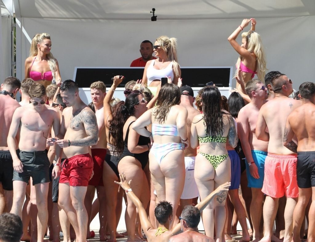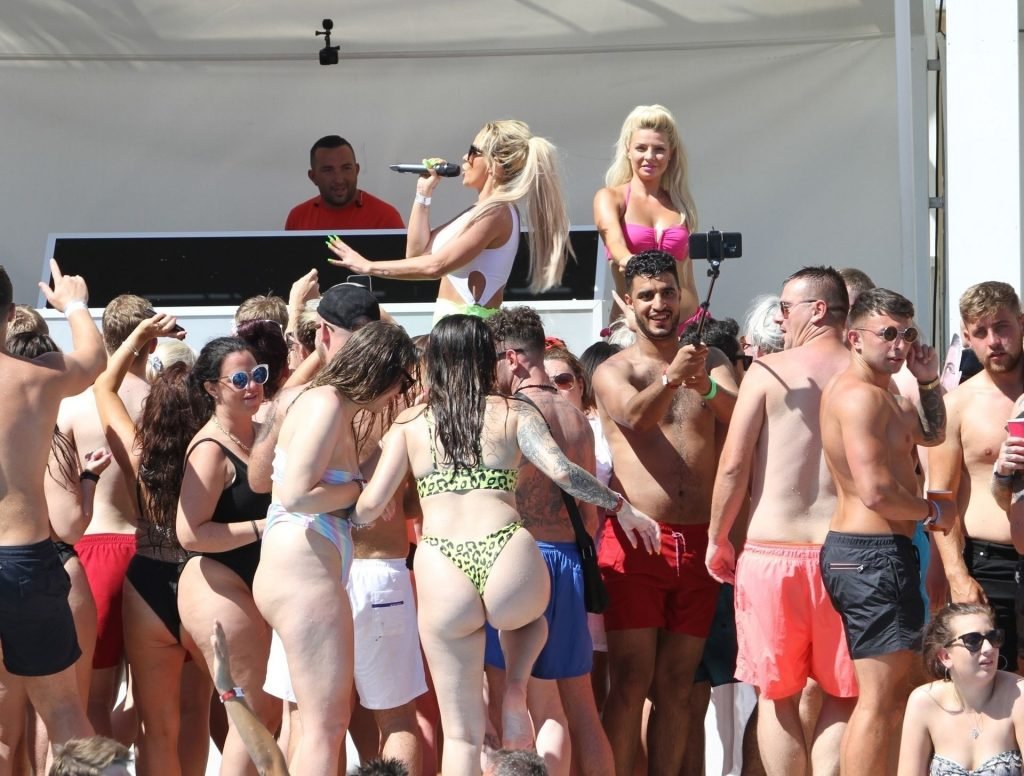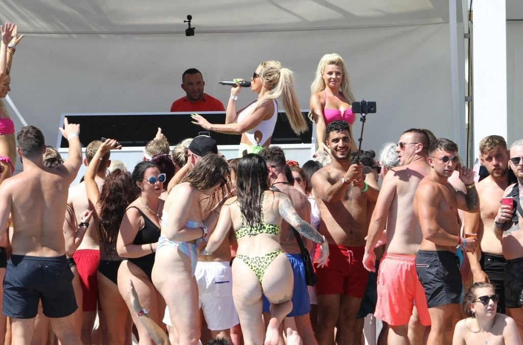Busty Katie Price a été vue en bikini blanc/orange et une jupe transparente vert néon sur scène en train de performer son nouveau single “Hurricane” à Majorque, le 15/06/2019.
