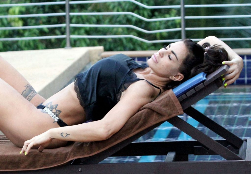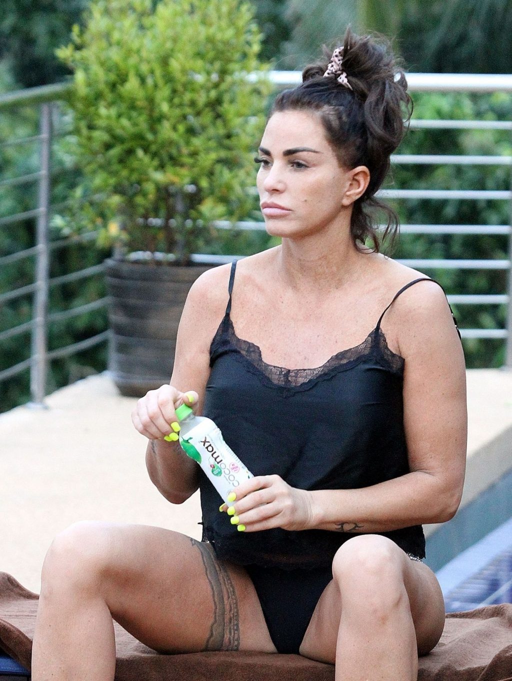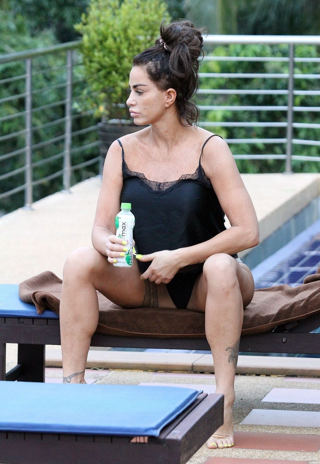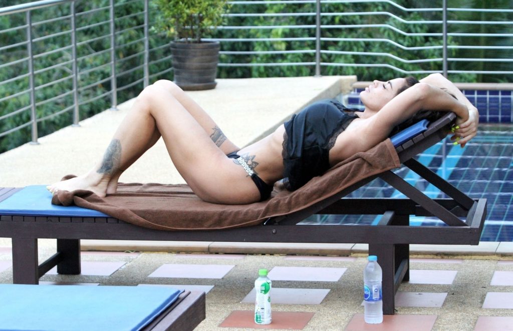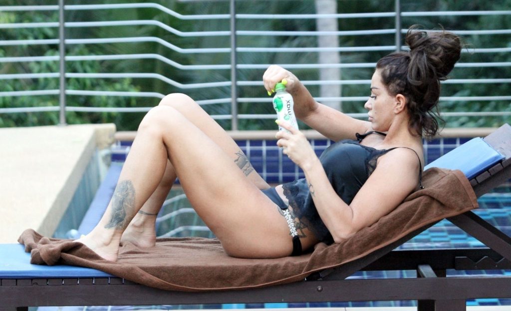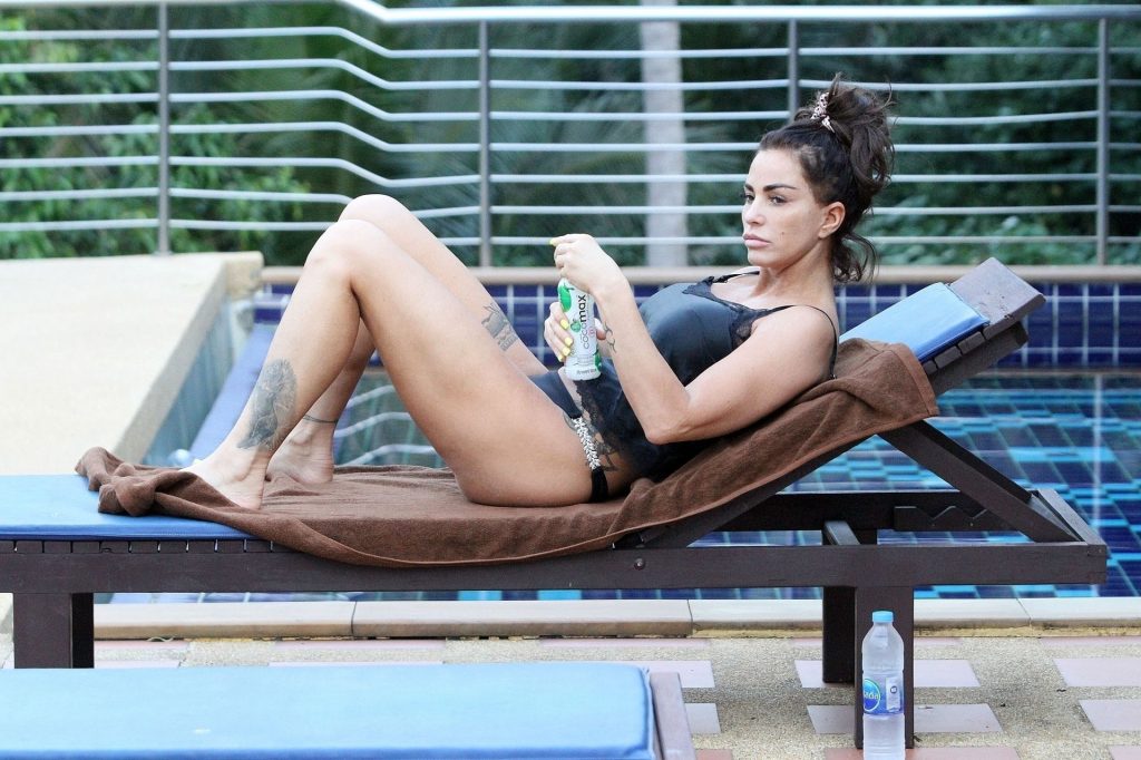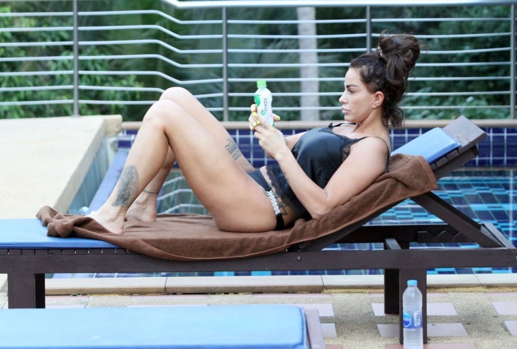 Katie Price (alias Jordan) a été photographiée en train de se détendre sur une chaise longue pendant ses vacances en Thaïlande, le 01/03/2020. Le mannequin glamour semblait très détendue en profitant du soleil en Thaïlande !