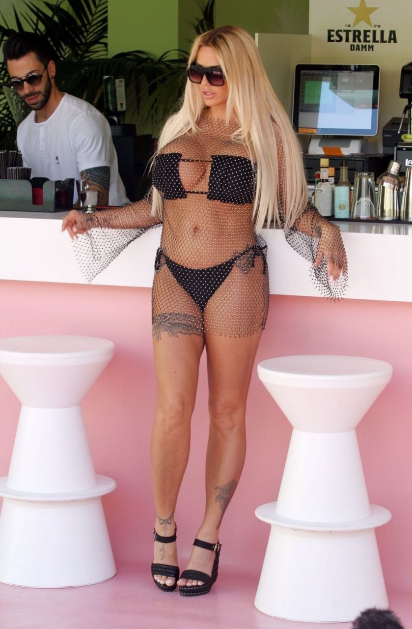 Katie Price (Jordan) se trouve au bar avec une boisson fraîche, la commande du jour. Katie fait monter la température en portant son magnifique bikini en maille noire tout en faisant une pause dans le tournage de sa nouvelle collection d’été avec la marque de vêtements JYY London à Majorque (2019).