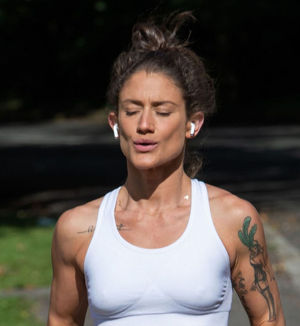 La chanteuse Katie Waissel est vue en train de courir sous une chaleur de 26 degrés à Londres, le 16/09/2020. La star de Celebrity Big Brother porte des leggings verts et un crop top blanc qui mettent en valeur ses abdominaux incroyables.