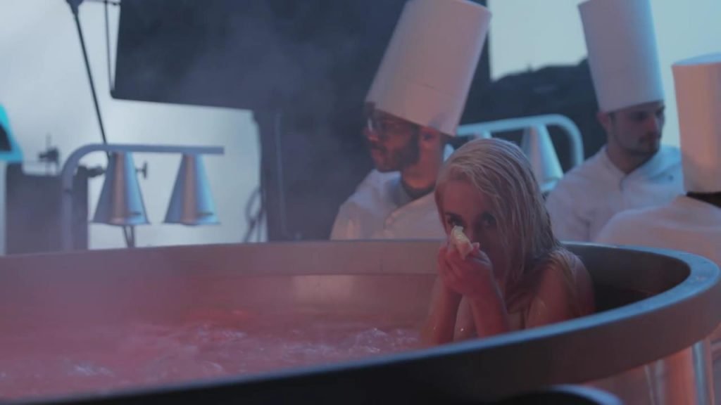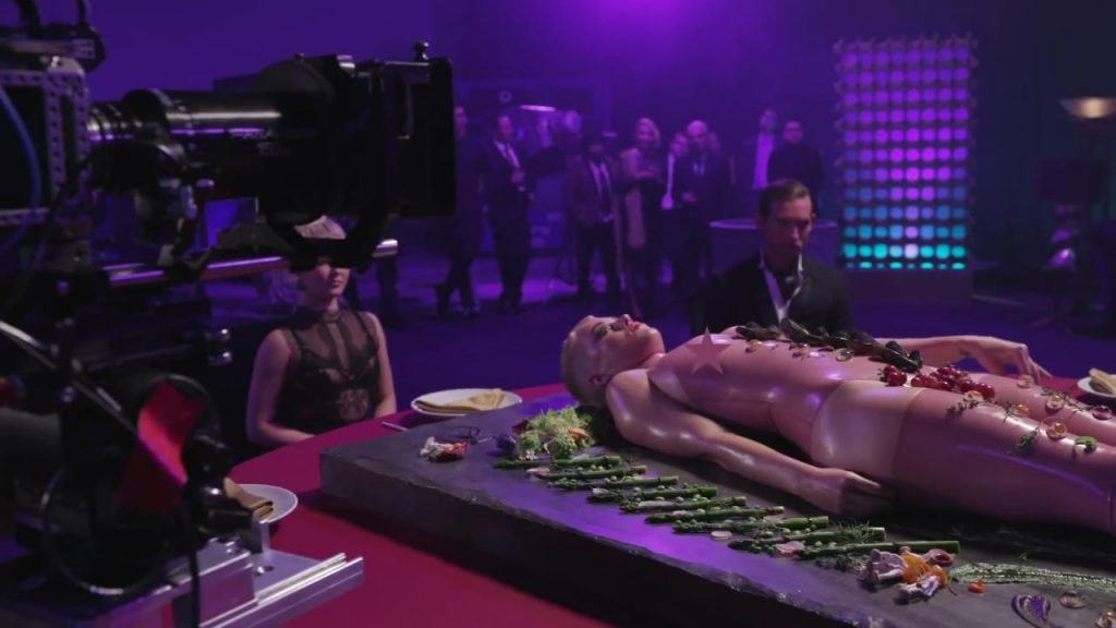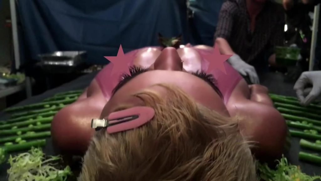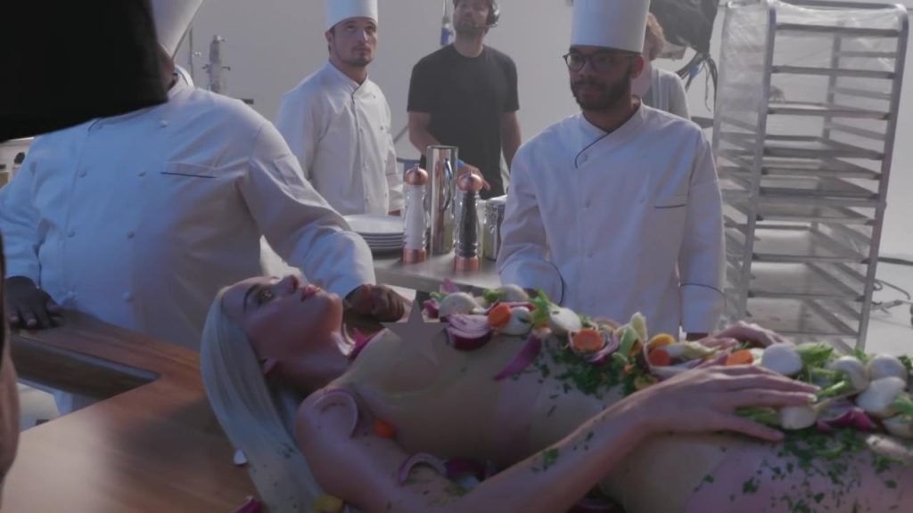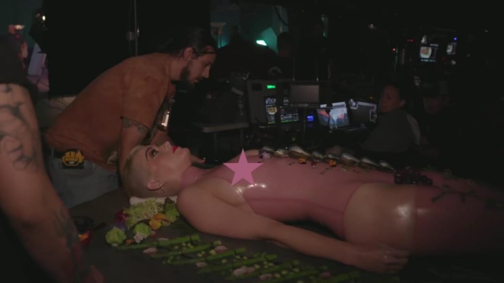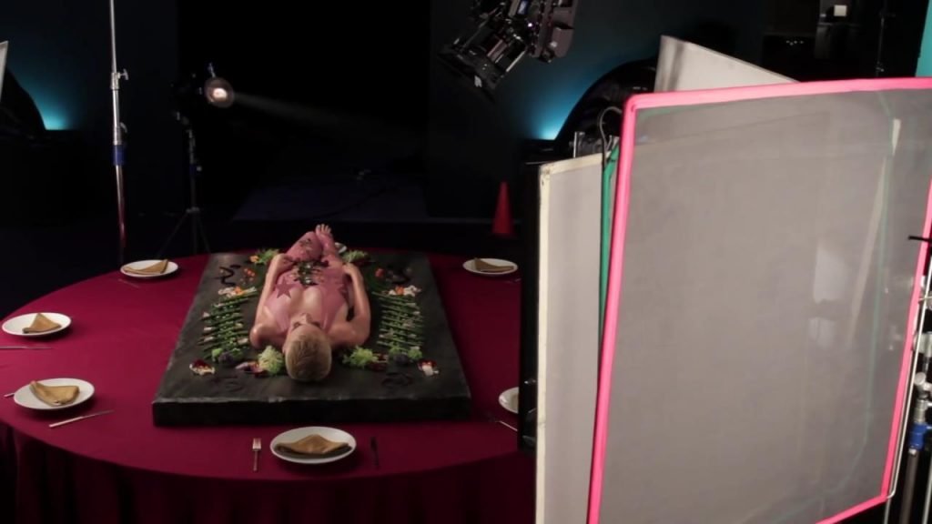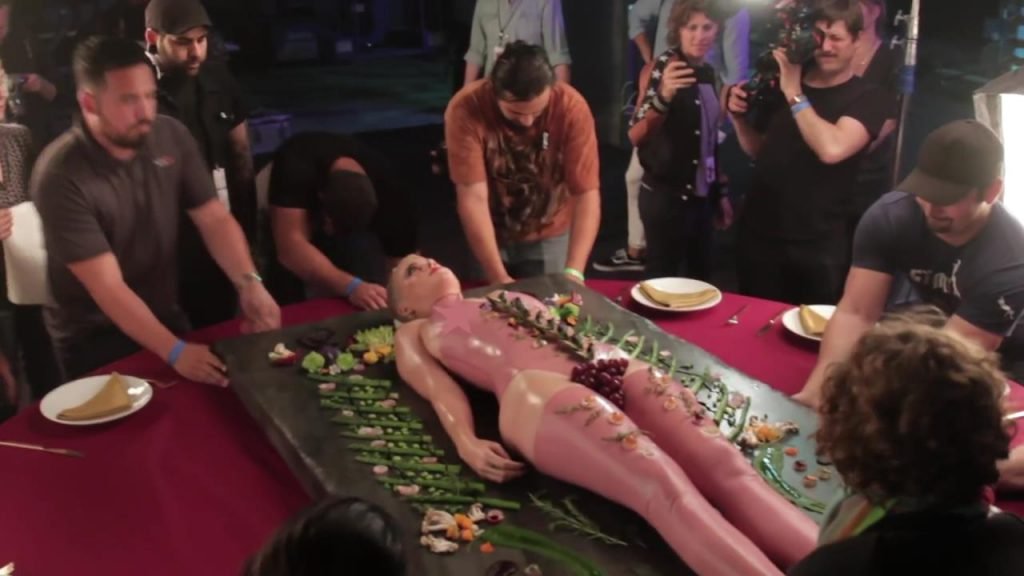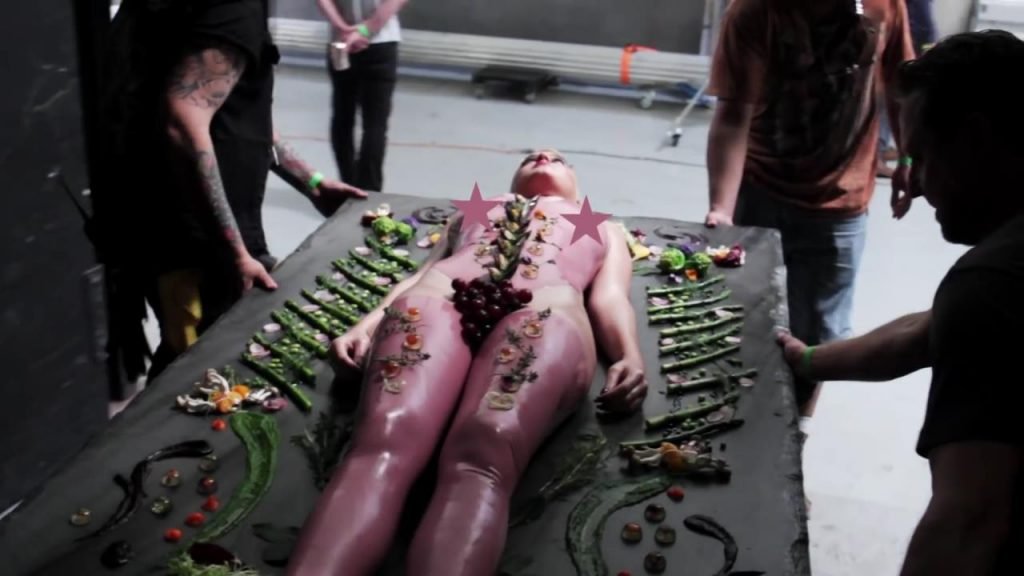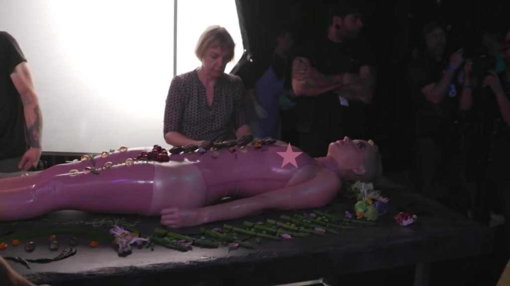 Elle se dit féministe, puis s'allonge sur la table, presque nue, laissant les gens manger sur elle...