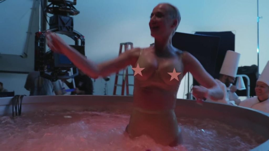 À 1:14 dans la vidéo, le montage n'est pas assez bon car l'étoile sur son sein droit bouge juste assez pour montrer un peu et confirmer que l'on peut voir à travers.