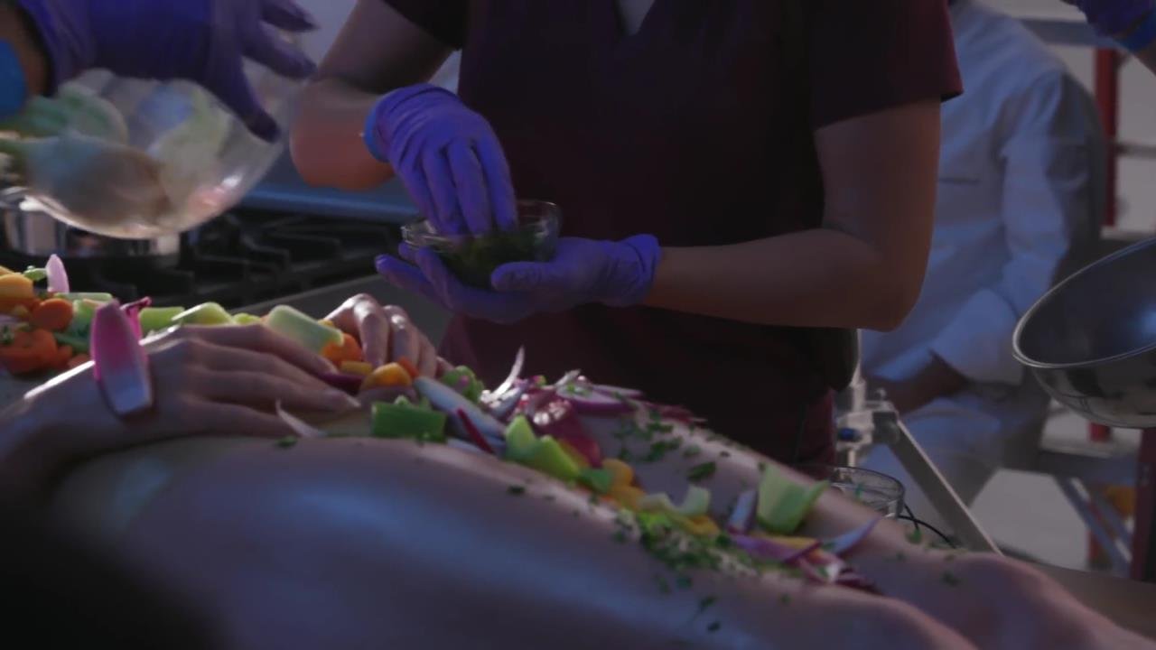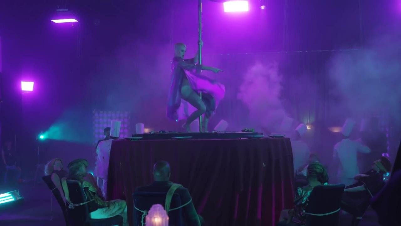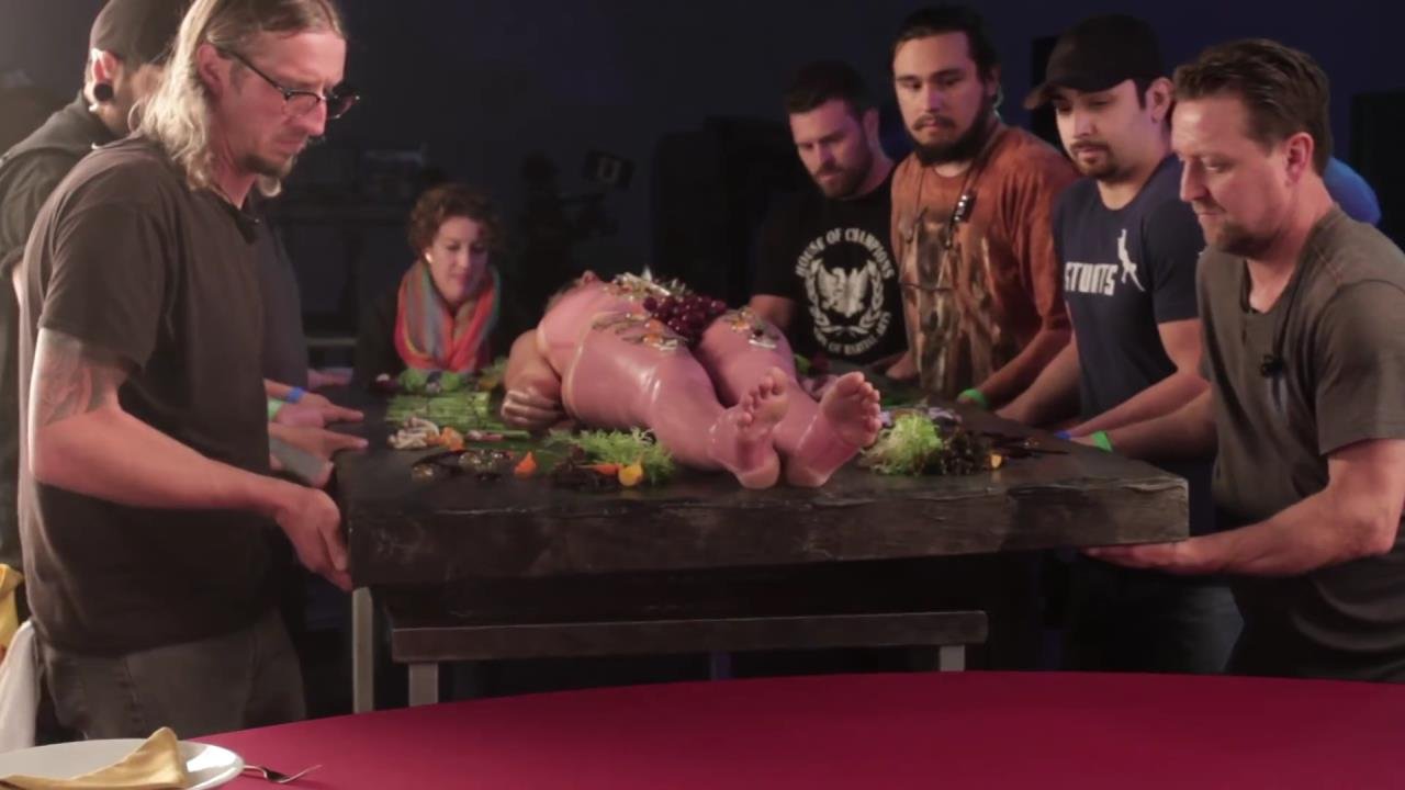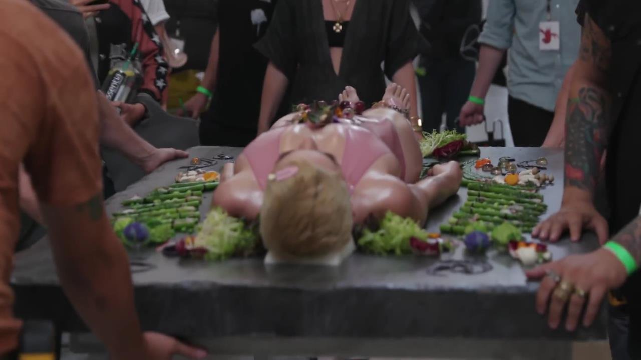 Elle se dit féministe, puis s'allonge sur la table, presque nue, laissant les gens manger sur elle...