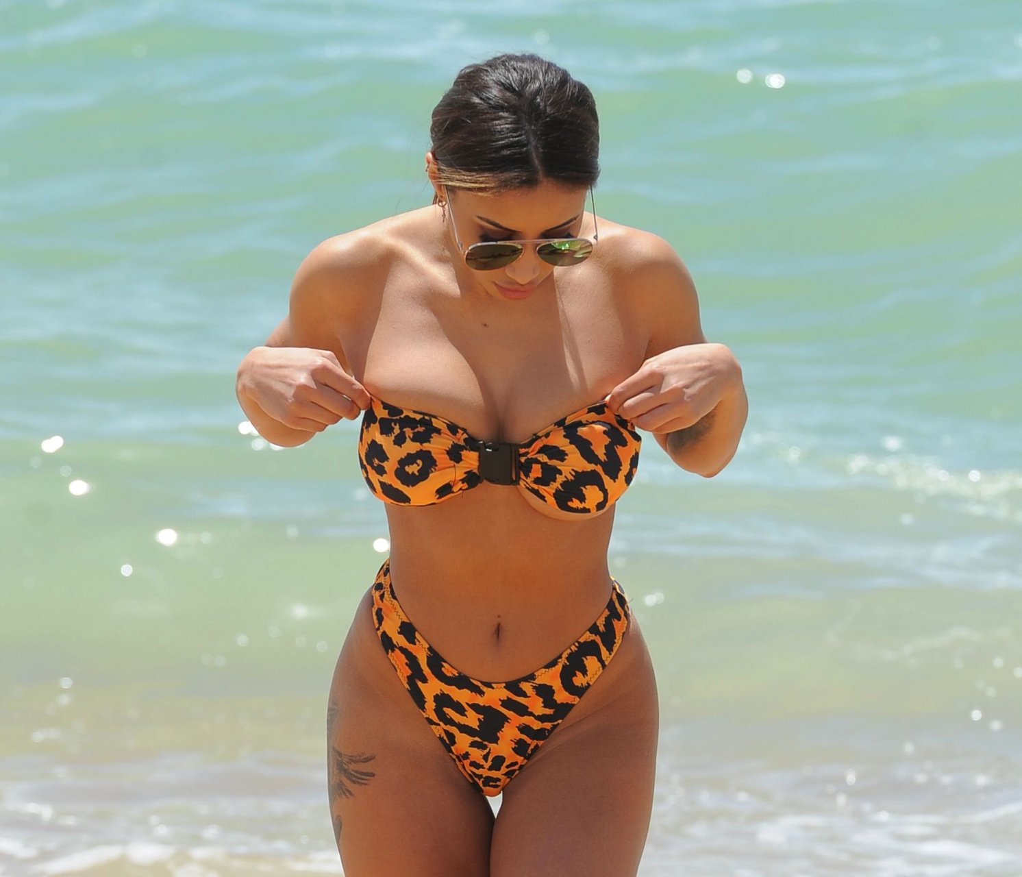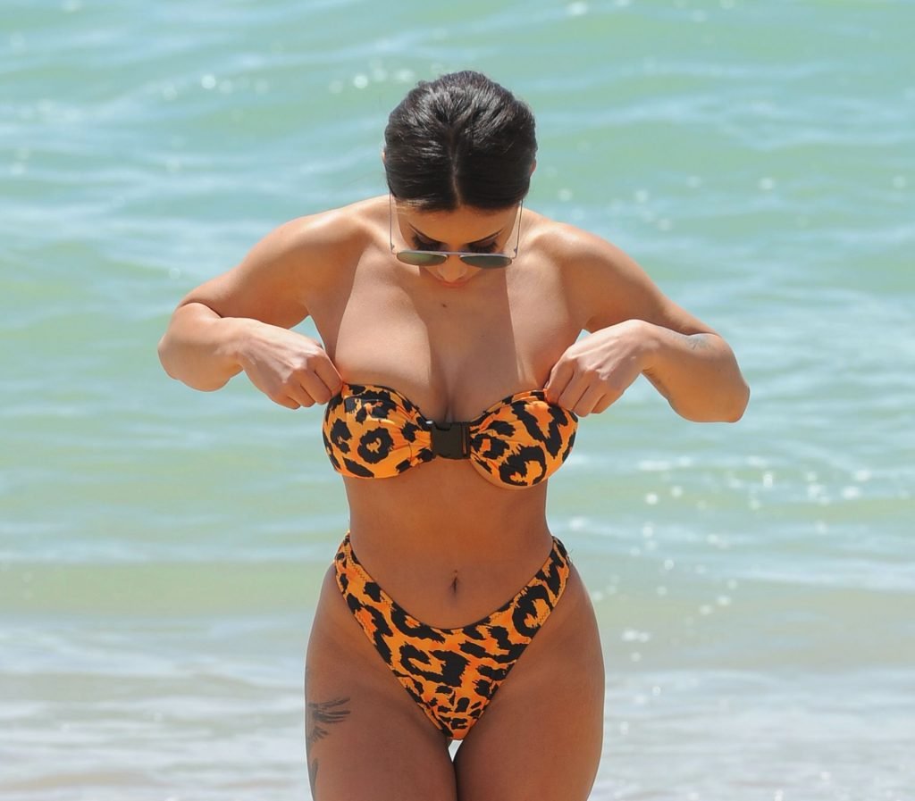 “Big Brother” et star de “Ex on the Beach” Kayleigh Morris fait une pause sur la plage à Ibiza, en Espagne, le 16/05/2019. La bombasse bronzée a ajusté son bikini qui laissait presque entrevoir ses seins.