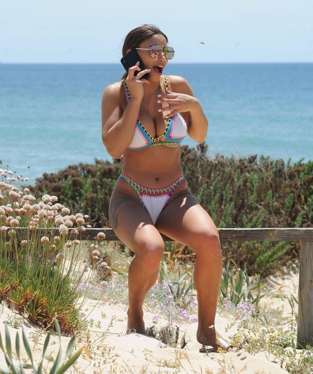 La star de la télé-réalité Kayleigh Morris est vue en train de profiter d’une journée en bikini minuscule sur la plage en Espagne, 15/07/2020.