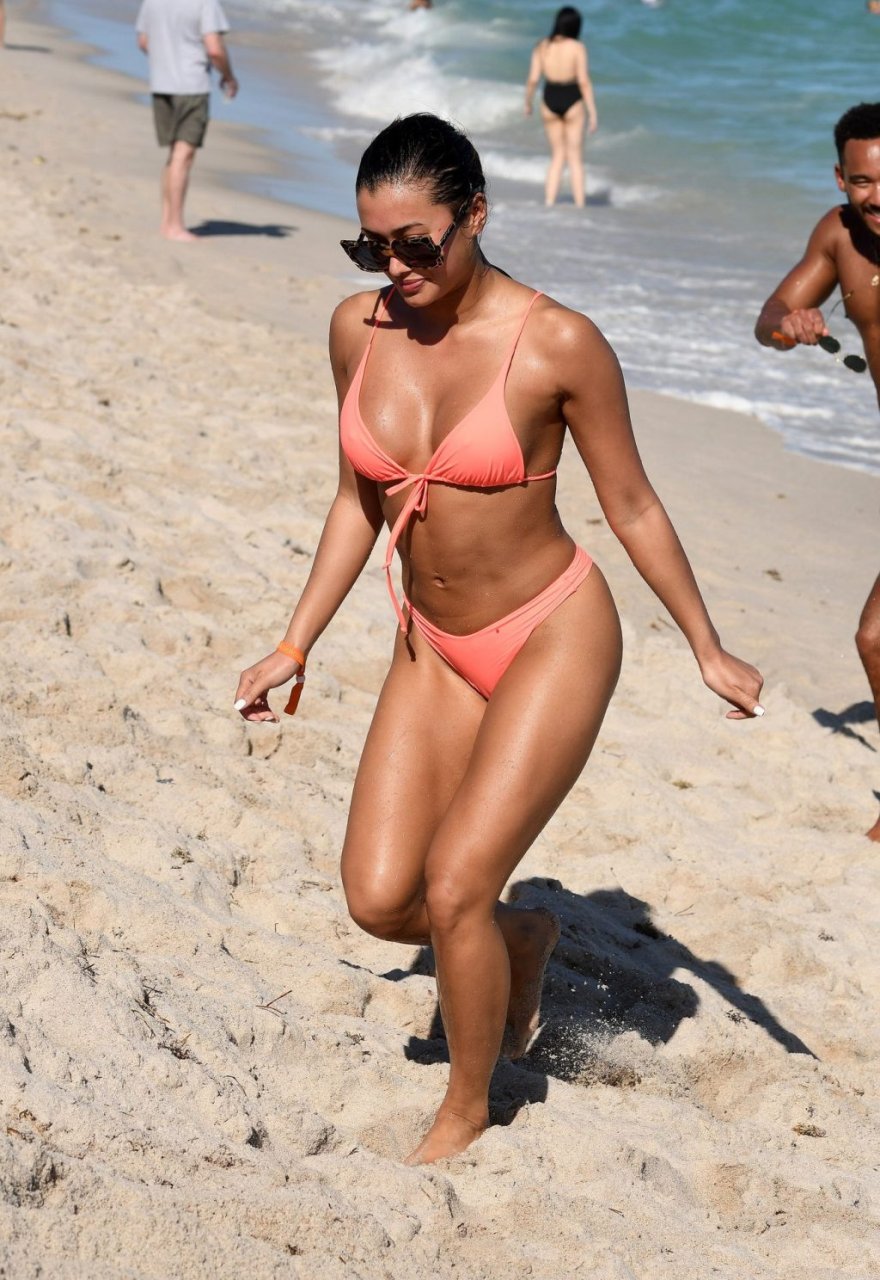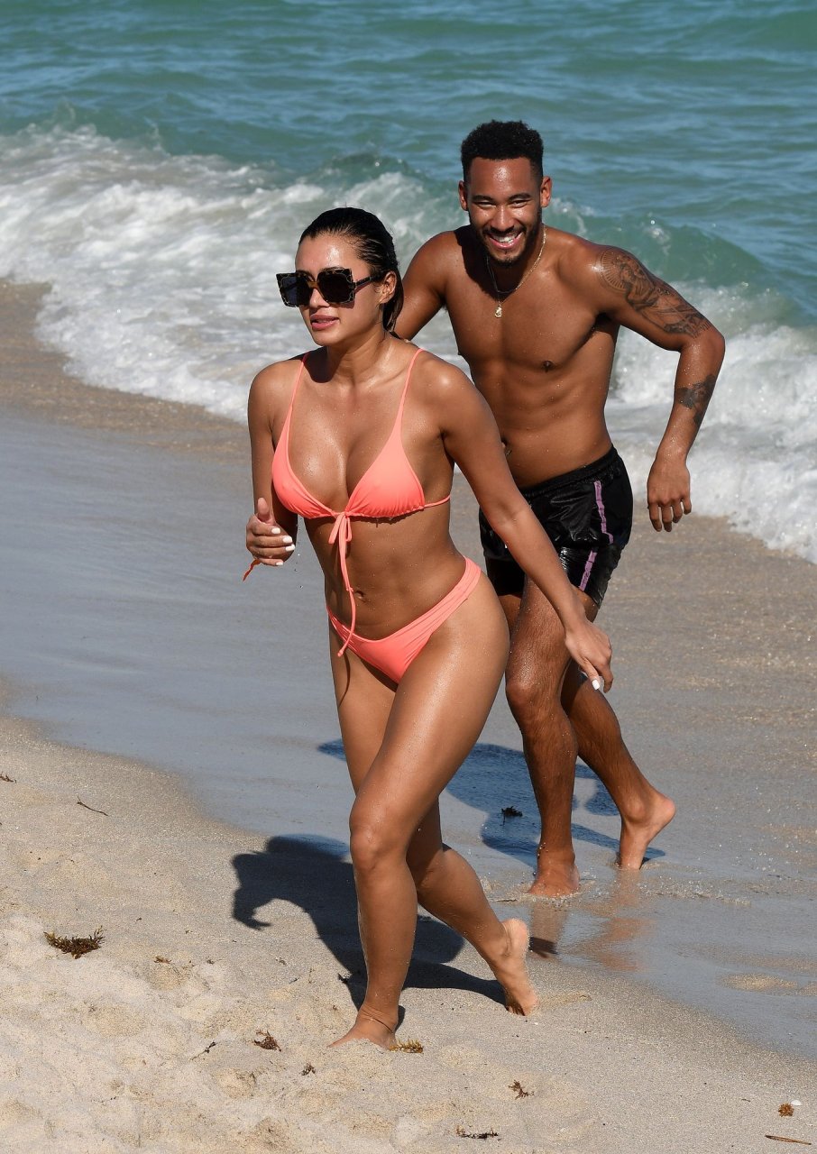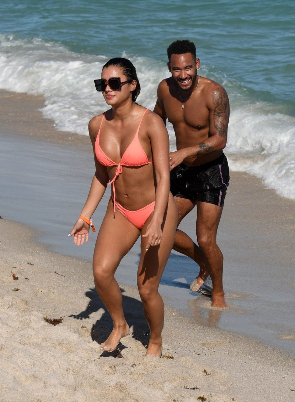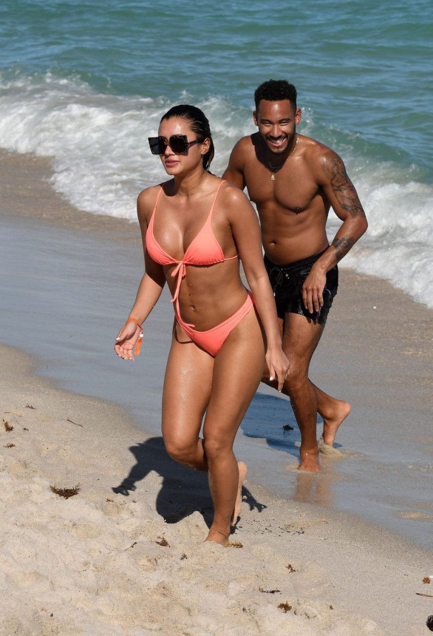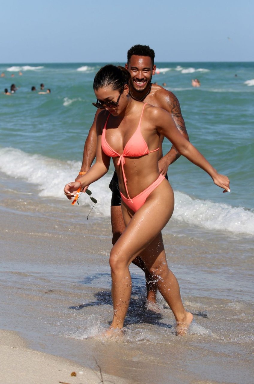 Kazimir “Kaz” Crossley de Love Island porte un bikini pêche alors qu’elle se rend à la plage avec son petit ami Josh Denzel à Miami, 01/02/2019.