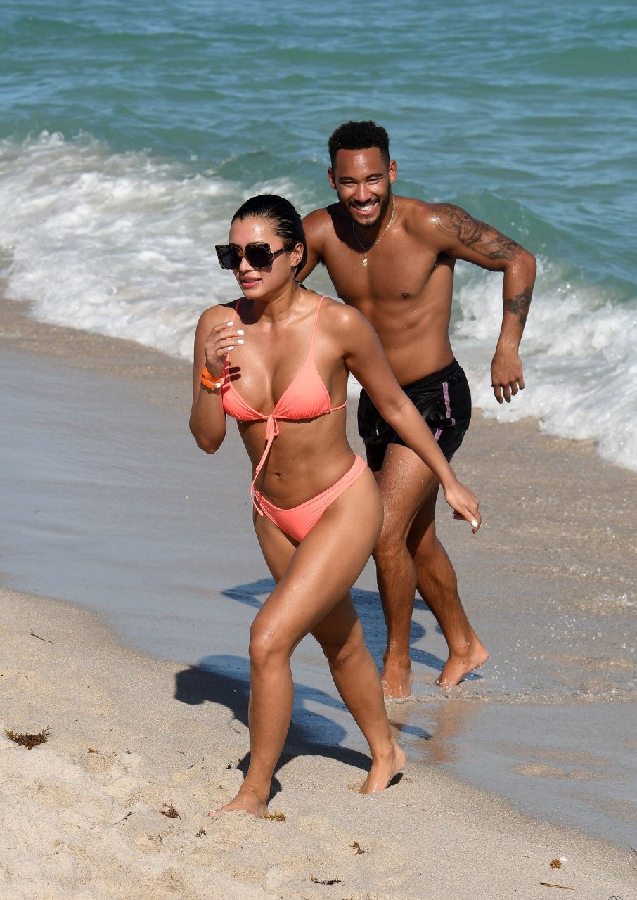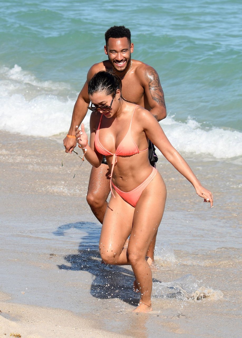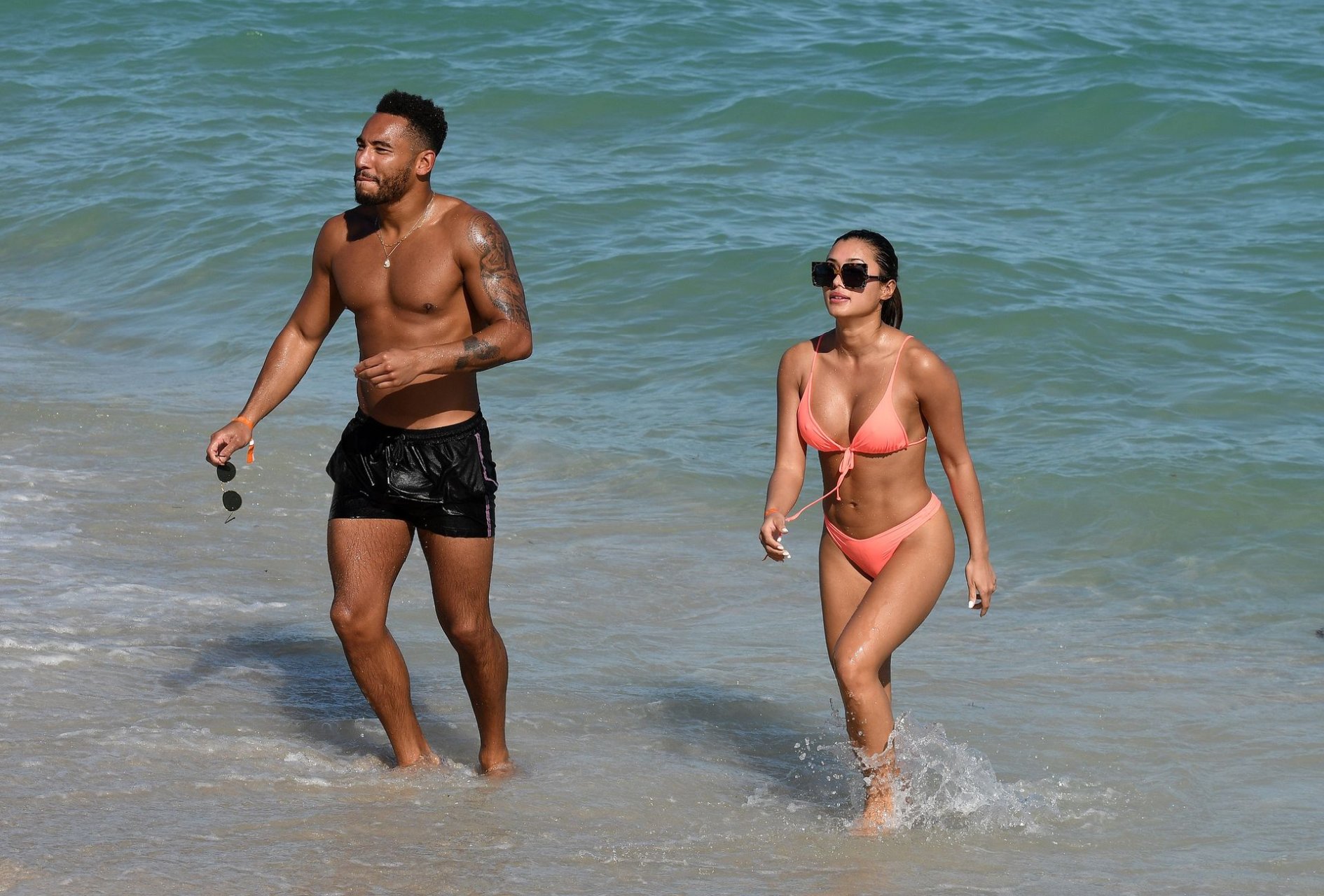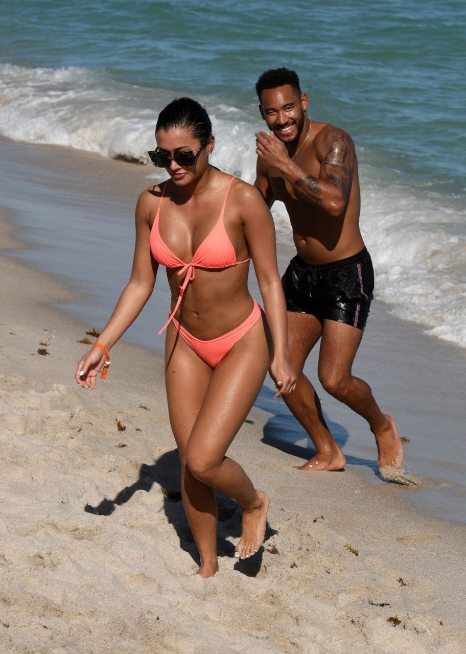 Kazimir “Kaz” Crossley de Love Island porte un bikini pêche alors qu’elle se rend à la plage avec son petit ami Josh Denzel à Miami, 01/02/2019.