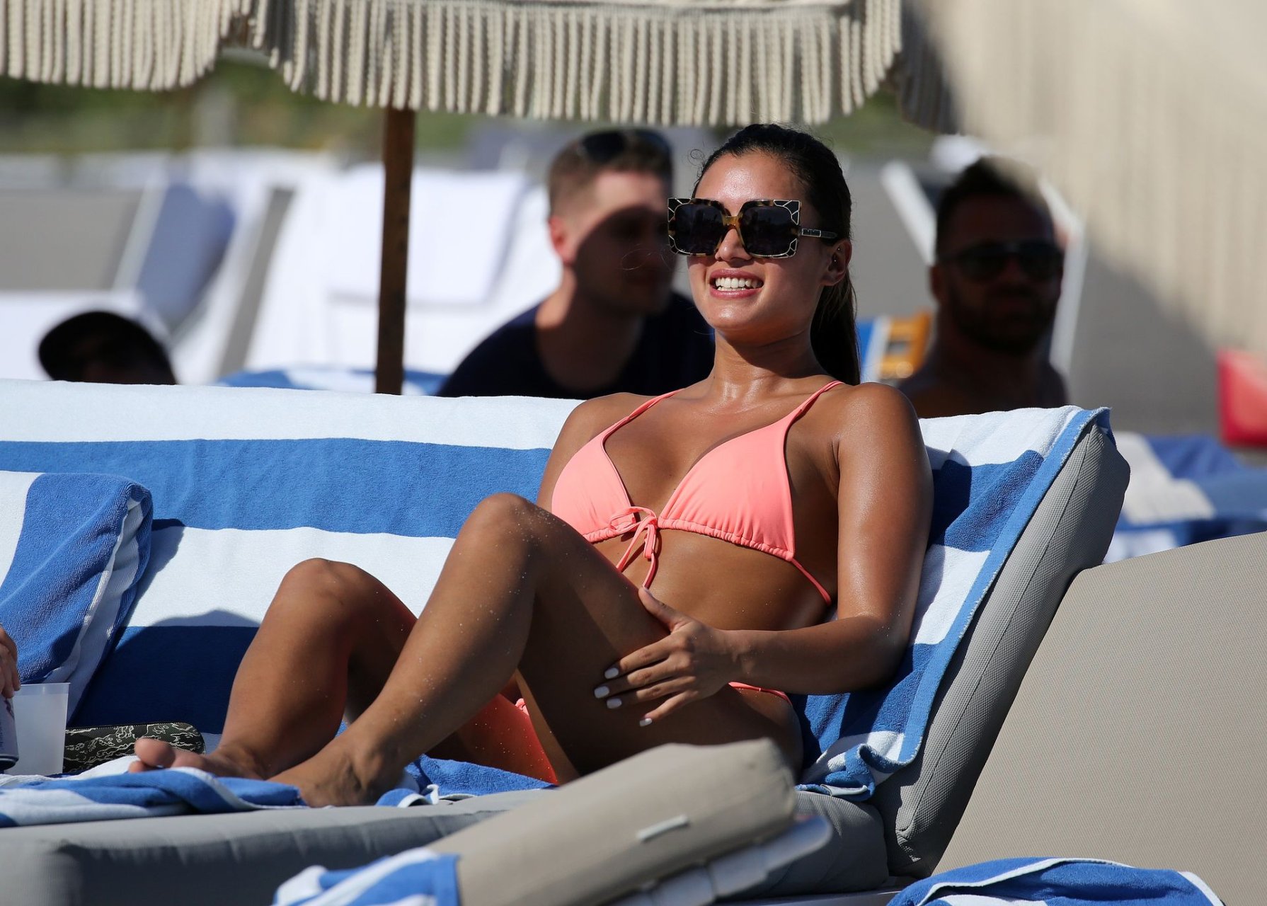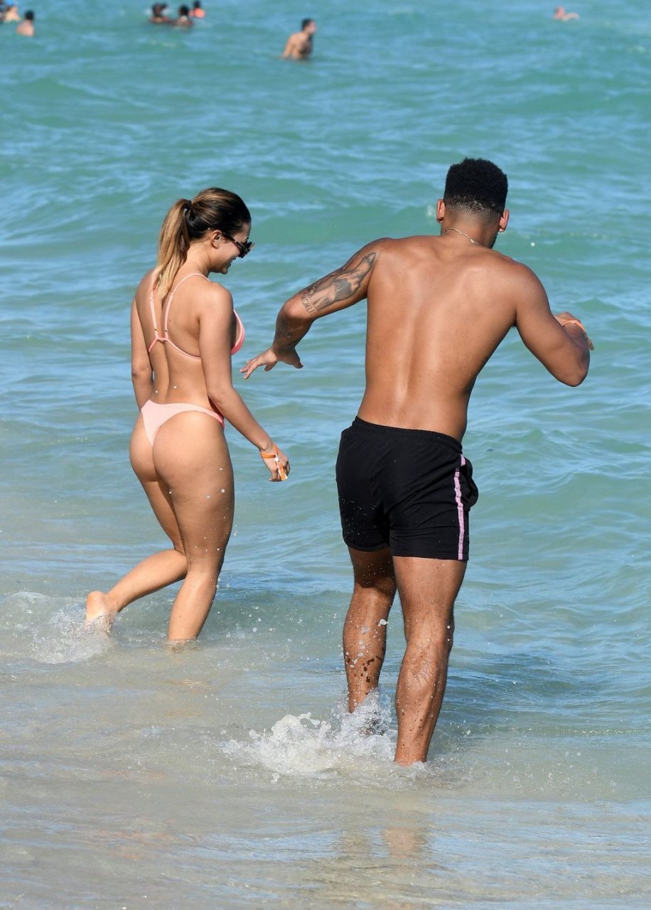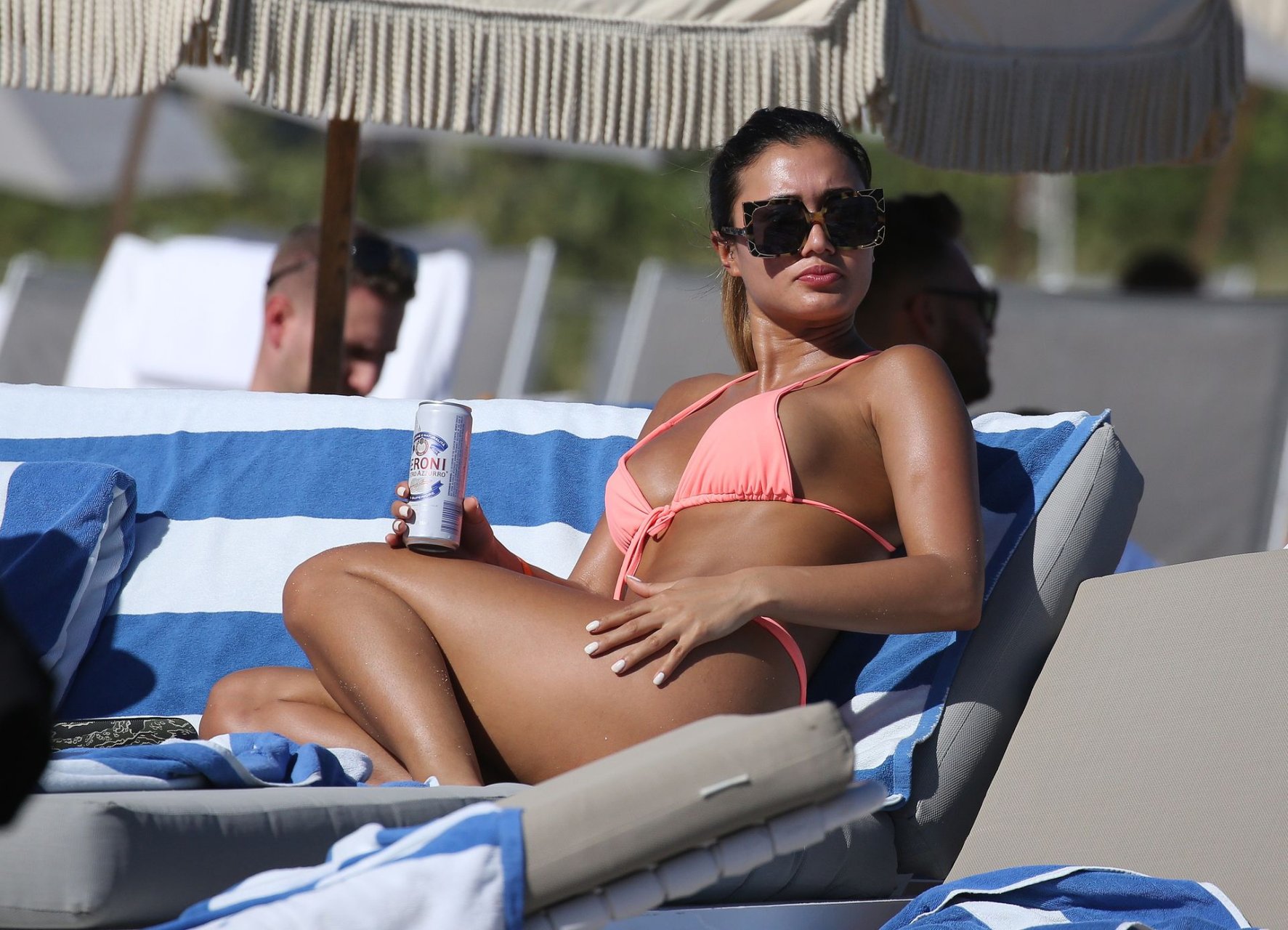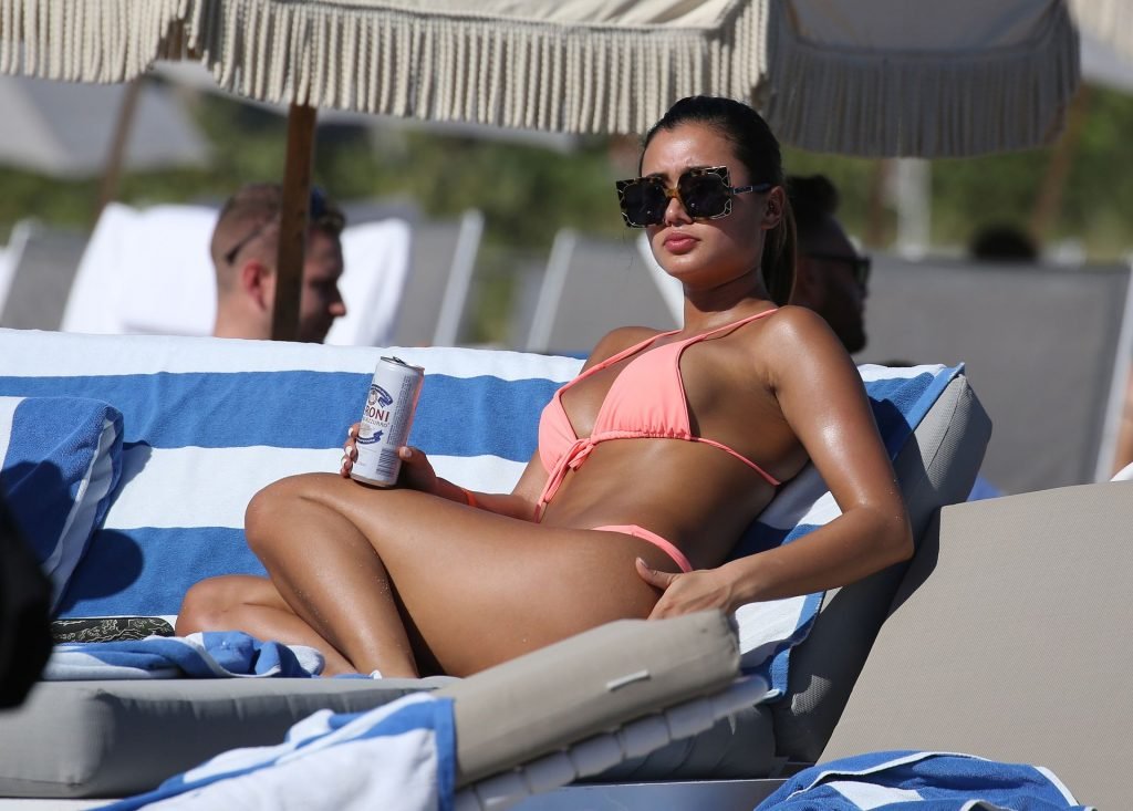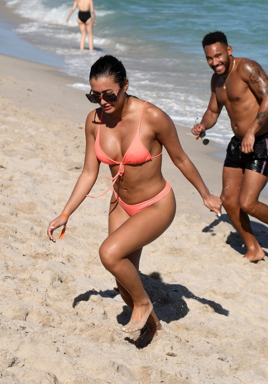 Kazimir “Kaz” Crossley de Love Island porte un bikini pêche alors qu’elle se rend à la plage avec son petit ami Josh Denzel à Miami, 01/02/2019.