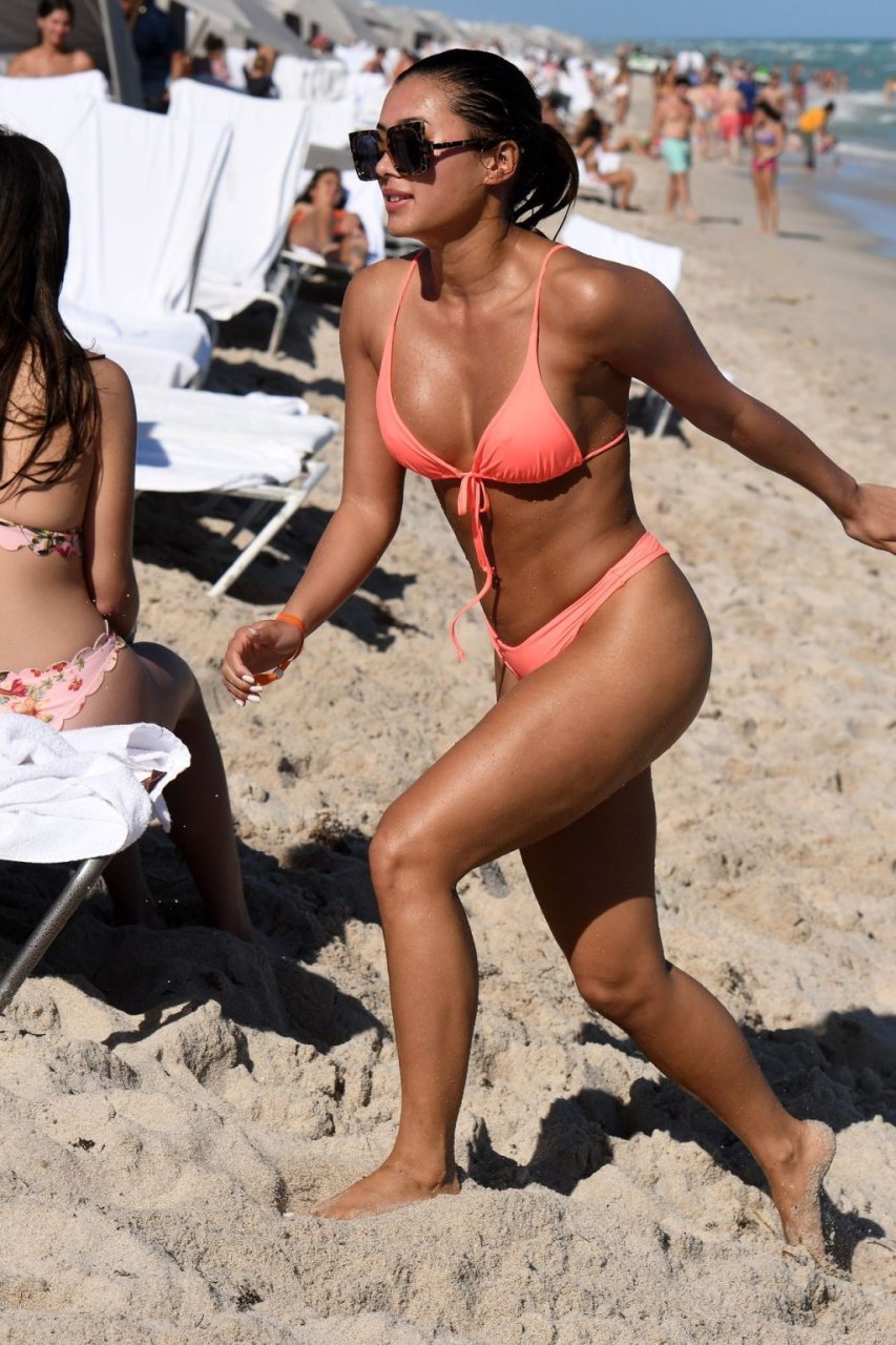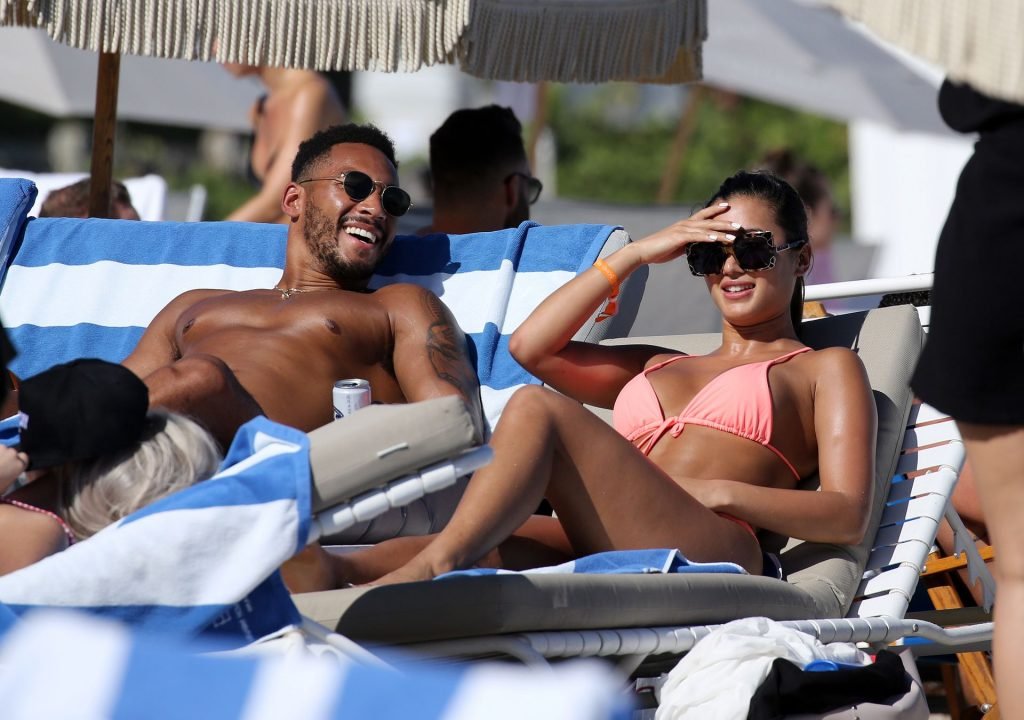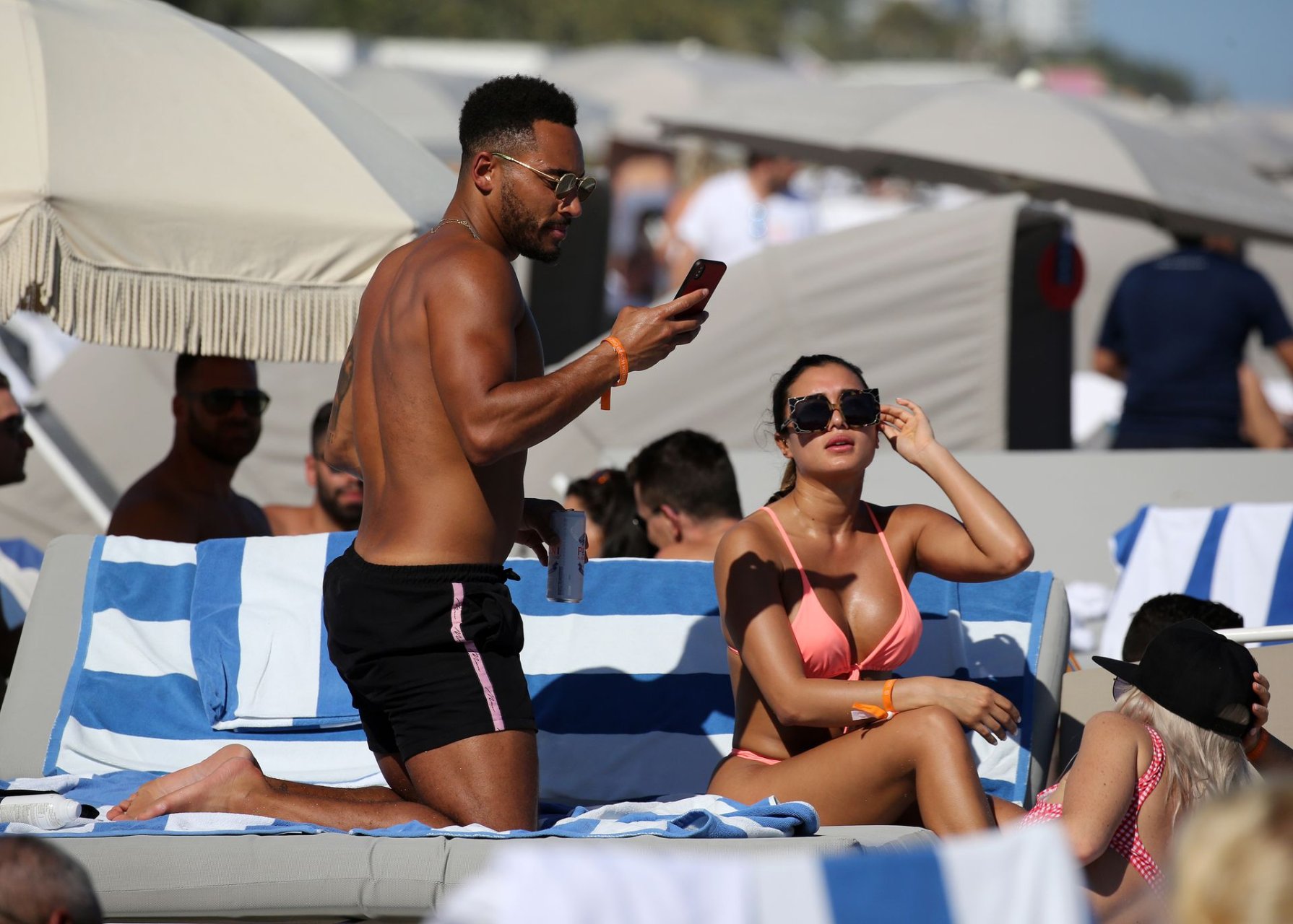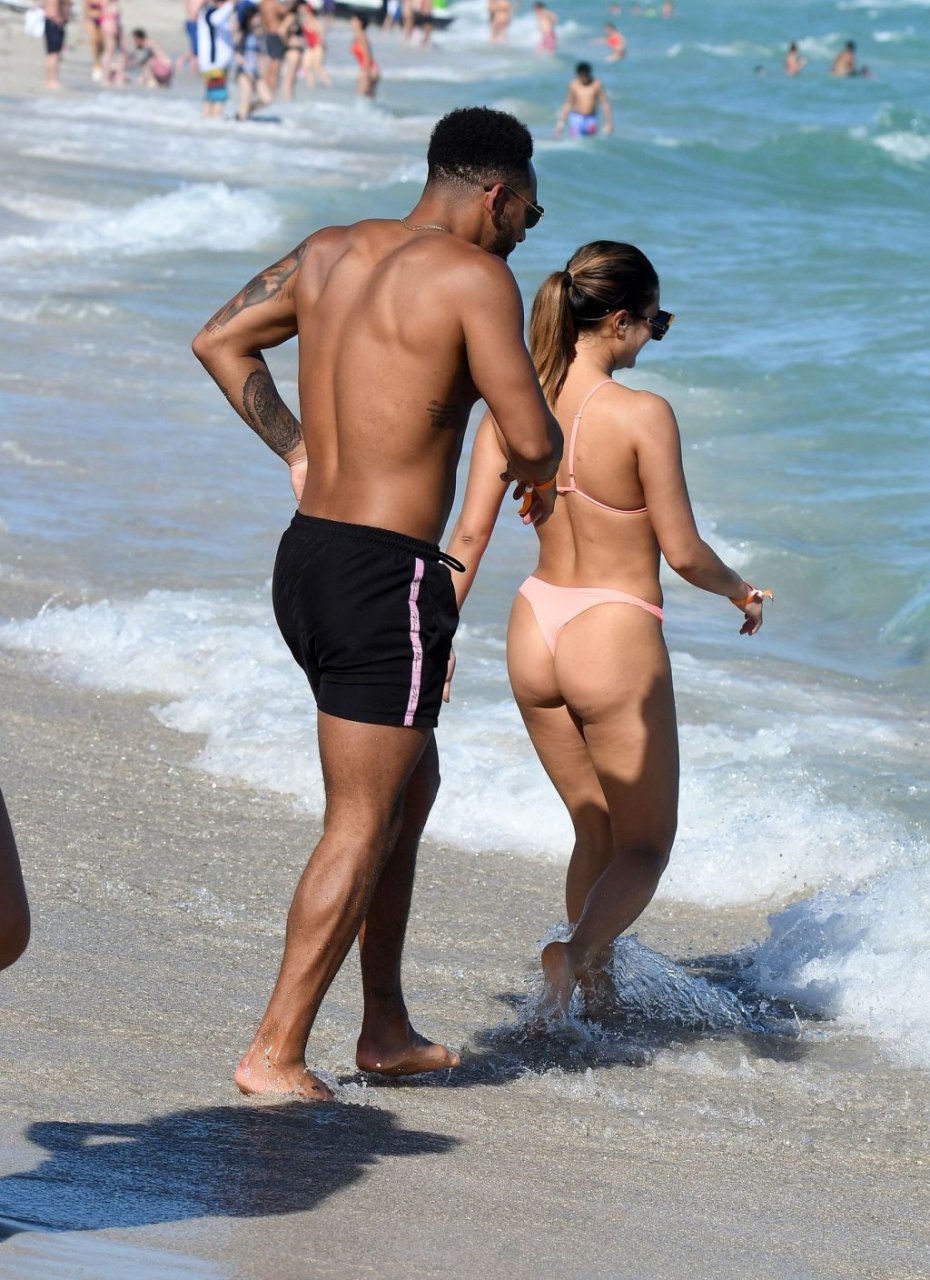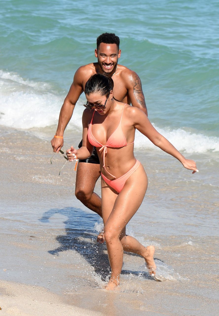 Kazimir “Kaz” Crossley de Love Island porte un bikini pêche alors qu’elle se rend à la plage avec son petit ami Josh Denzel à Miami, 01/02/2019.