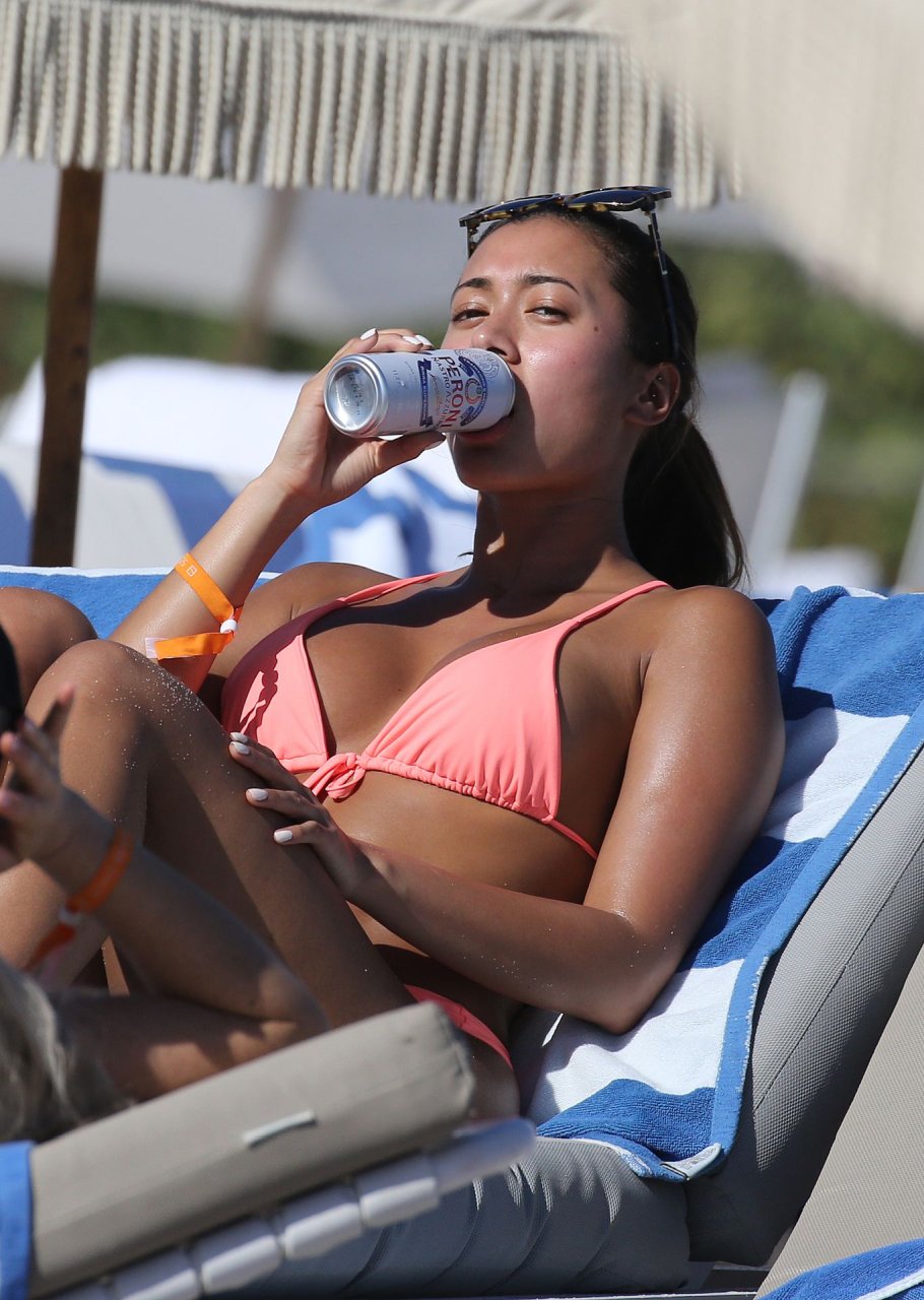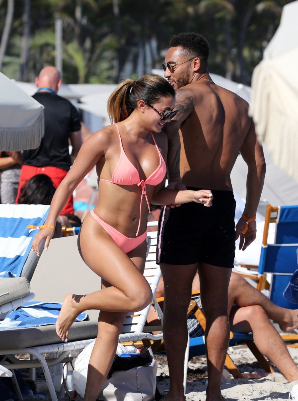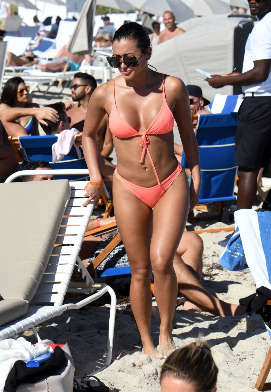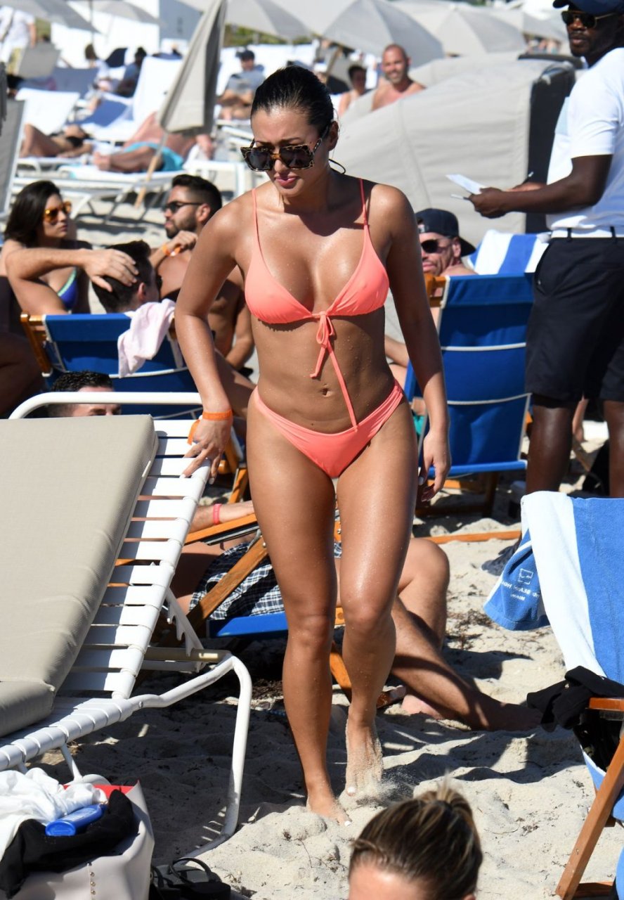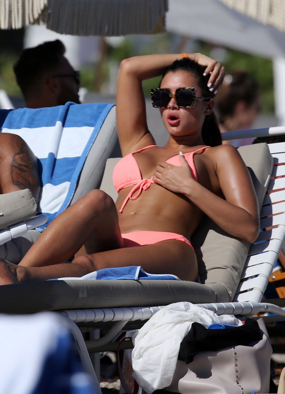 Kazimir “Kaz” Crossley de Love Island porte un bikini pêche alors qu’elle se rend à la plage avec son petit ami Josh Denzel à Miami, 01/02/2019.