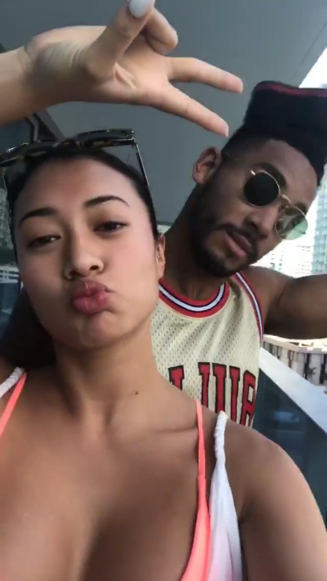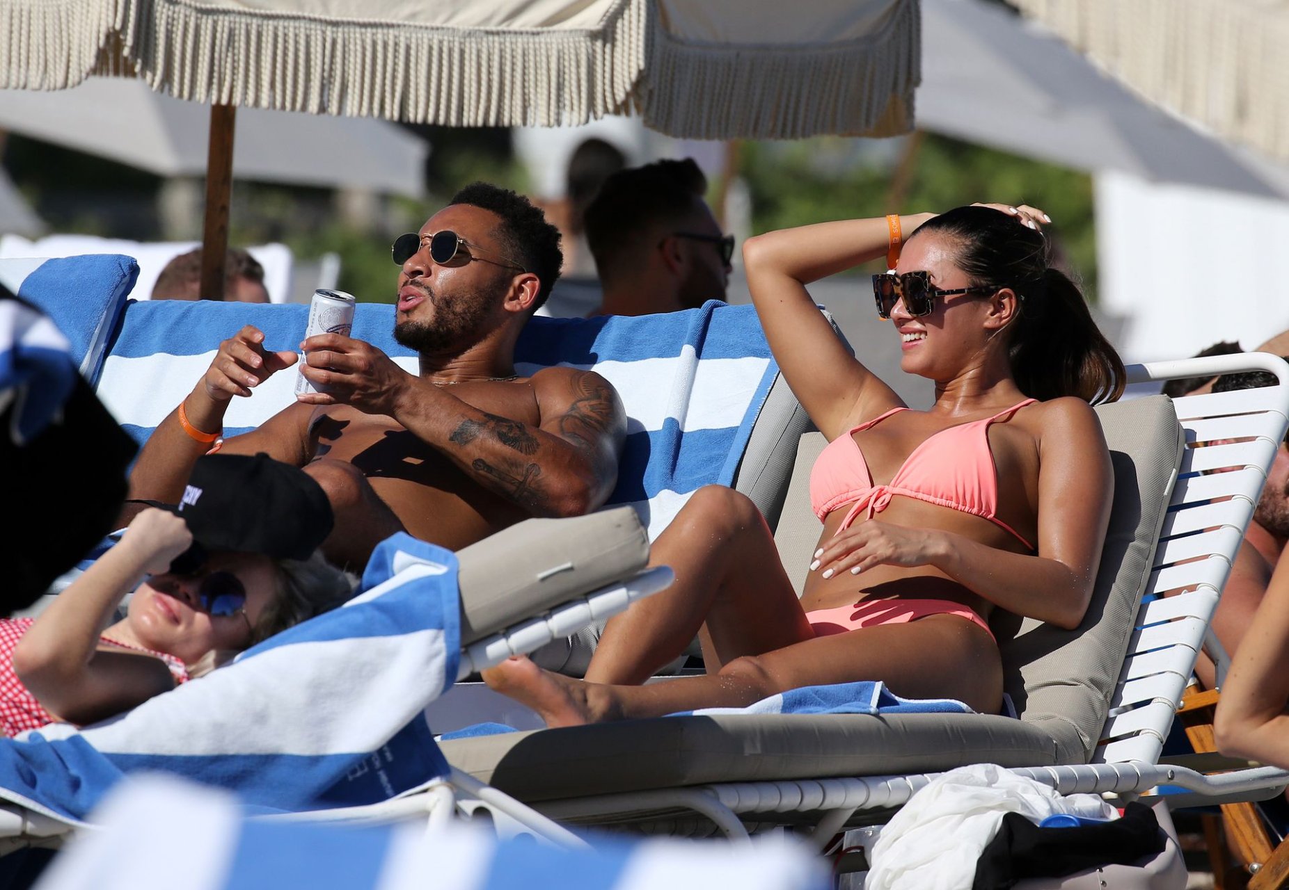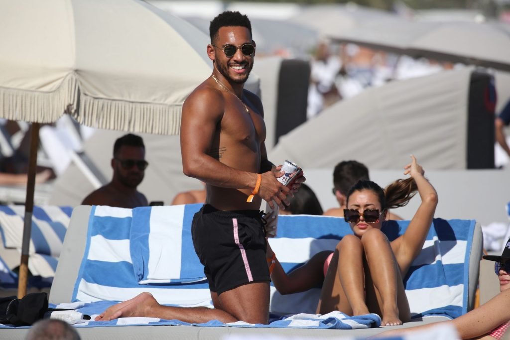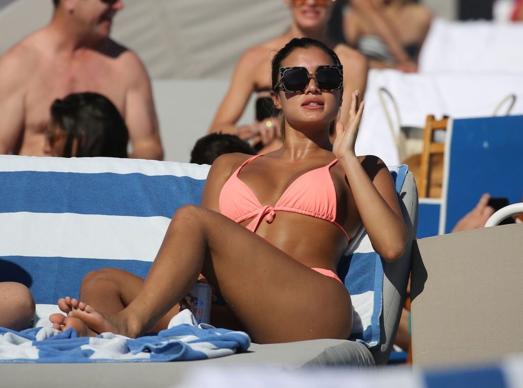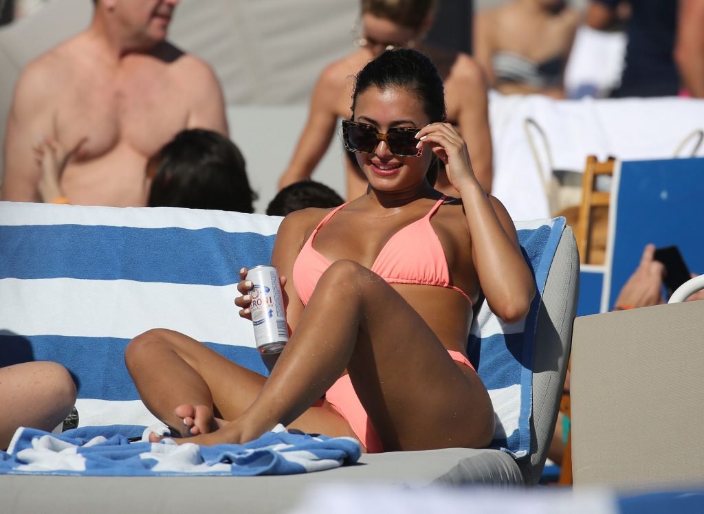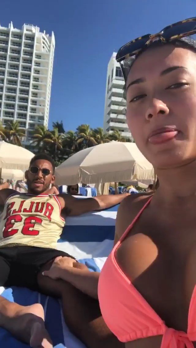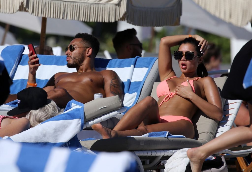 Kazimir “Kaz” Crossley de Love Island porte un bikini pêche alors qu’elle se rend à la plage avec son petit ami Josh Denzel à Miami, 01/02/2019.