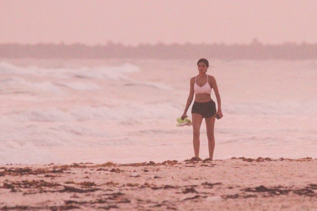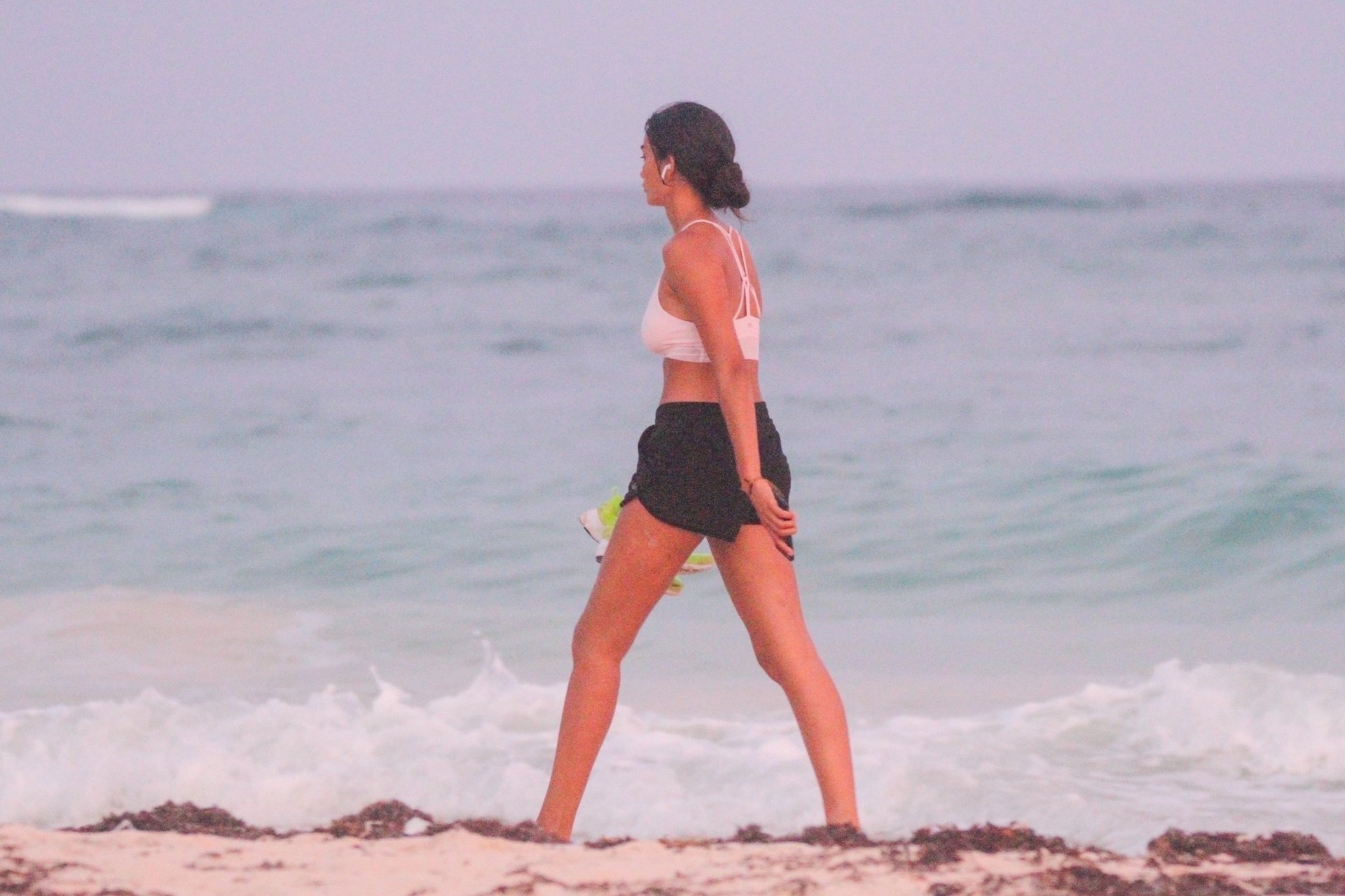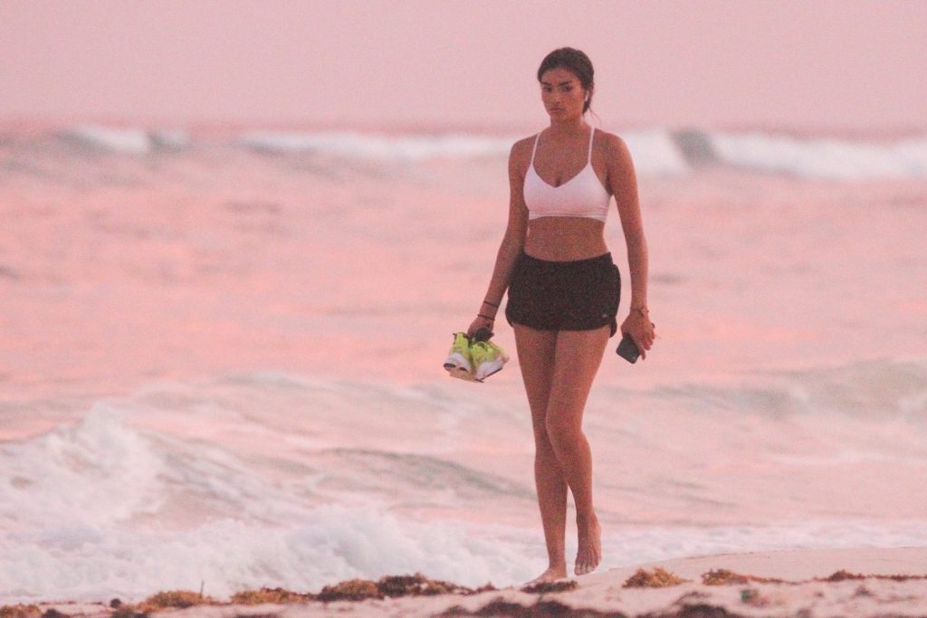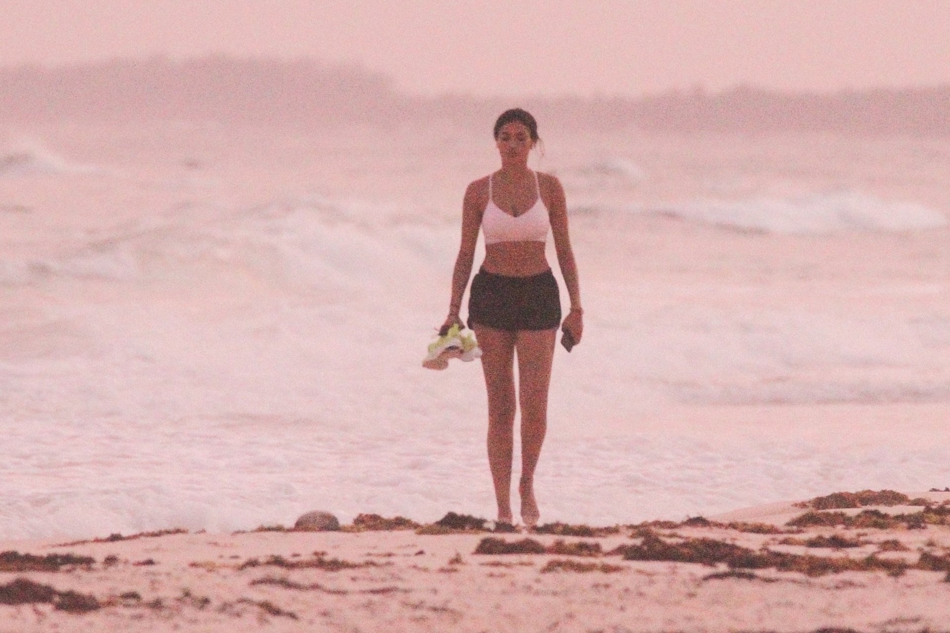 Le mannequin de Victoria’s Secret Kelly Gale fait une promenade relaxante en solo sur la plage à Tulum, au Mexique, le 13/12/2019. Le mannequin suédo-australien porte ses chaussures en marchant dans le sable après un jogging du soir pendant ses vacances au sud de la frontière.