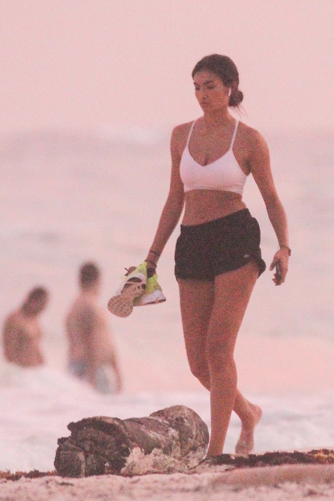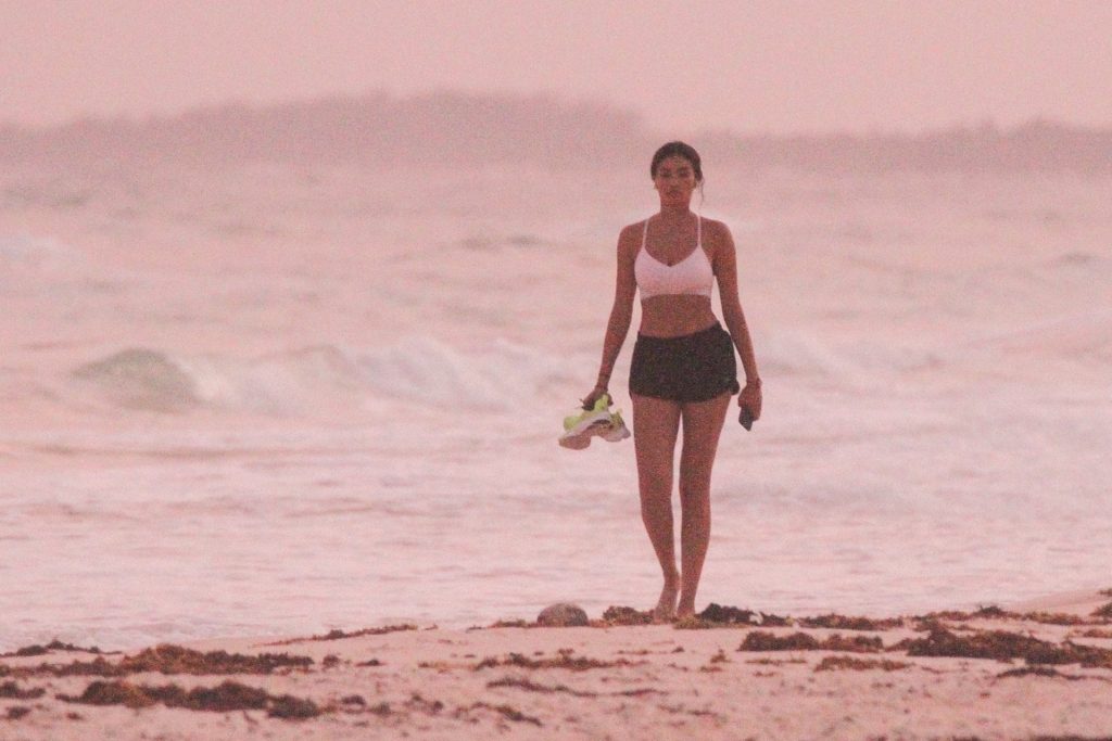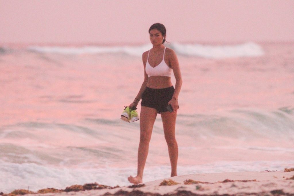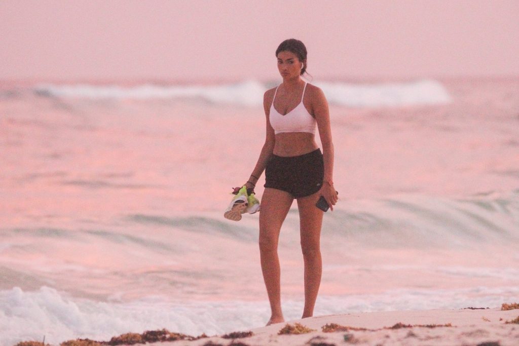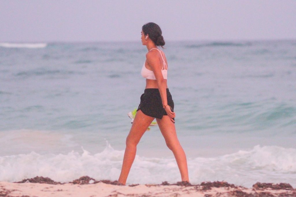 Le mannequin de Victoria’s Secret Kelly Gale fait une promenade relaxante en solo sur la plage à Tulum, au Mexique, le 13/12/2019. Le mannequin suédo-australien porte ses chaussures en marchant dans le sable après un jogging du soir pendant ses vacances au sud de la frontière.