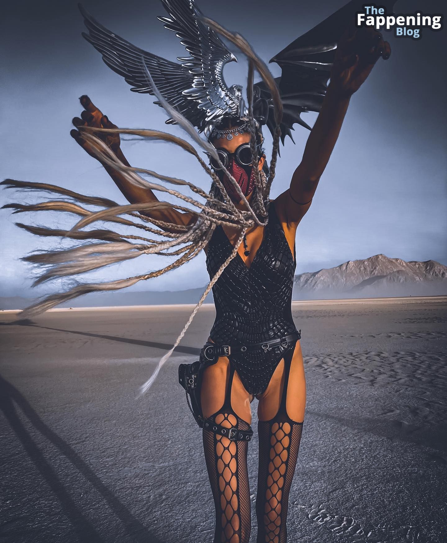 Six photos ont été prises sur le fond épique des sculptures et installations de Burning Man, leur insufflant cette énergie spéciale et cette ambiance de liberté. Le visage et le corps de Kelly sont baignés par les rayons dorés du coucher de soleil, amplifiant sa beauté naturelle et son éclat. Les autocollants en forme d’étoiles sur sa poitrine reflètent la lumière, créant un effet visuel hypnotisant. Et en arrière-plan, vous pouvez apercevoir des œuvres d’art complexes et les silhouettes d’autres festivaliers, ajoutant cette vitalité et ce dynamisme supplémentaires à ces images captivantes.
