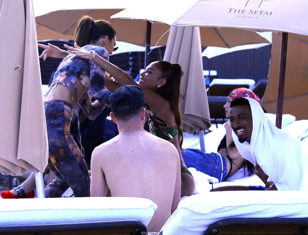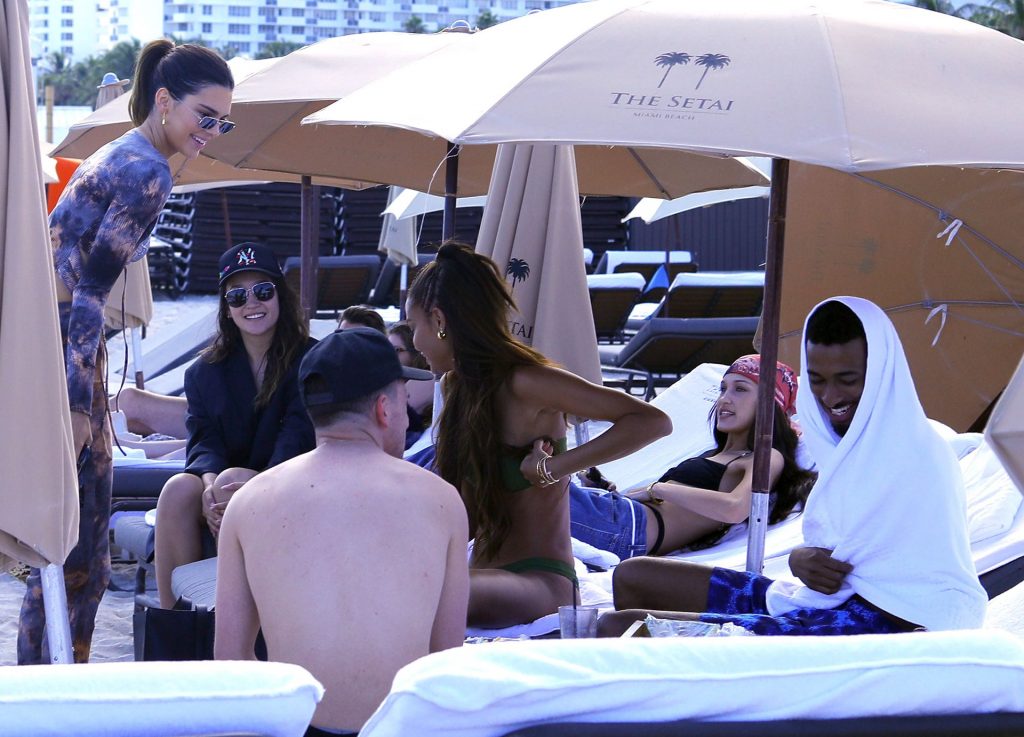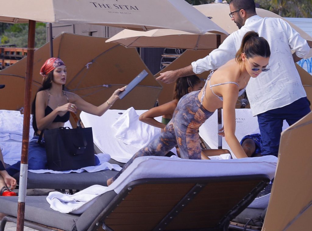 Kendall Jenner est assise sur Bella Hadid alors qu’elles profitent d’une journée à la plage ensemble pendant Art Basel à Miami, montrant leurs silhouettes toniques en bikini, 12/04/2019.