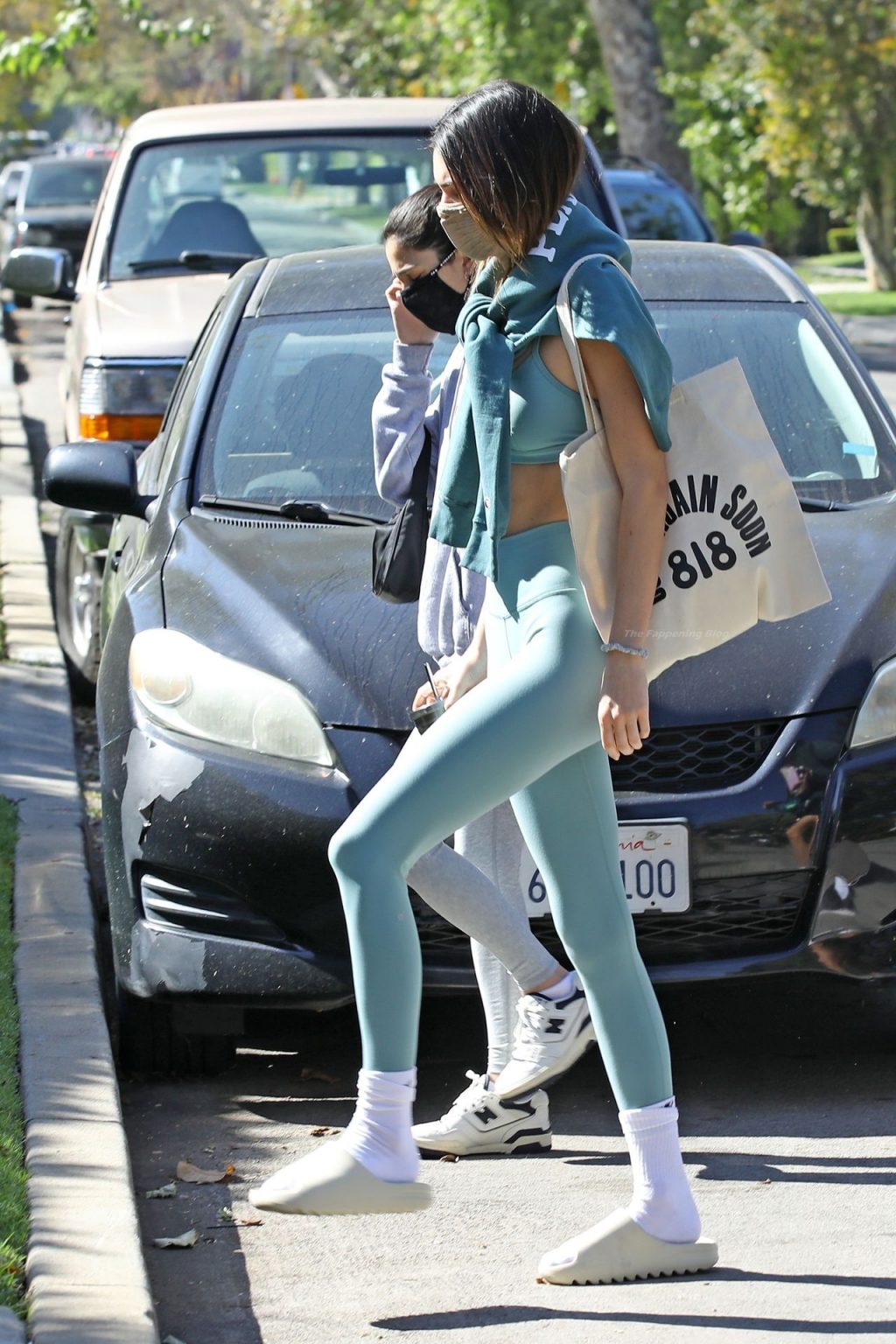 Le mannequin Kendall Jenner est vue portant des Yeezy Slides ‘Bone’ et une tenue d’entraînement colorée, quittant son cours de Pilates matinal à West Hollywood, 27/03/2021.