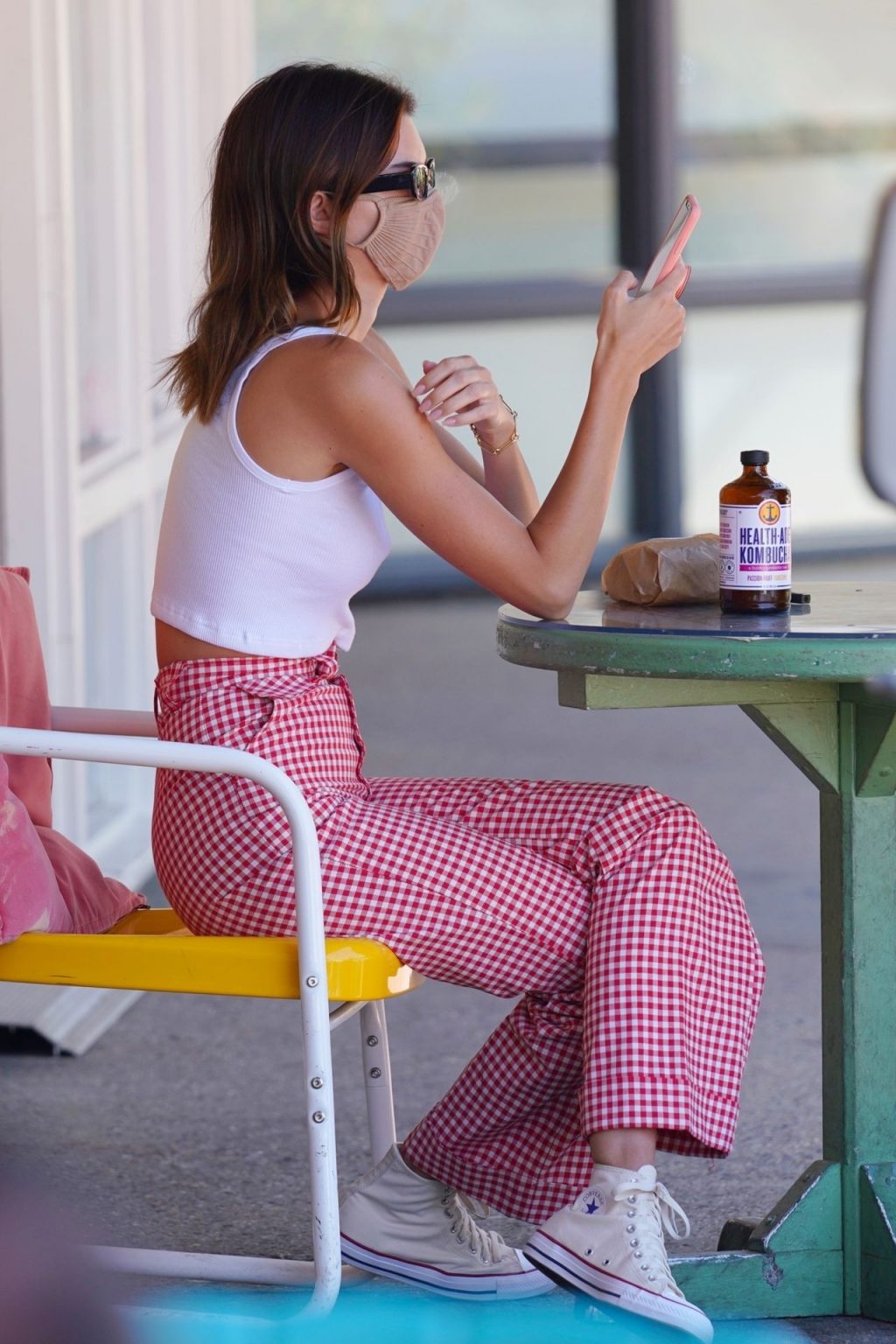La jeune top-modèle Kendall Jenner affiche un style estival chic dans son pantalon à carreaux vichy rouge et son haut blanc à fines bretelles alors qu’elle est aperçue en train de faire du shopping et de déjeuner à Malibu avec une amie, le 29/07/2020.