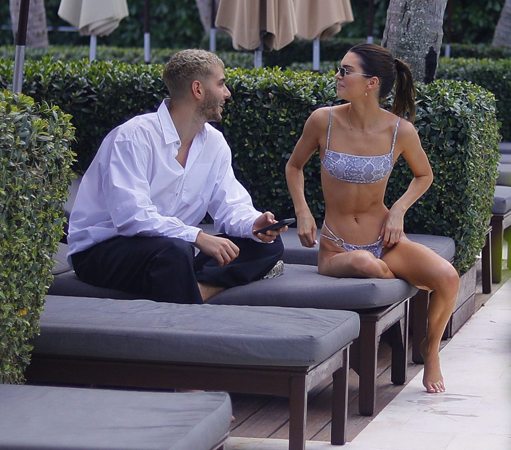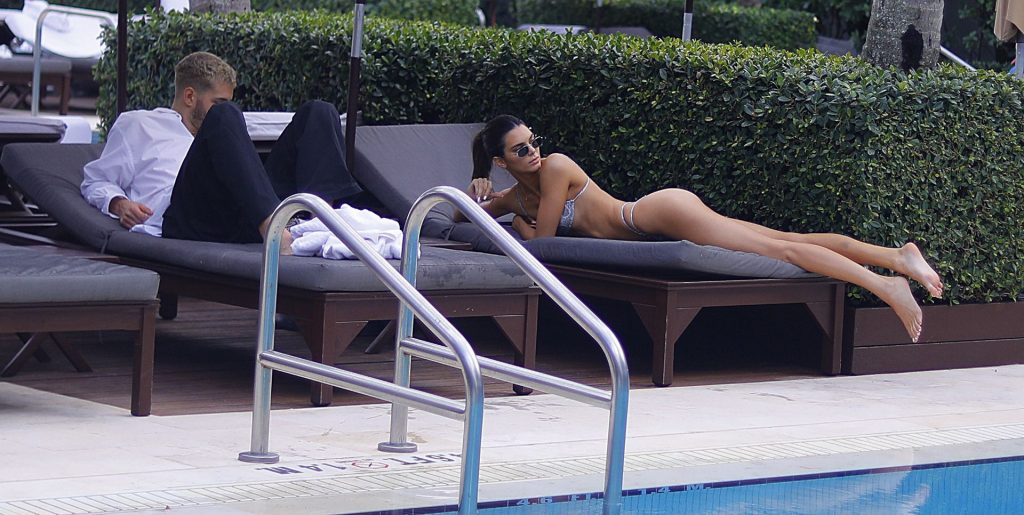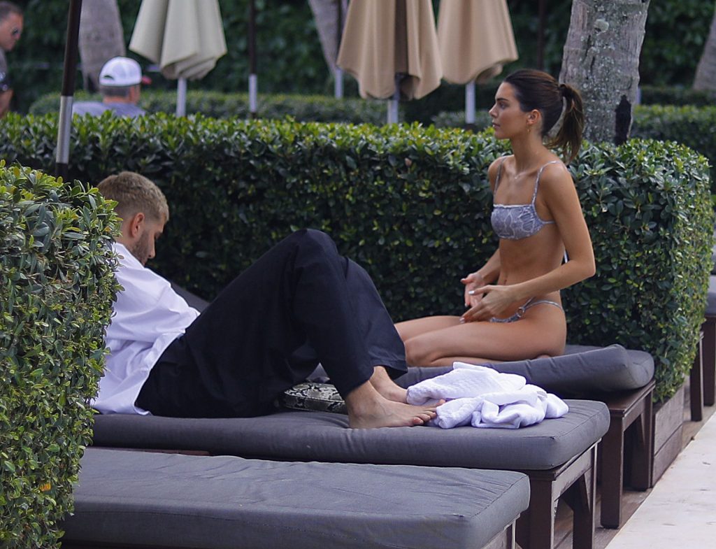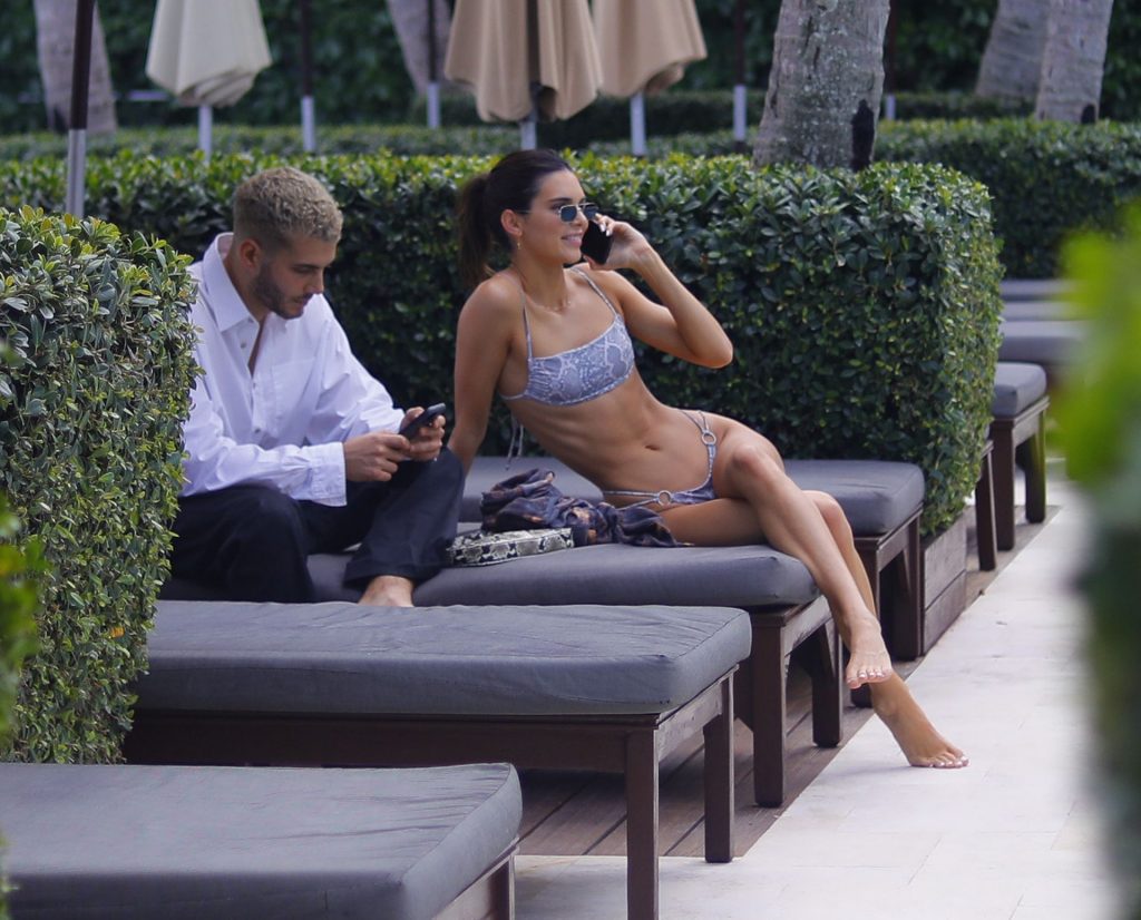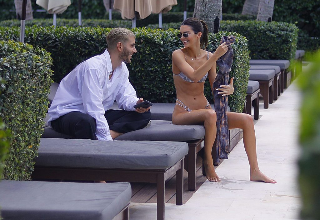 Le mannequin Kendall Jenner porte un bikini très échancré alors qu’elle se détend au bord de la piscine avec le mannequin Fai Khadra à Miami, 12/04/2019.