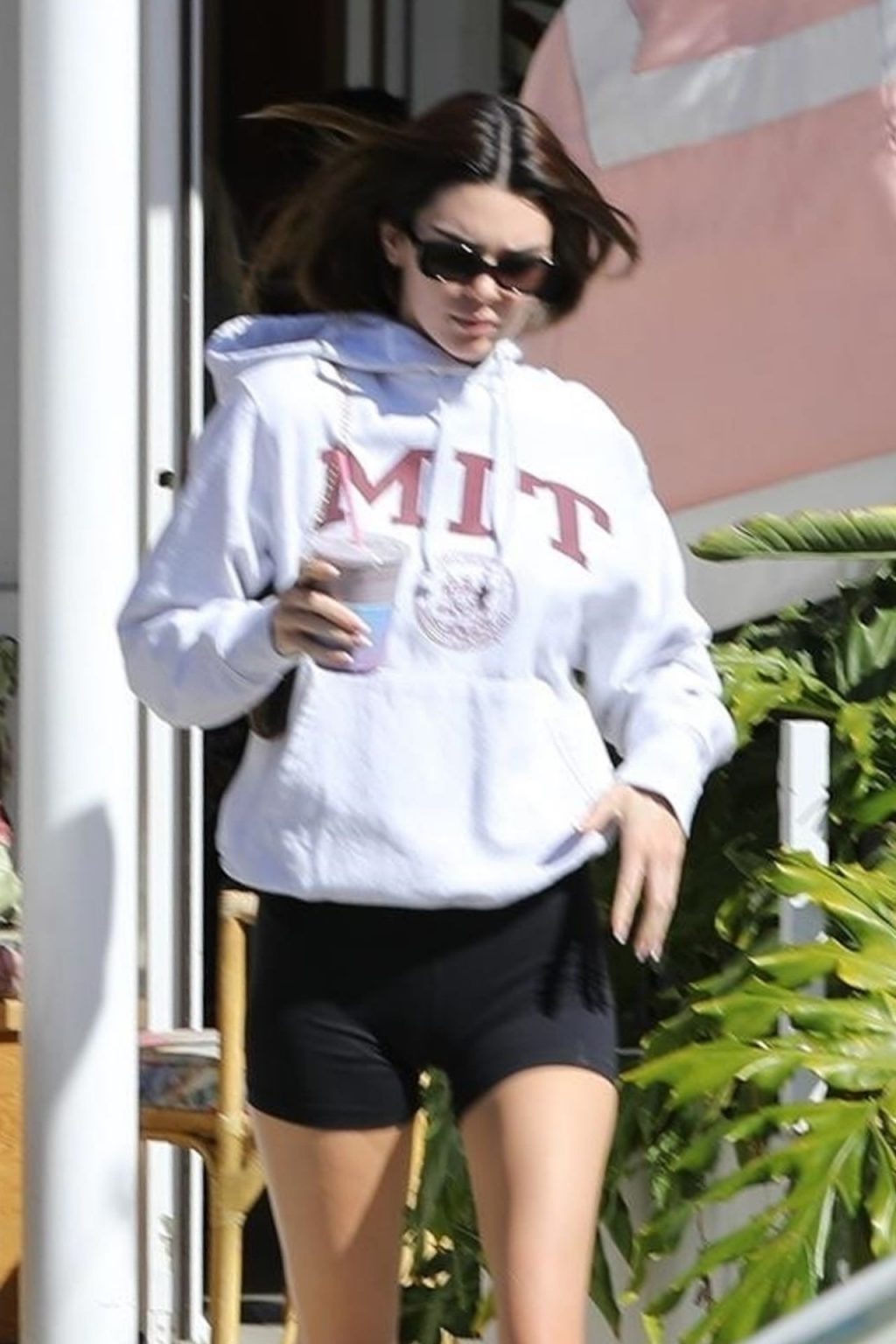 Kendall Jenner, portant un sweat MIT, affiche un large sourire en sortant de Cha Cha Matcha à West Hollywood, 03/02/2020. Le supermodel laisse voler ses nouvelles mèches de cheveux alors qu’elle retourne à sa voiture avec sa boisson en main.